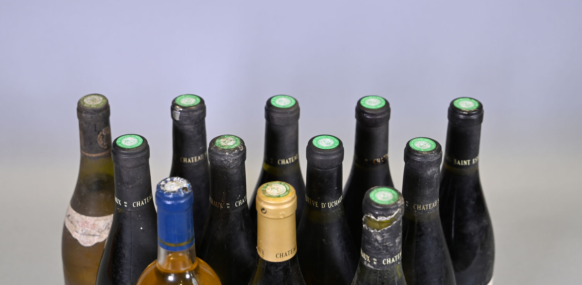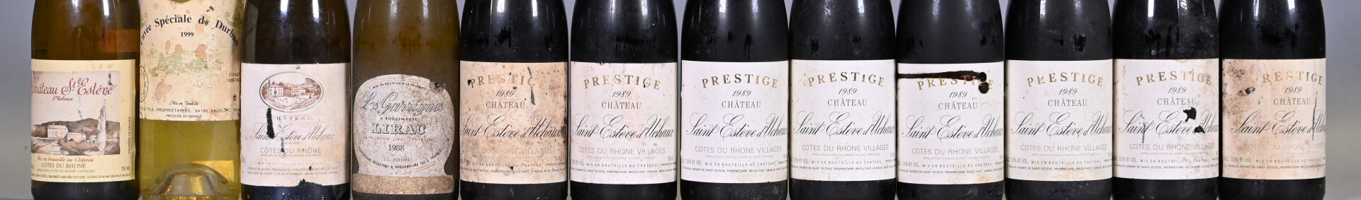 8 bouteilles, Côtes du Rhône Villages, Château Saint Estève d’Uchaux, Prestige, 1989. En l’état.