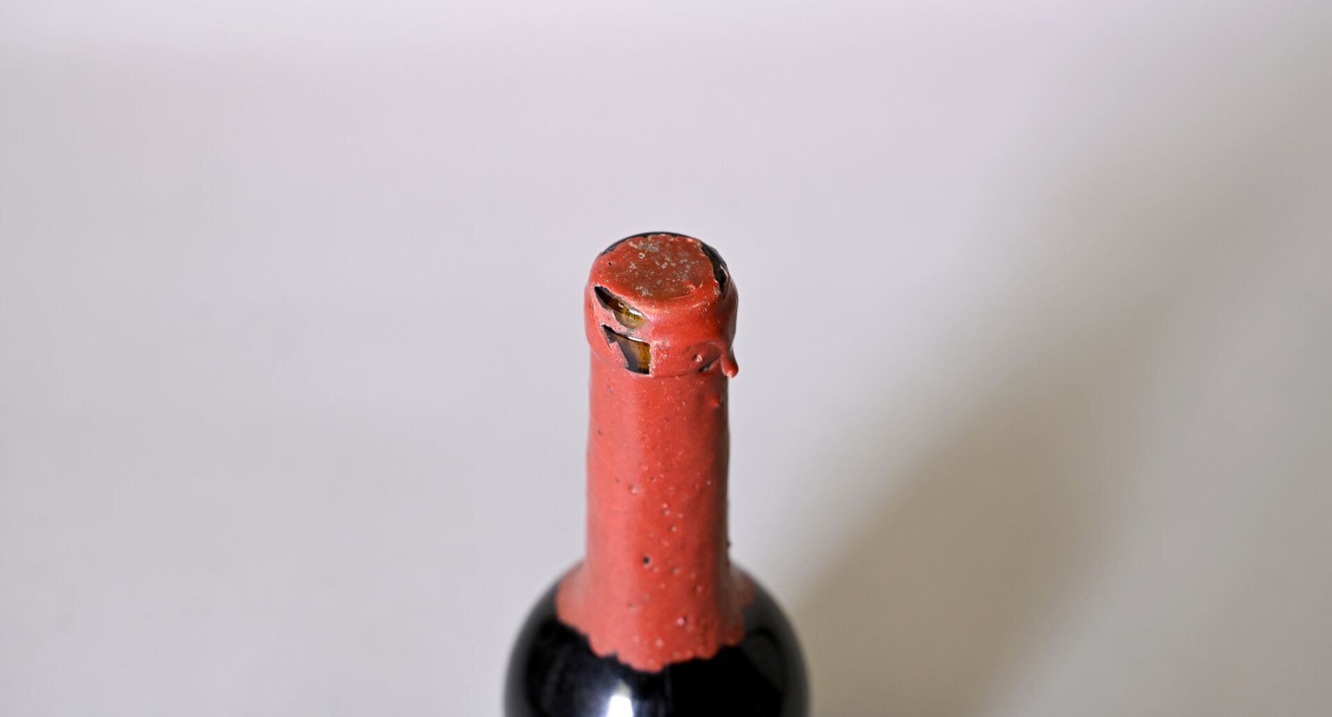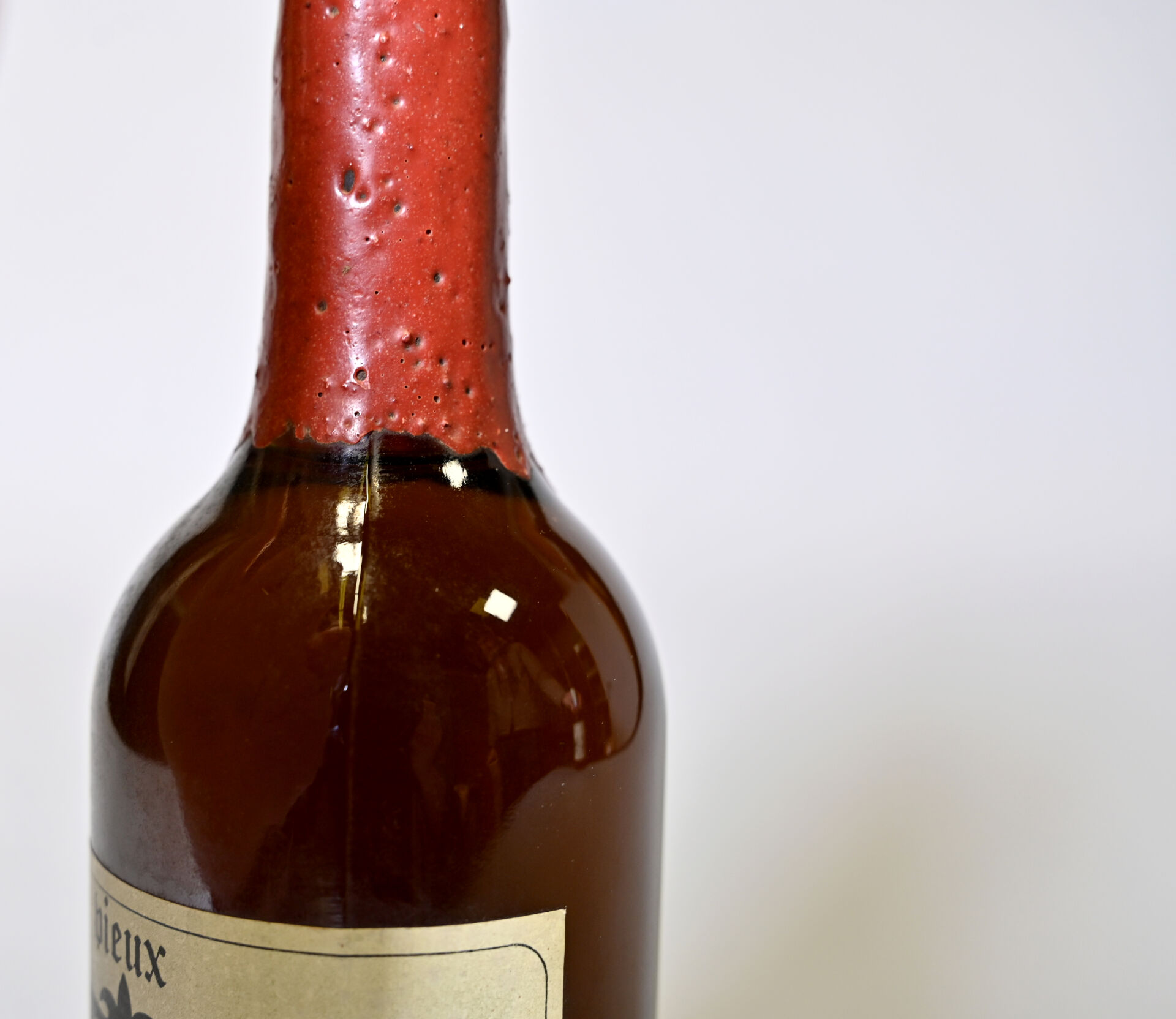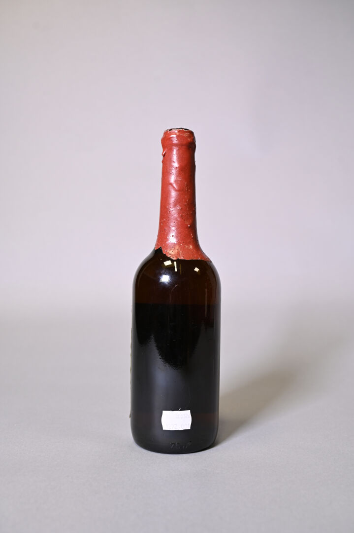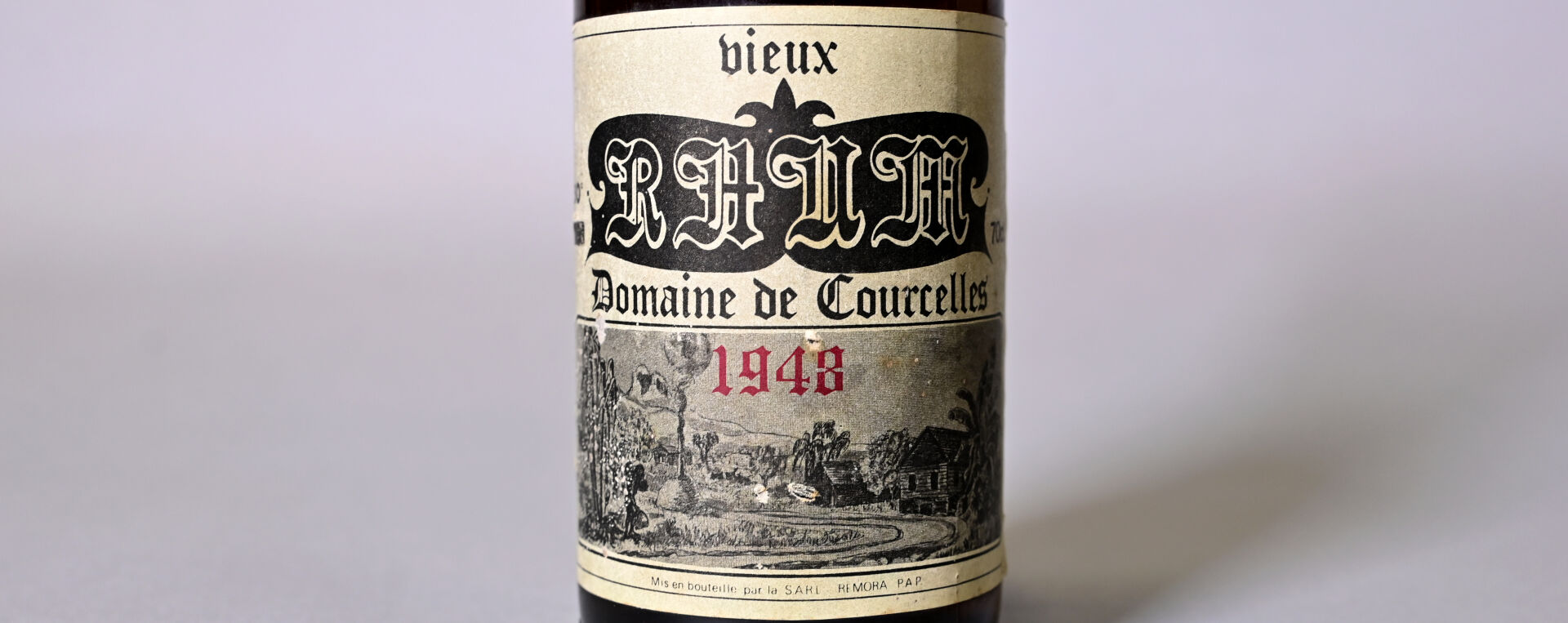 RHUM – 1 bouteille, Vieux Rhum, Domaine de Courcelles, 1948. Capsule en cire légèrement sale, abimée avec des éclats et des manques. Étiquette légèrement sale et abimée.