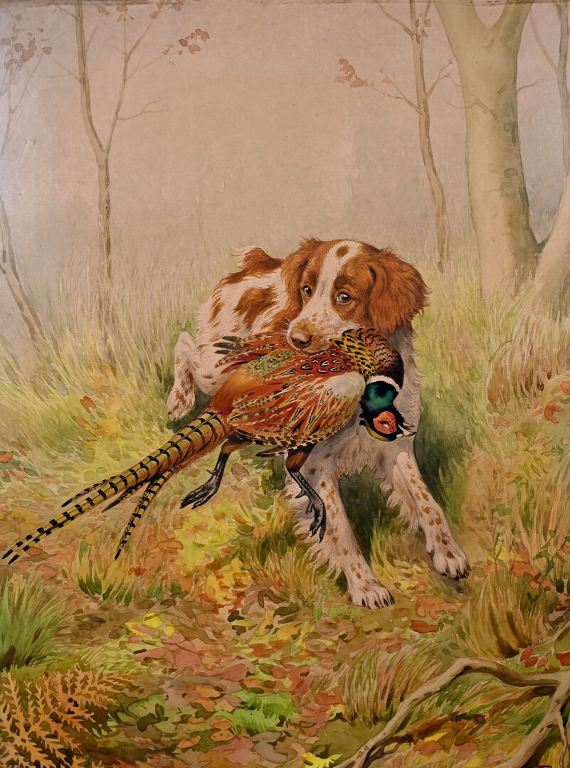 RIAB (Boris RIABOUCHINSKY),(1898/MOSCOU-1975/PARIS ). Epagneul breton tenant un faisan dans sa gueule. Dessin à l’aquarelle signé en bas à droite. 45,5 x 33 cm à vue.