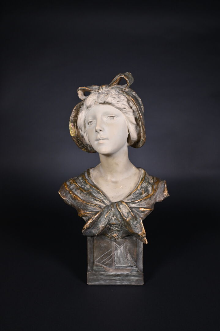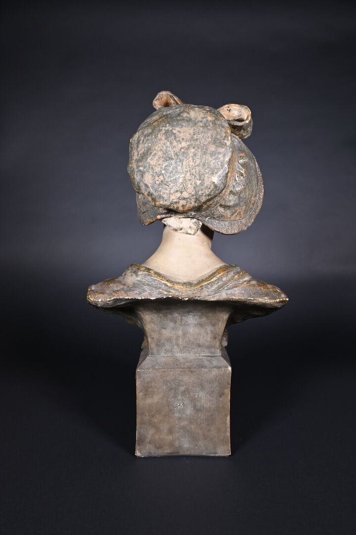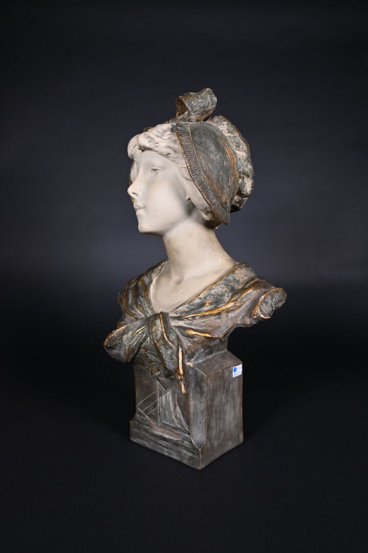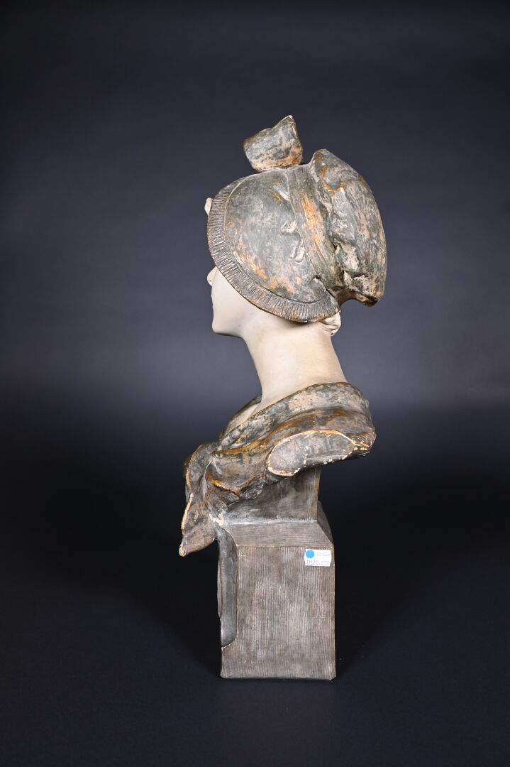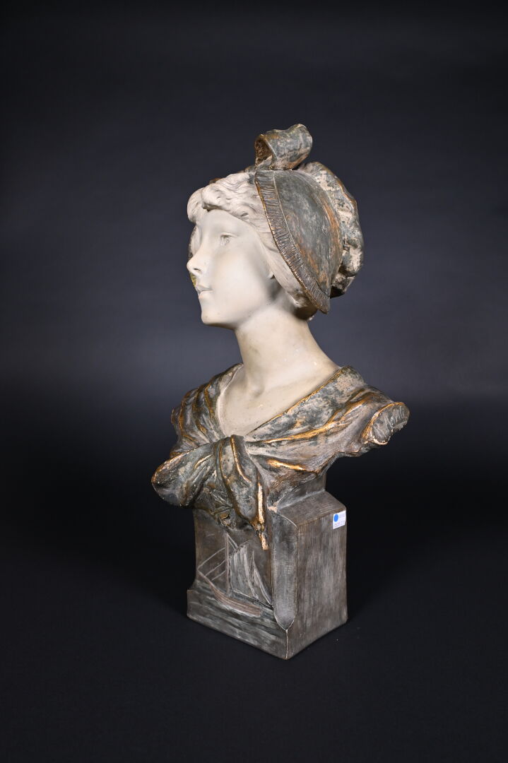 Richard AURILI (1864-1943). Buste en terre cuite polychrome représentant une femme à la coiffe (petites usures). Signé. Haut. : 55 cm.