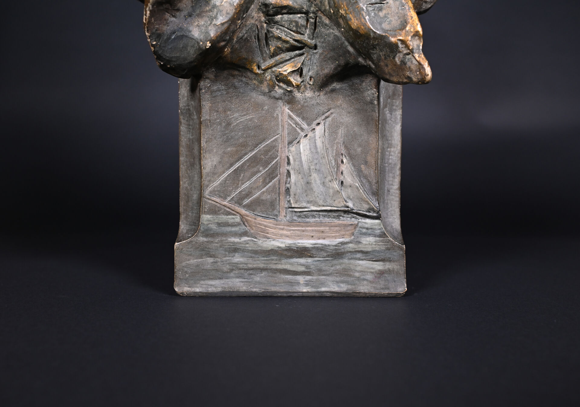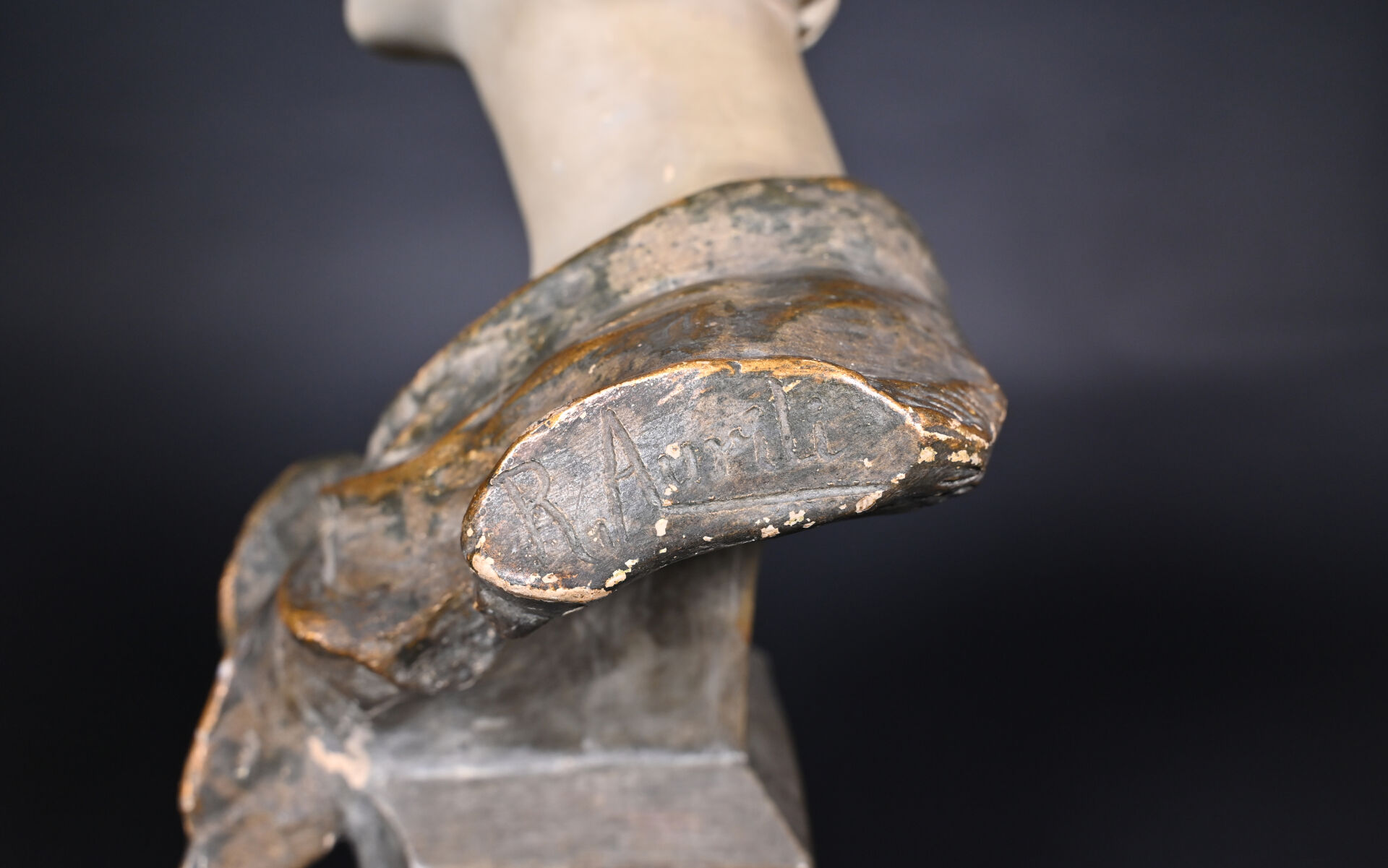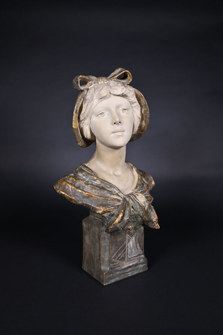 Richard AURILI (1864-1943). Buste en terre cuite polychrome représentant une femme à la coiffe (petites usures). Signé. Haut. : 55 cm.