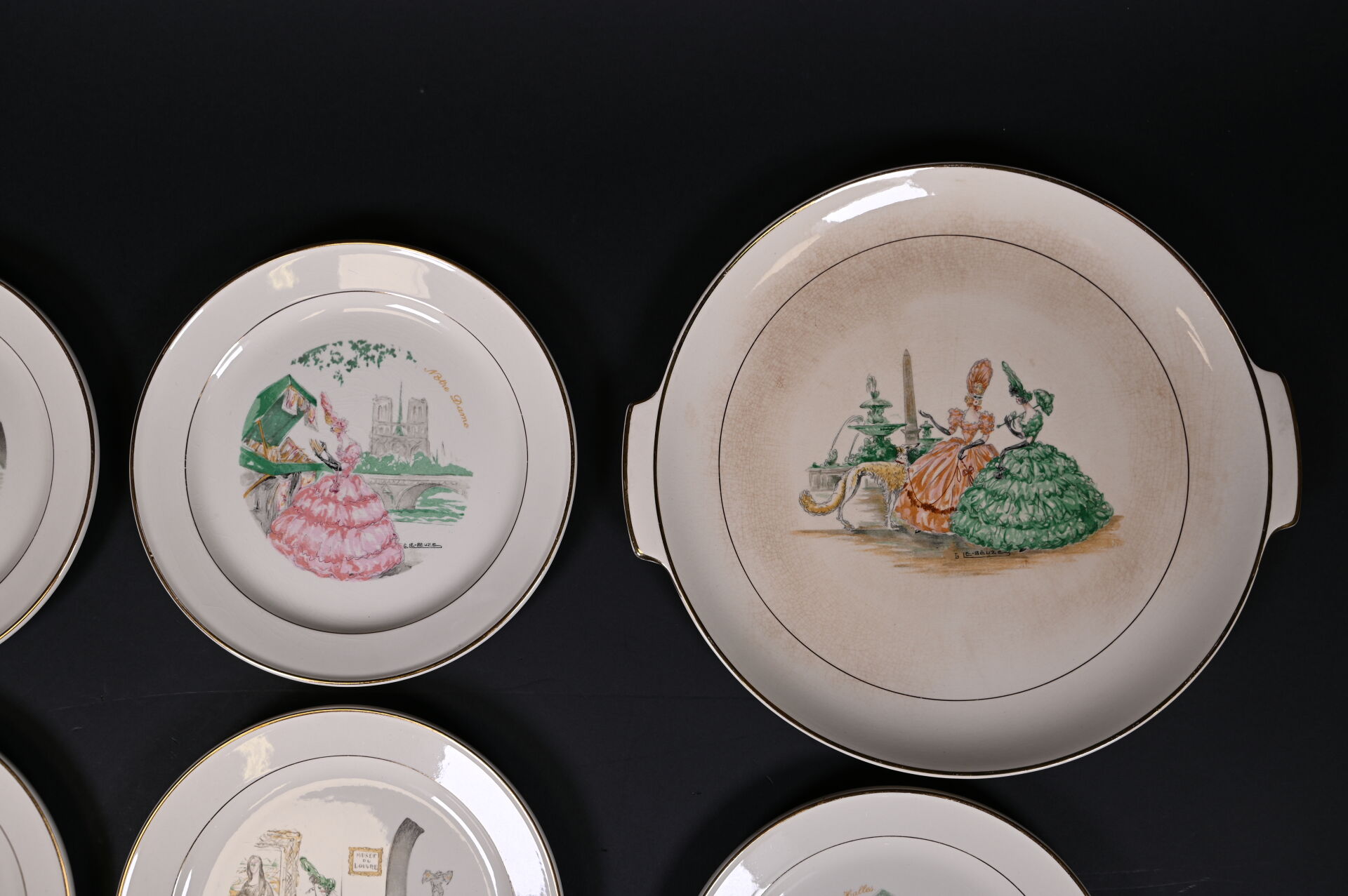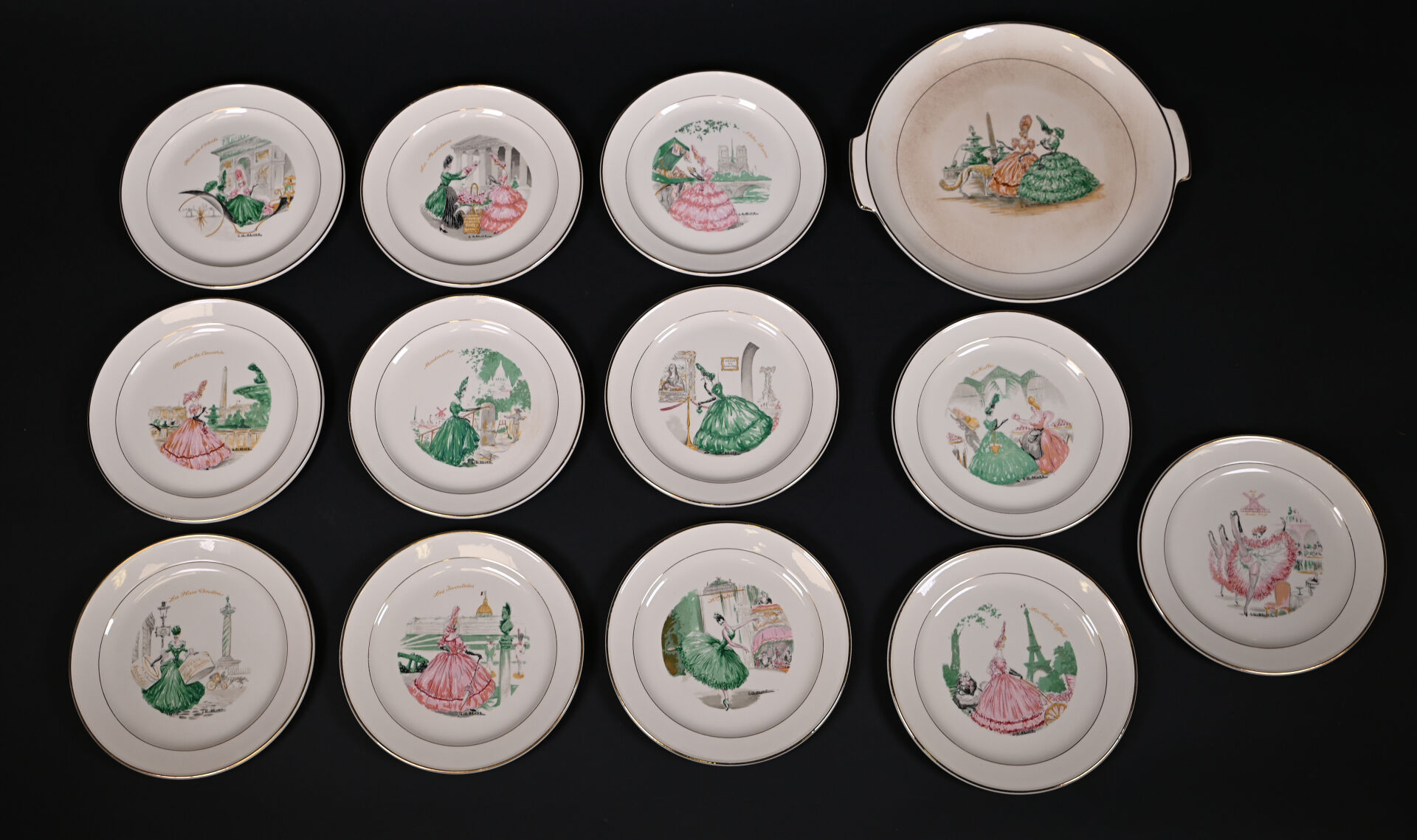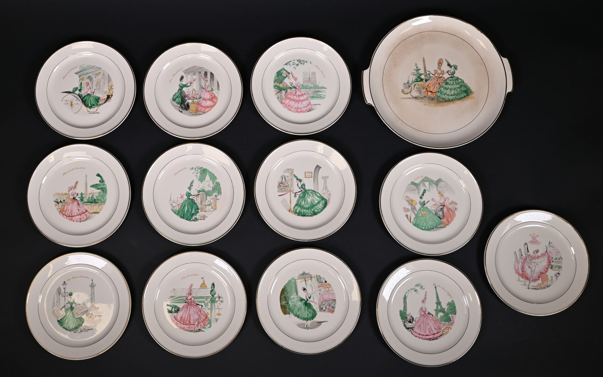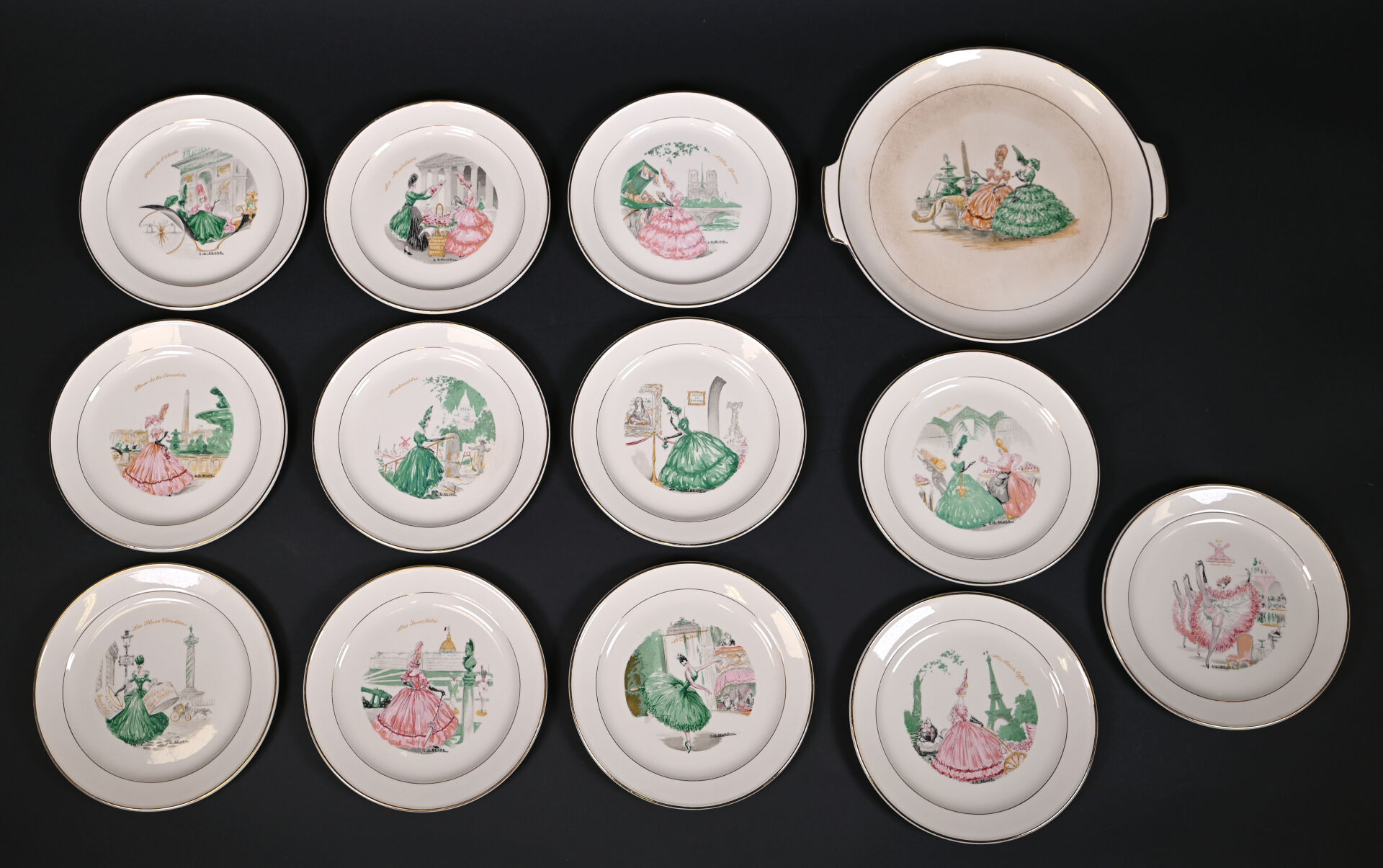 ROBJ – PARIS et VILLEROY & BOCH. Partie de service de table sur le thème de Paris et les parisiennes soit 12 assiettes et 1 plat de service à décor de Gaston Le Beuze. Marqués. Diam. du plat : 26 cm. Diam. des assiettes : 19 cm.