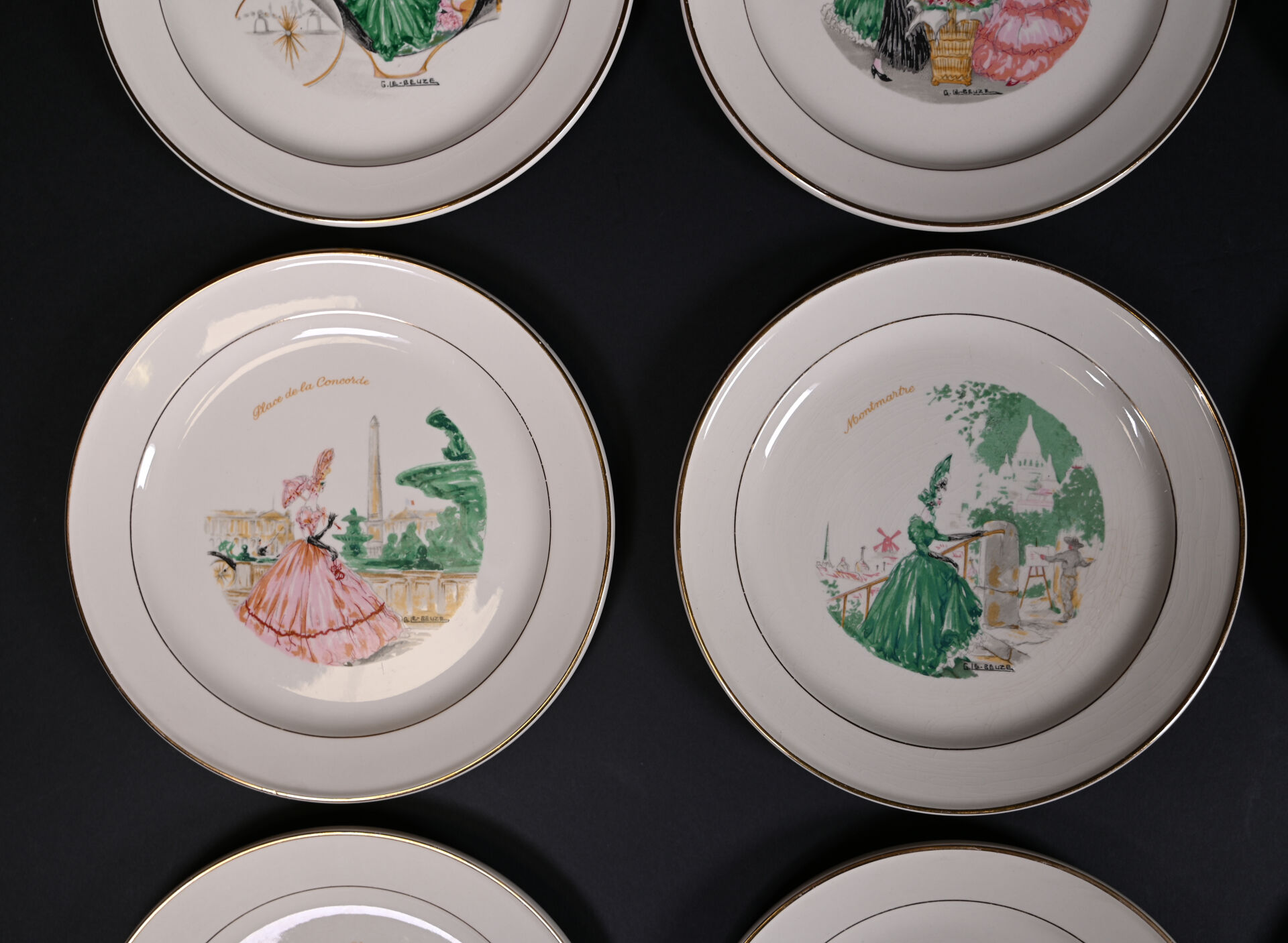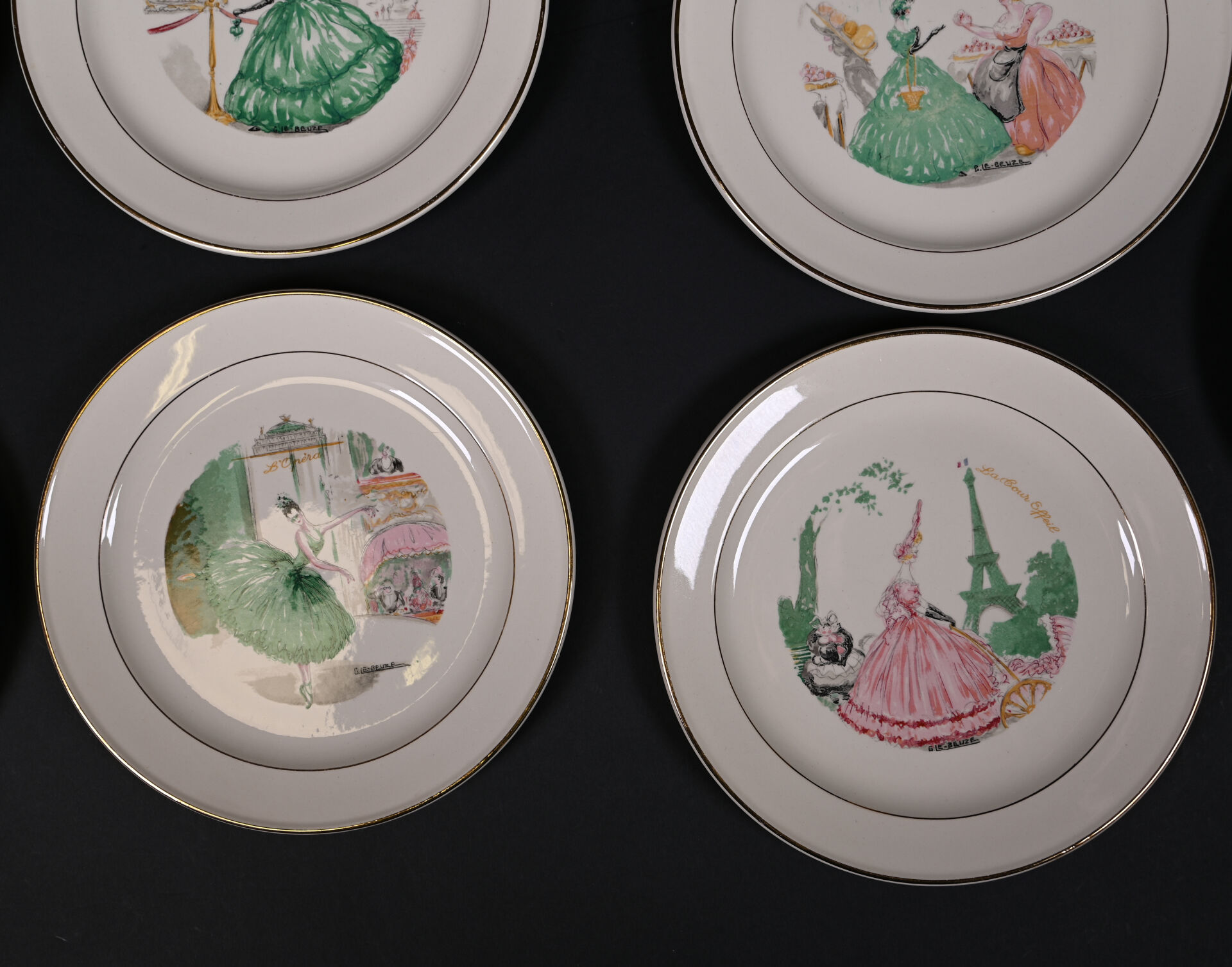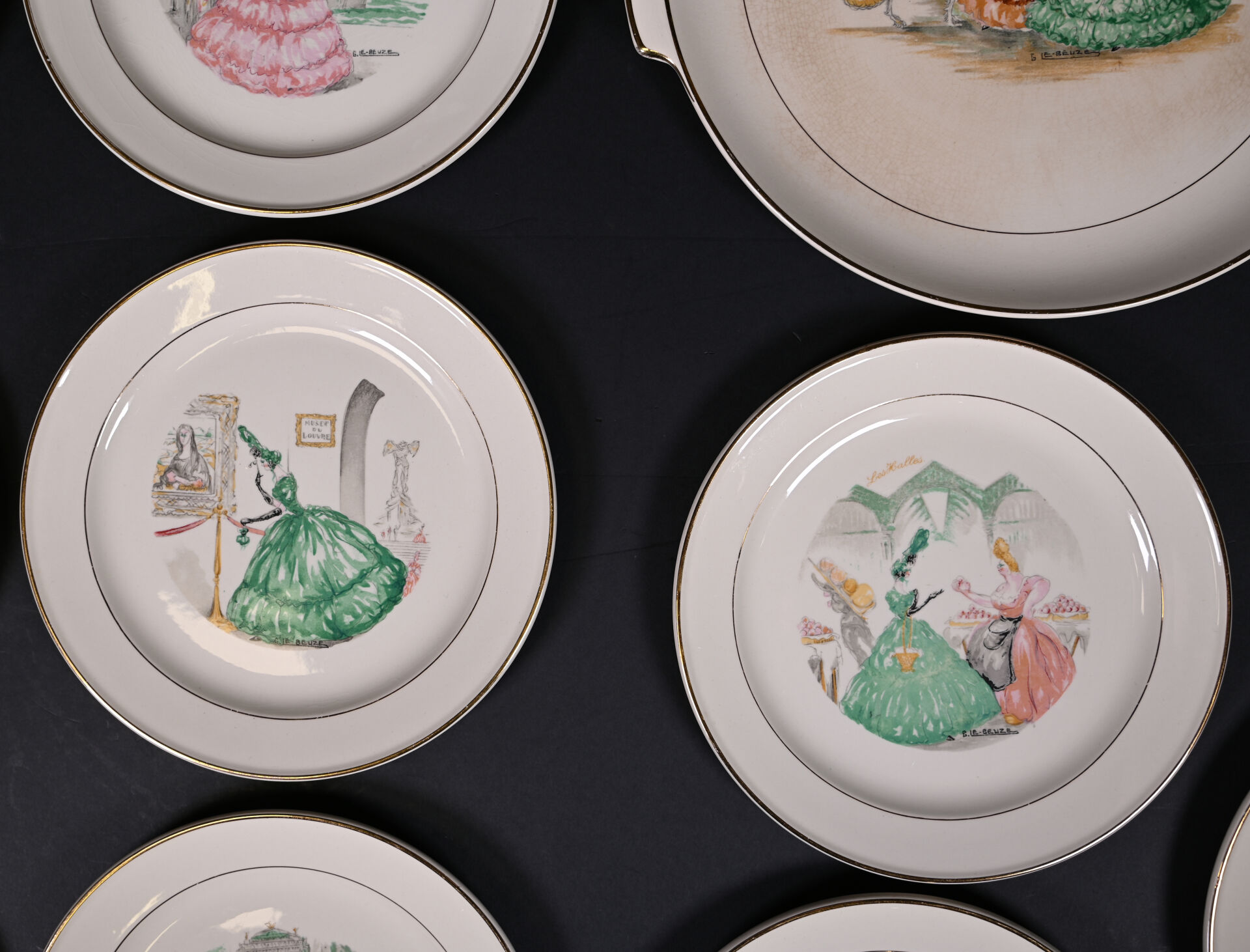 ROBJ – PARIS et VILLEROY & BOCH. Partie de service de table sur le thème de Paris et les parisiennes soit 12 assiettes et 1 plat de service à décor de Gaston Le Beuze. Marqués. Diam. du plat : 26 cm. Diam. des assiettes : 19 cm.