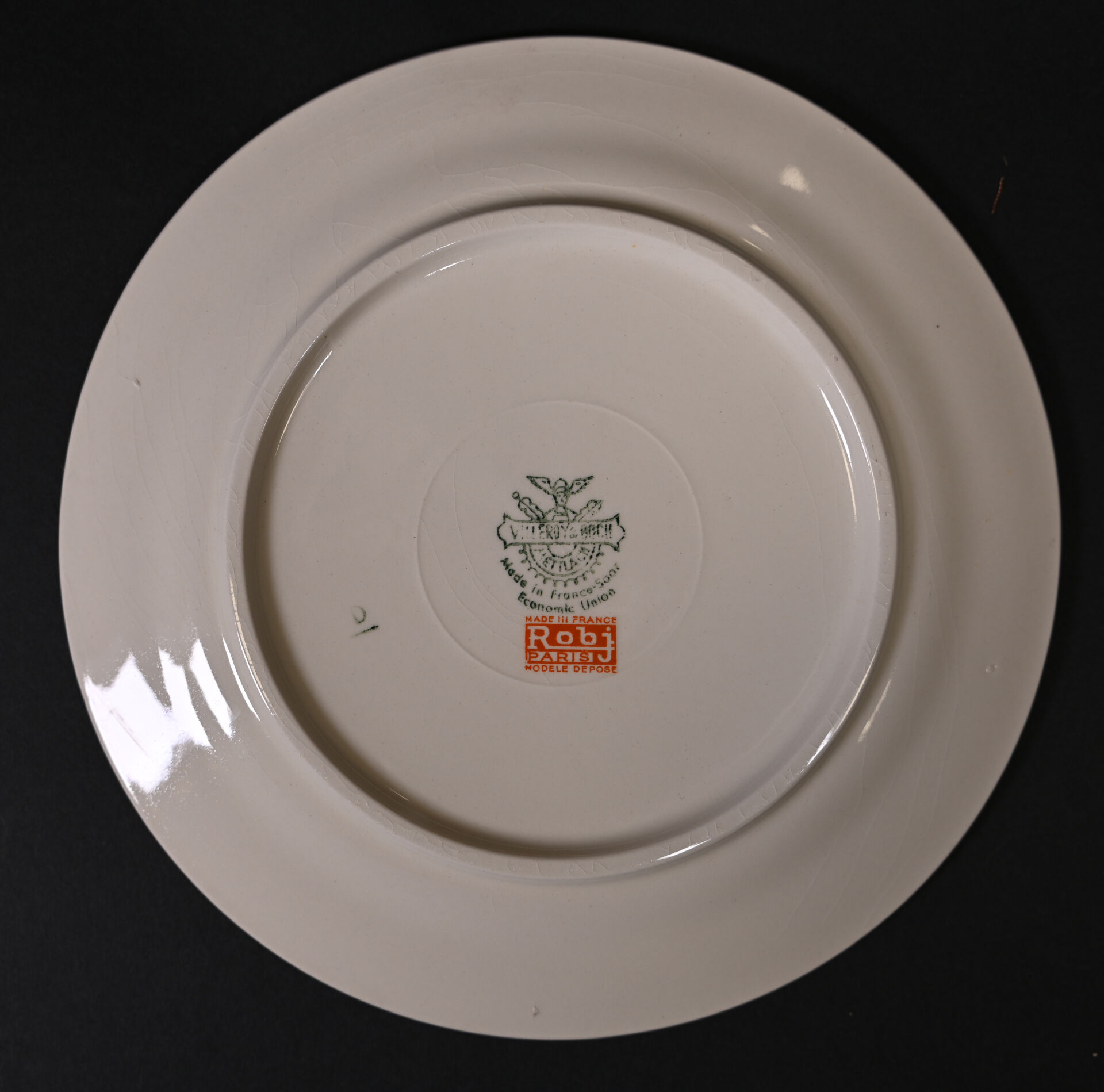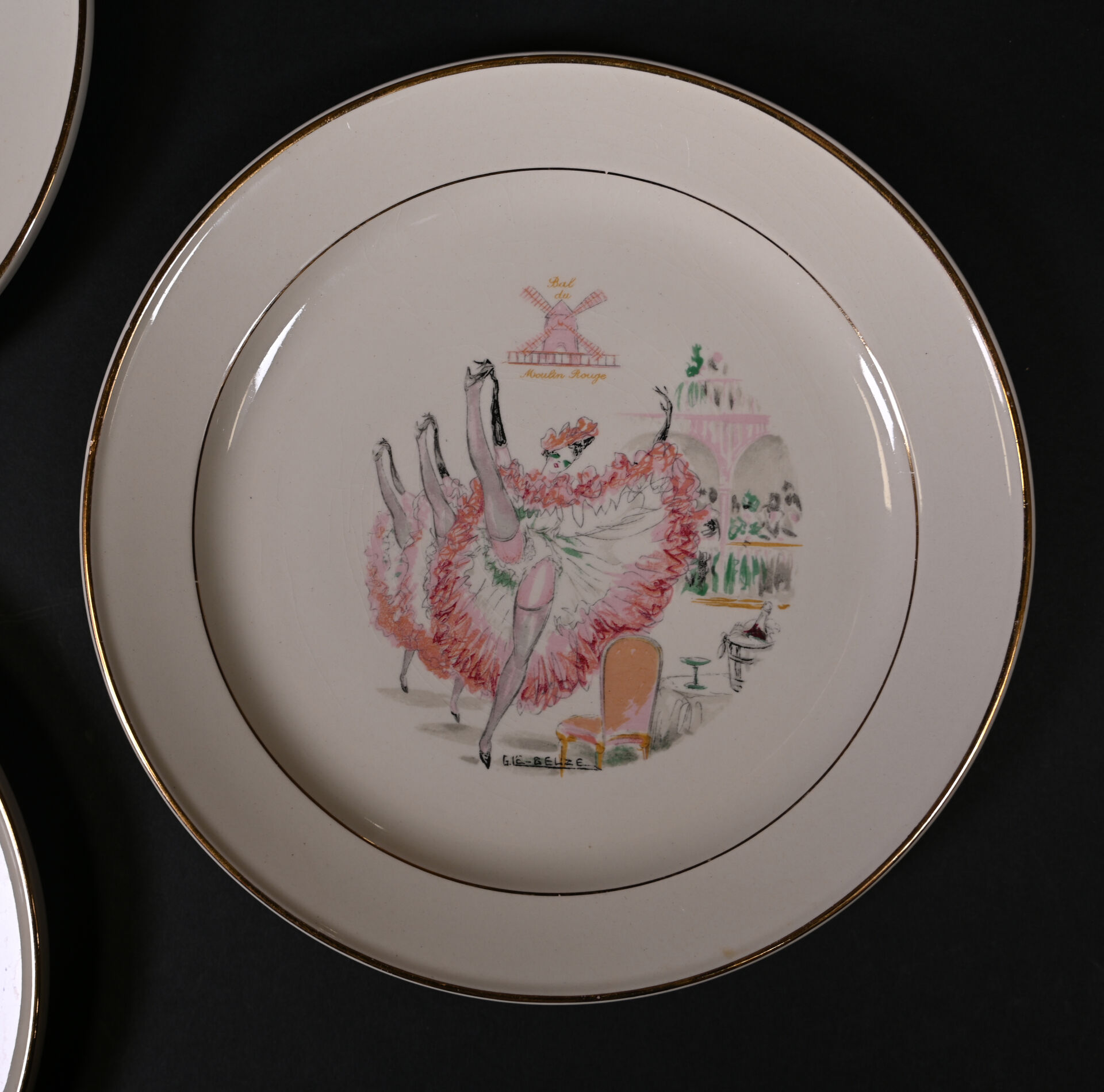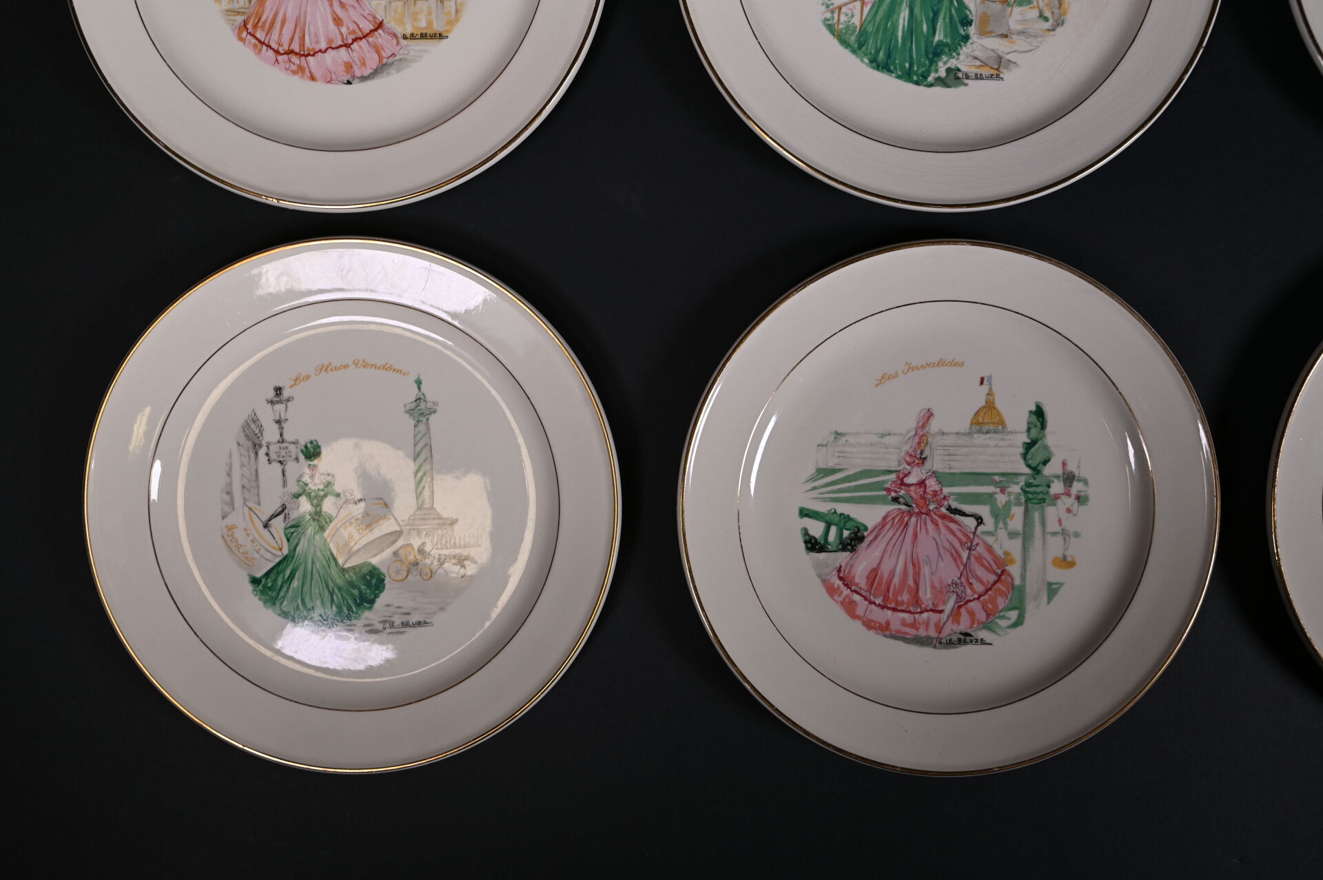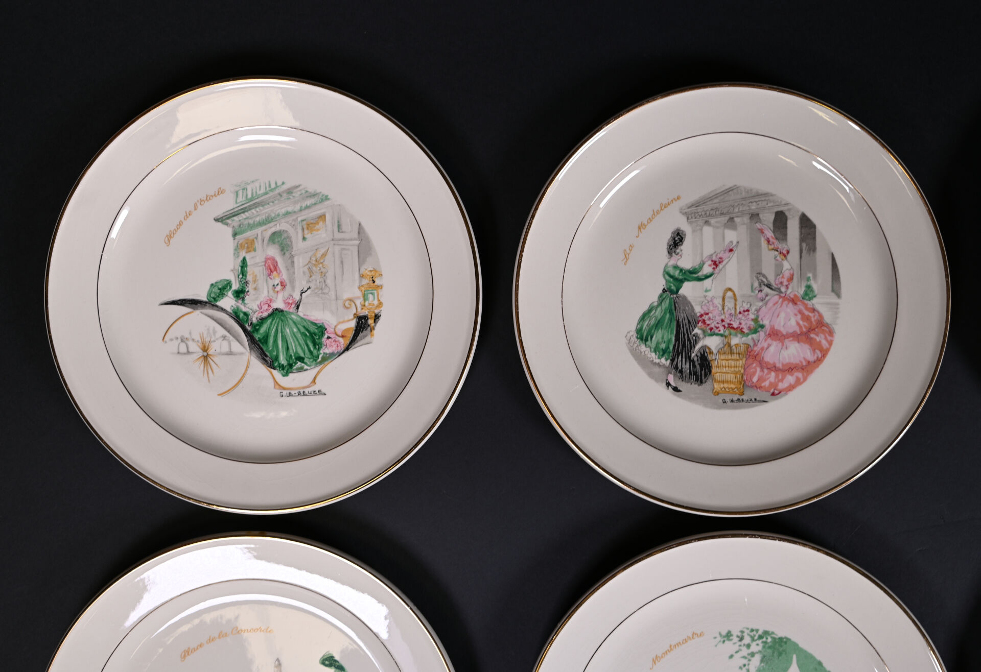 ROBJ – PARIS et VILLEROY & BOCH. Partie de service de table sur le thème de Paris et les parisiennes soit 12 assiettes et 1 plat de service à décor de Gaston Le Beuze. Marqués. Diam. du plat : 26 cm. Diam. des assiettes : 19 cm.