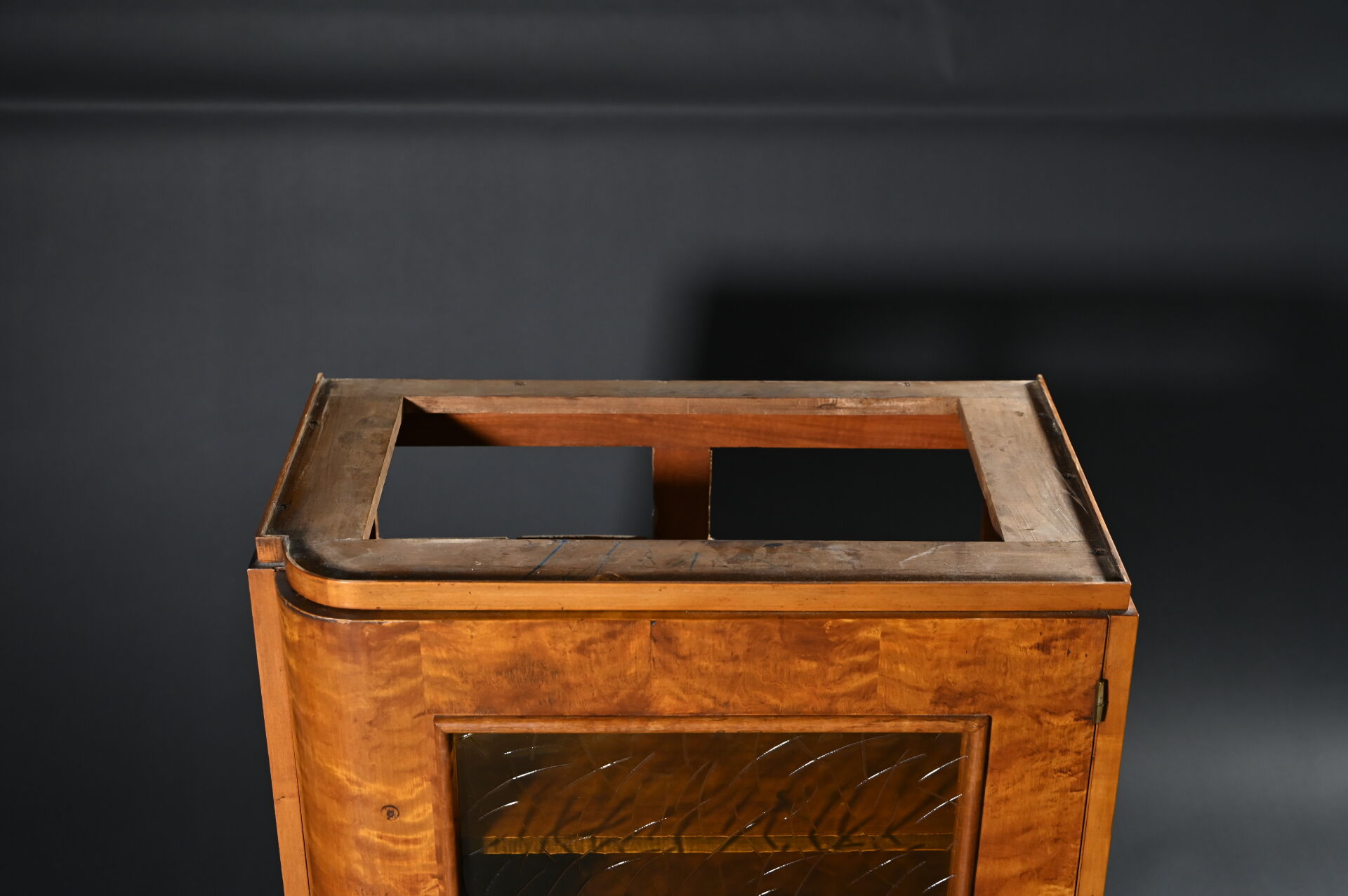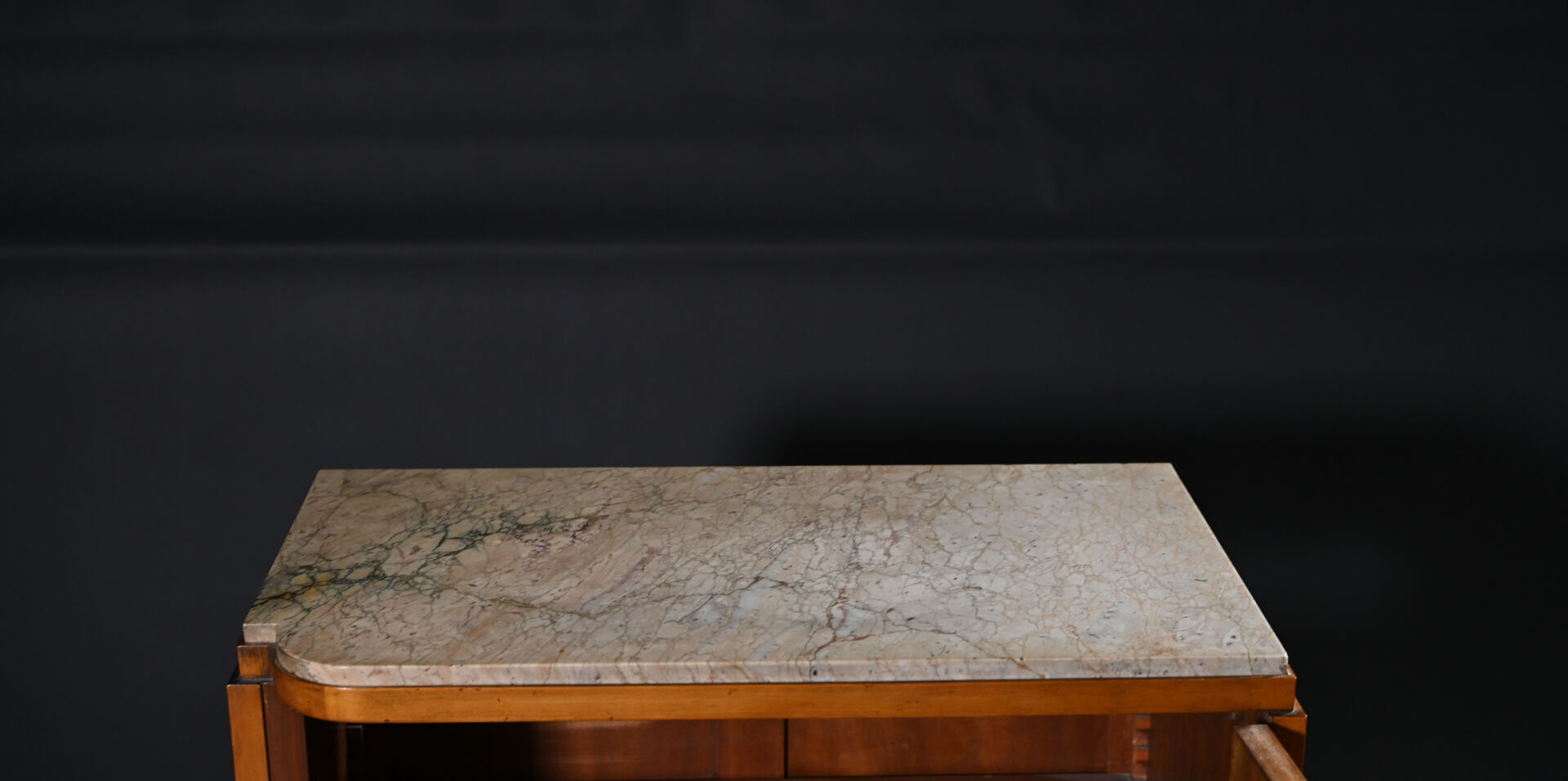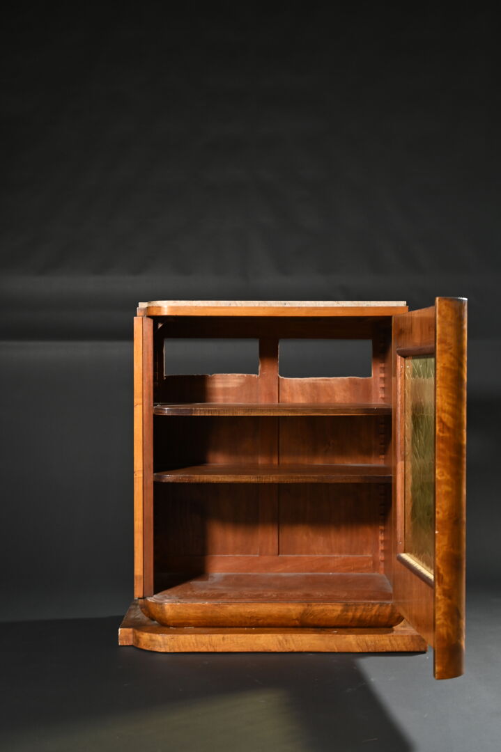 ROGER BAL DECORATEUR. Meuble bas en bois de placage ouvrant à une porte en partie vitrée jaune et plateau de marbre beige (manque la poignée, entrée de serrure et vitrage rapportés, usures et restaurations). Epoque Art Déco. Haut. : 97 cm – Larg. : 85 cm – Prof. : 46 cm.
