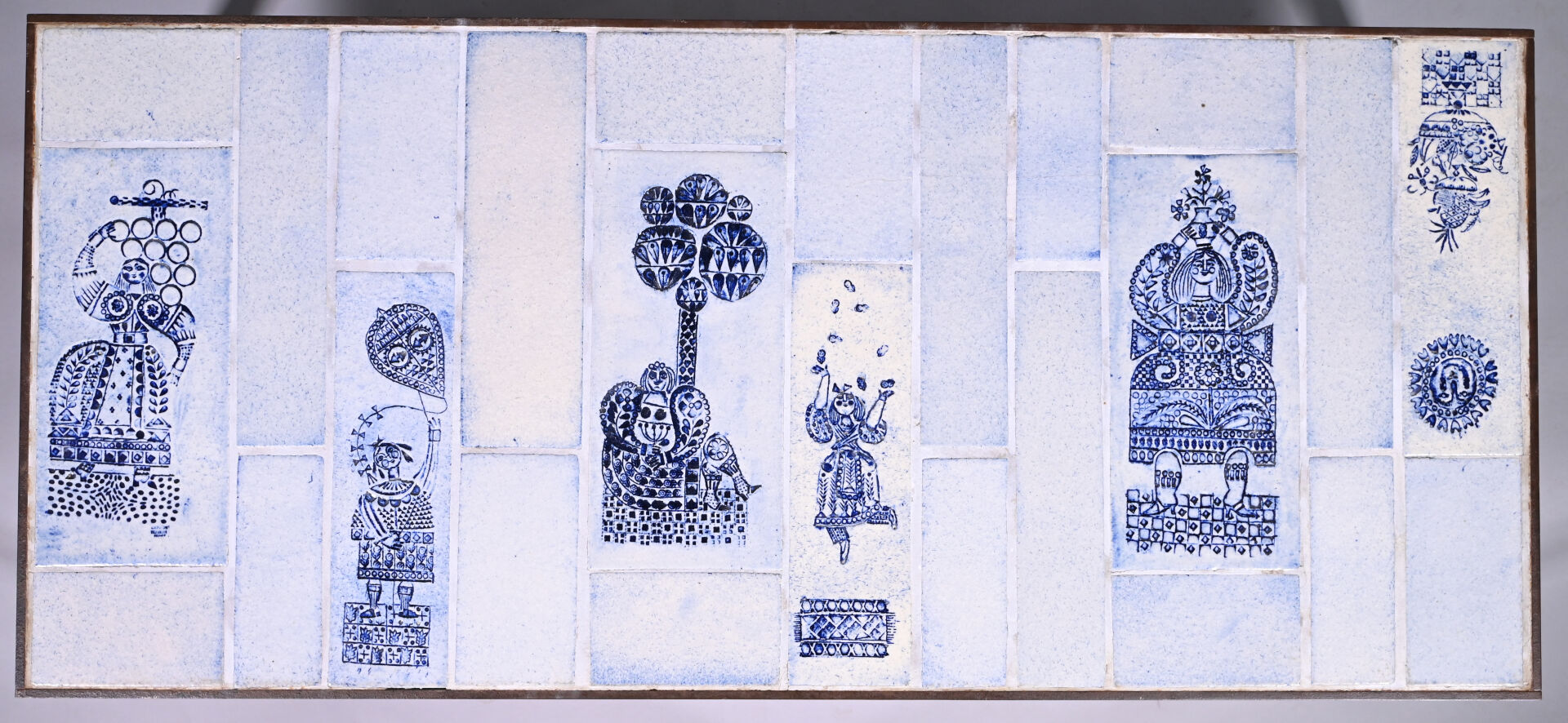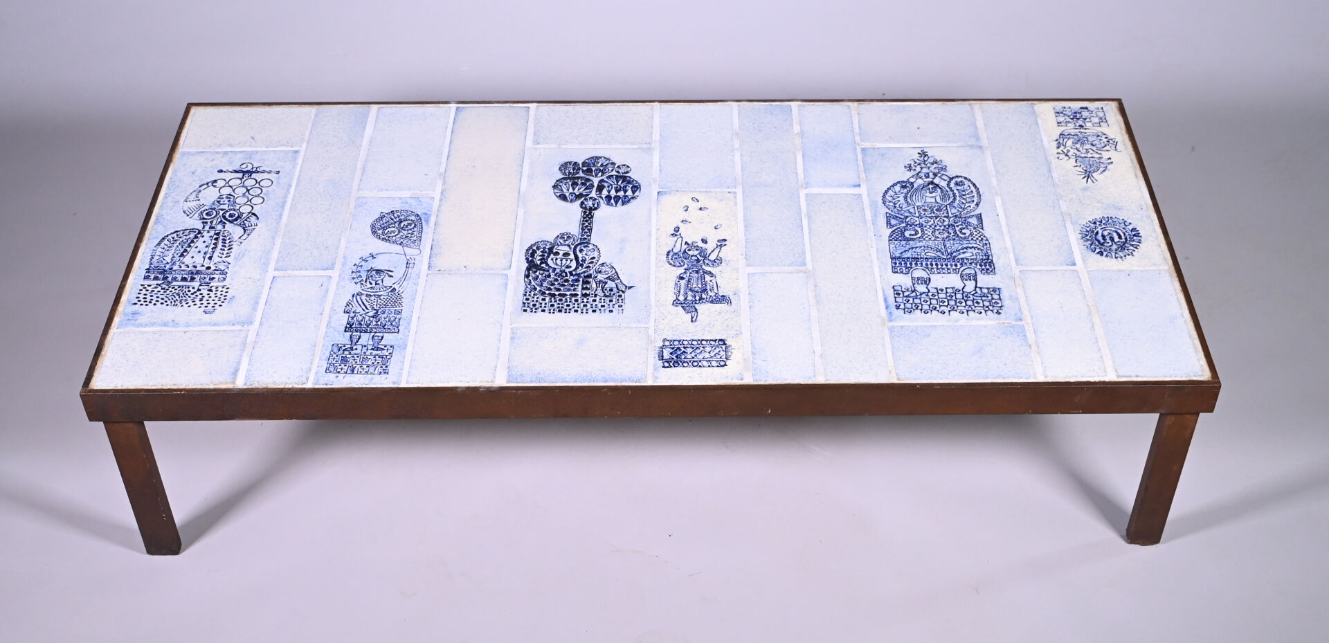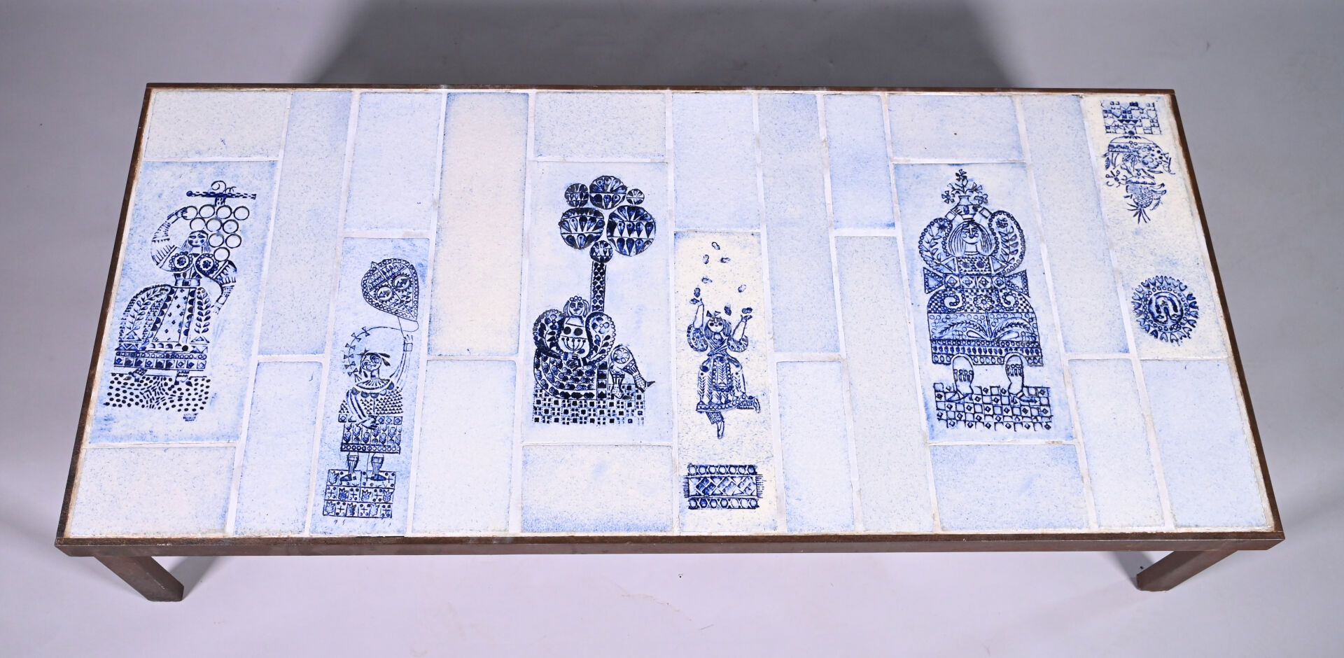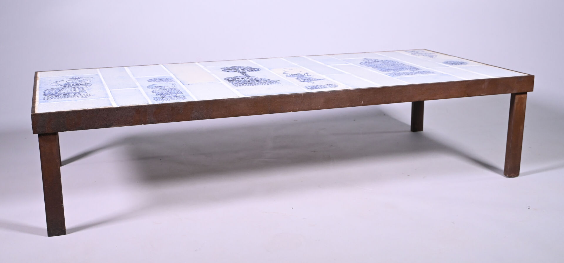 Roger CAPRON (1922-2006). Table basse en métal modèle « 4 Saisons » avec plateau garni de carreaux de céramique émaillée bleu, à décor en creux de personnages naïfs (fêles). Modèle créé en 1977, référence TX 223. Cachet CAPRON VALLAURIS. Haut. : 29 cm – Larg. : 130 cm – Prof. : 58 cm.