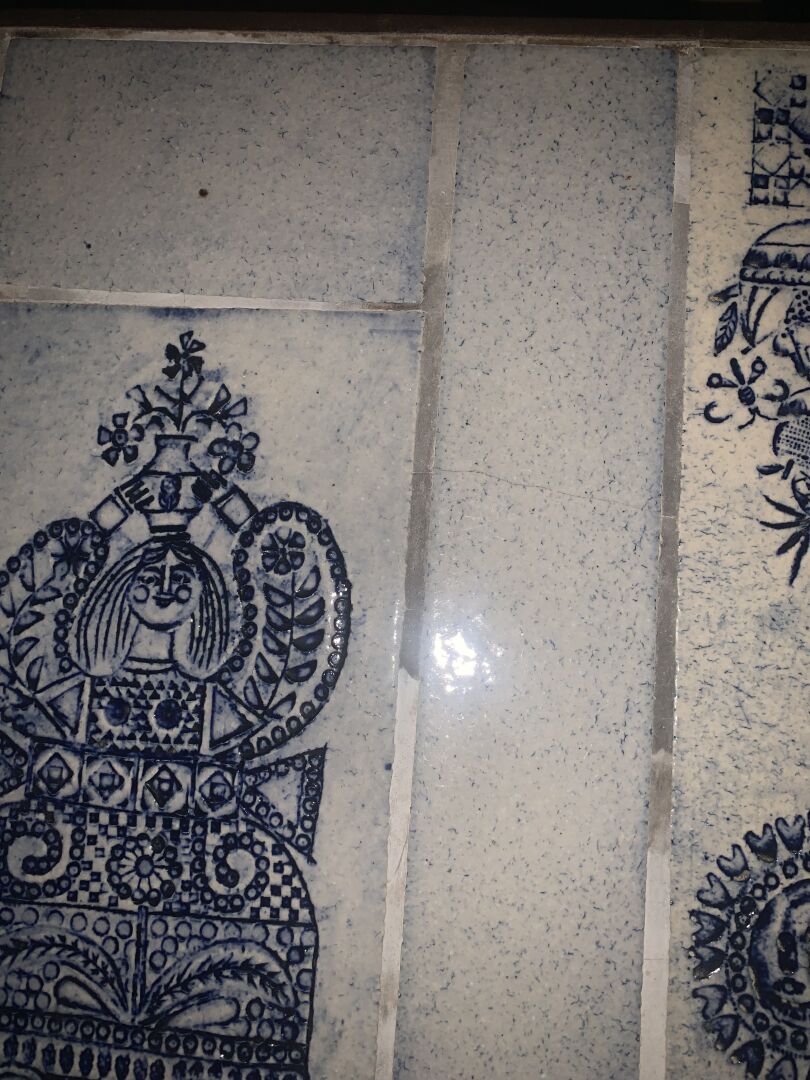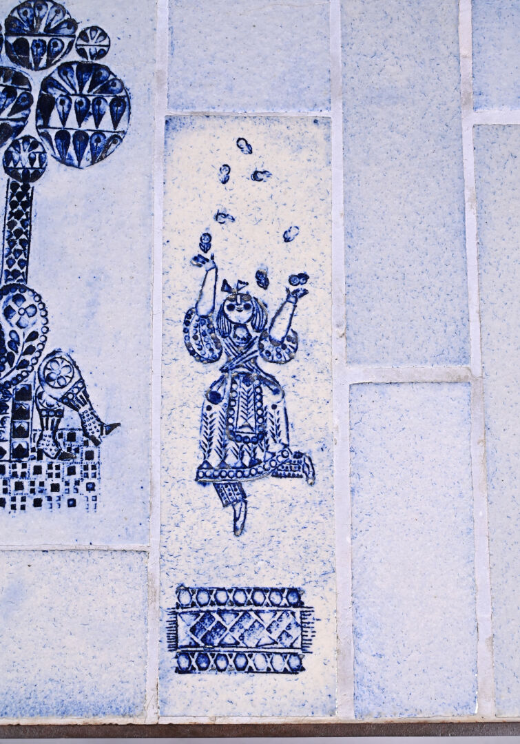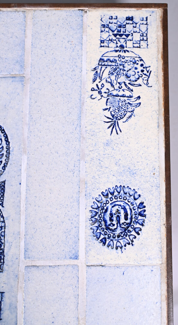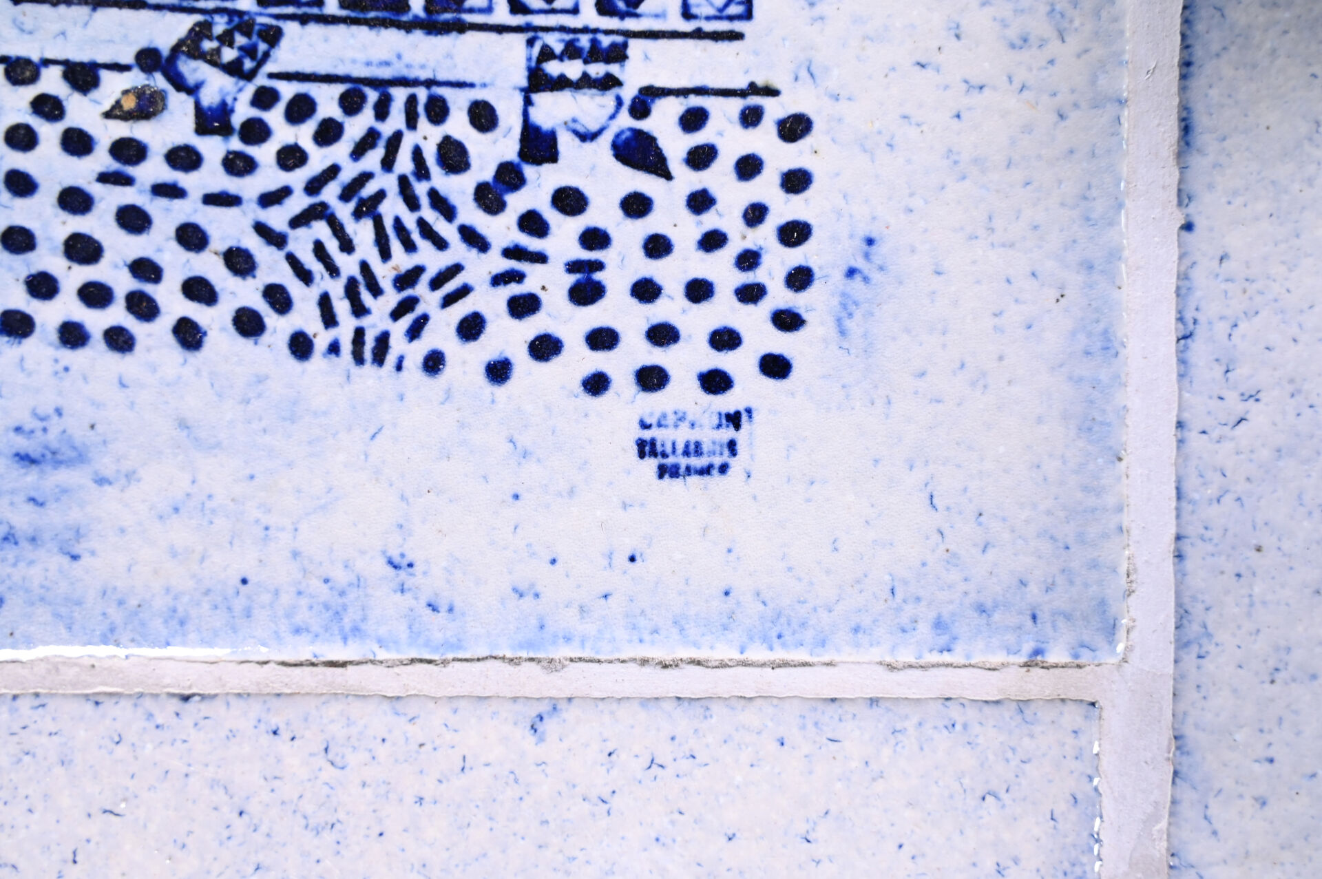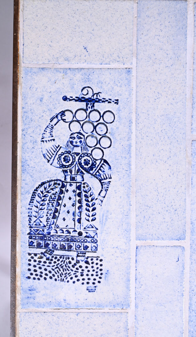 Roger CAPRON (1922-2006). Table basse en métal modèle « 4 Saisons » avec plateau garni de carreaux de céramique émaillée bleu, à décor en creux de personnages naïfs (fêles). Modèle créé en 1977, référence TX 223. Cachet CAPRON VALLAURIS. Haut. : 29 cm – Larg. : 130 cm – Prof. : 58 cm.