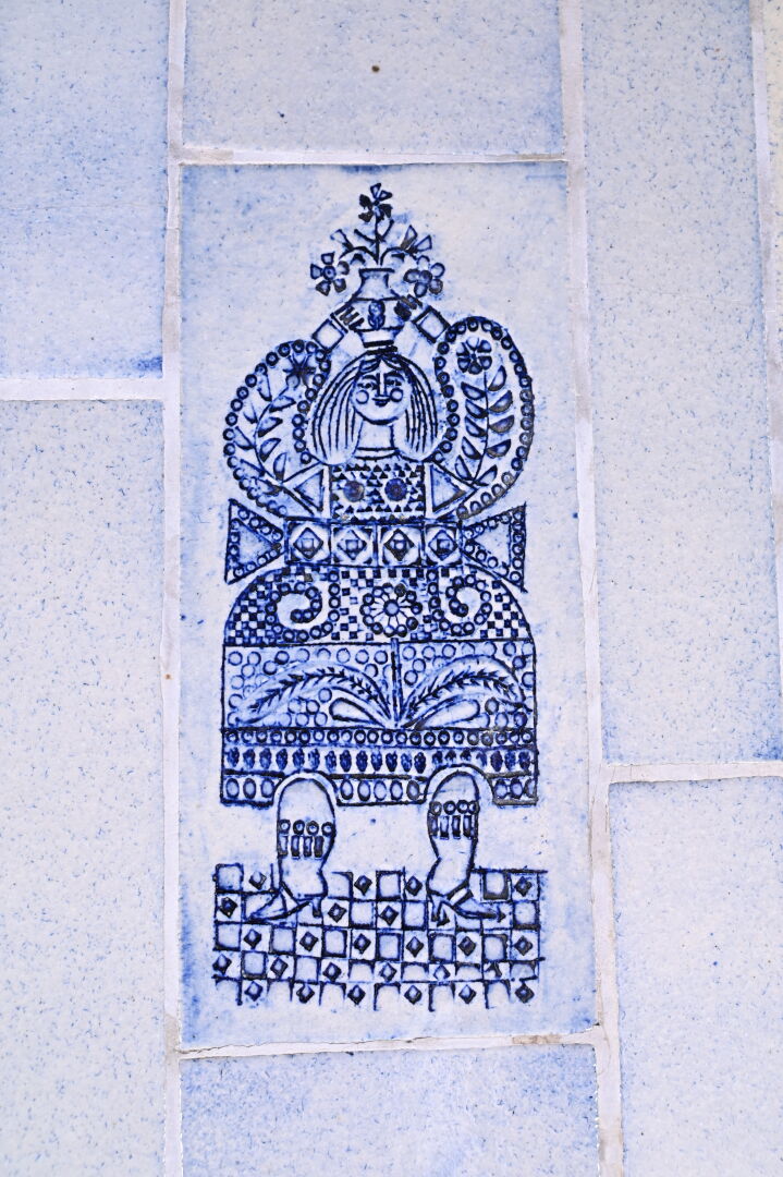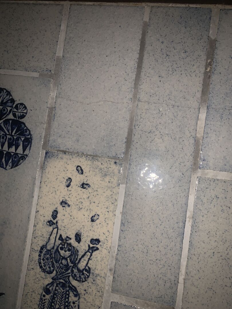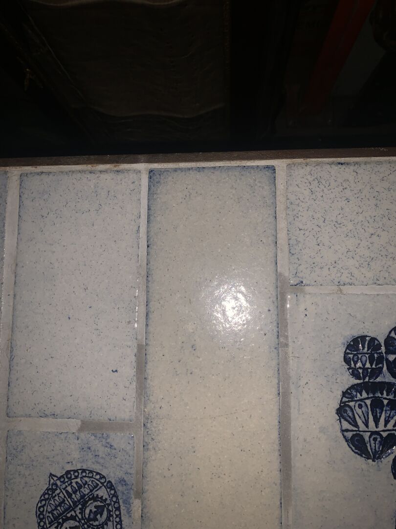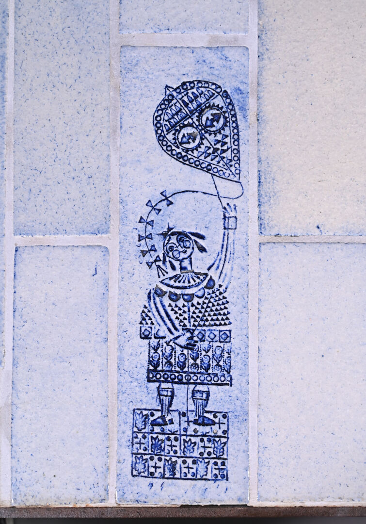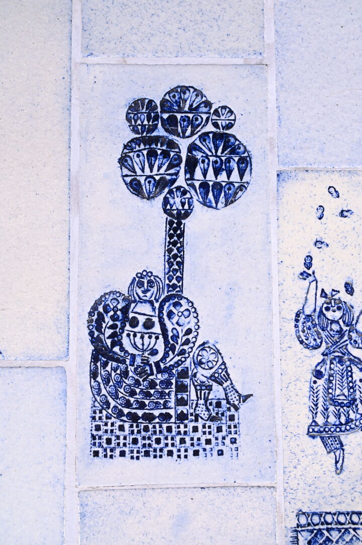 Roger CAPRON (1922-2006). Table basse en métal modèle « 4 Saisons » avec plateau garni de carreaux de céramique émaillée bleu, à décor en creux de personnages naïfs (fêles). Modèle créé en 1977, référence TX 223. Cachet CAPRON VALLAURIS. Haut. : 29 cm – Larg. : 130 cm – Prof. : 58 cm.