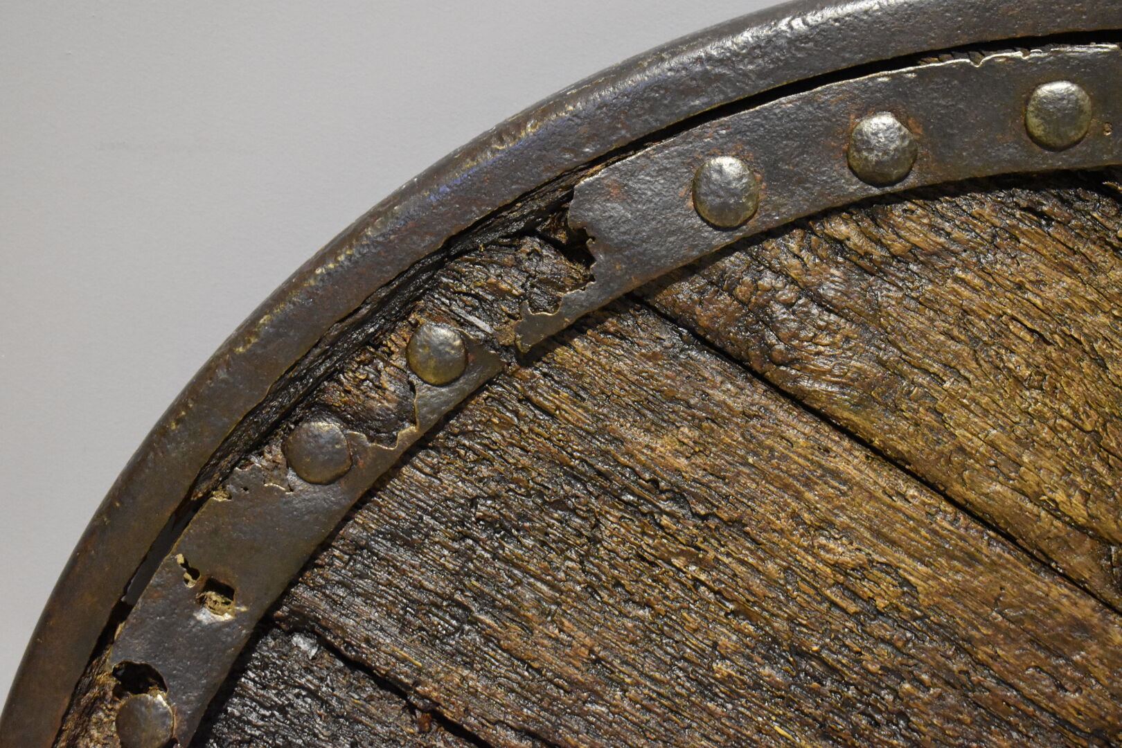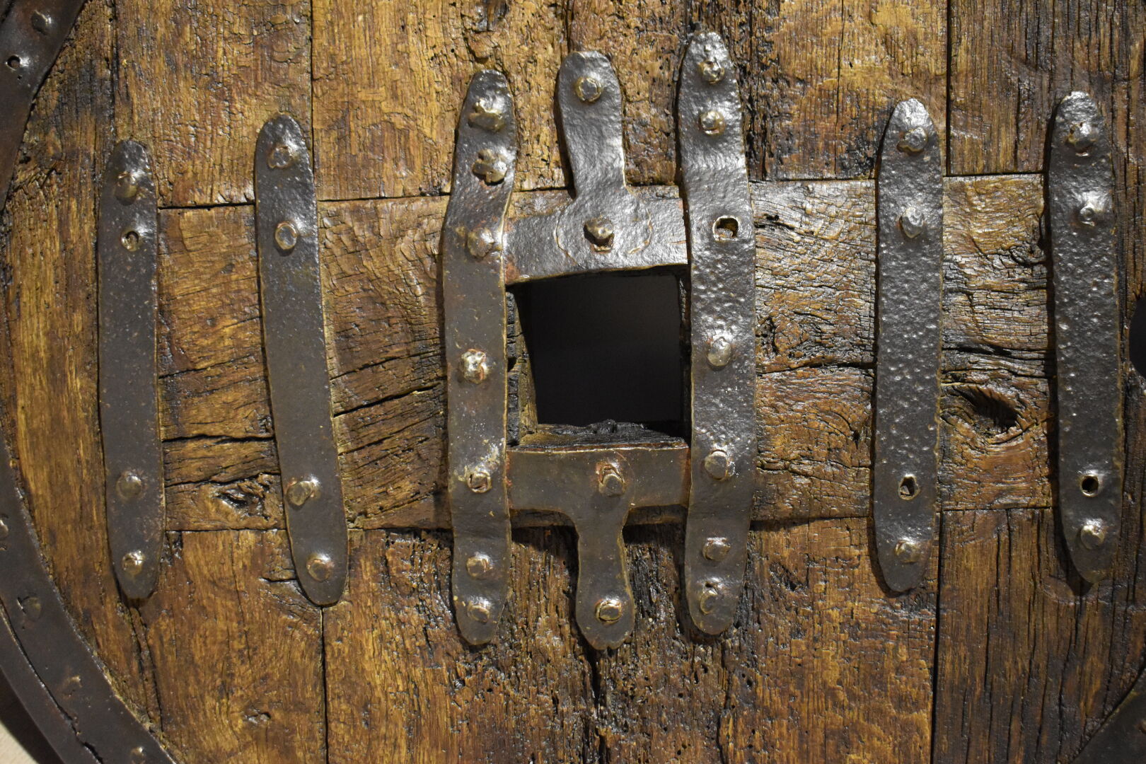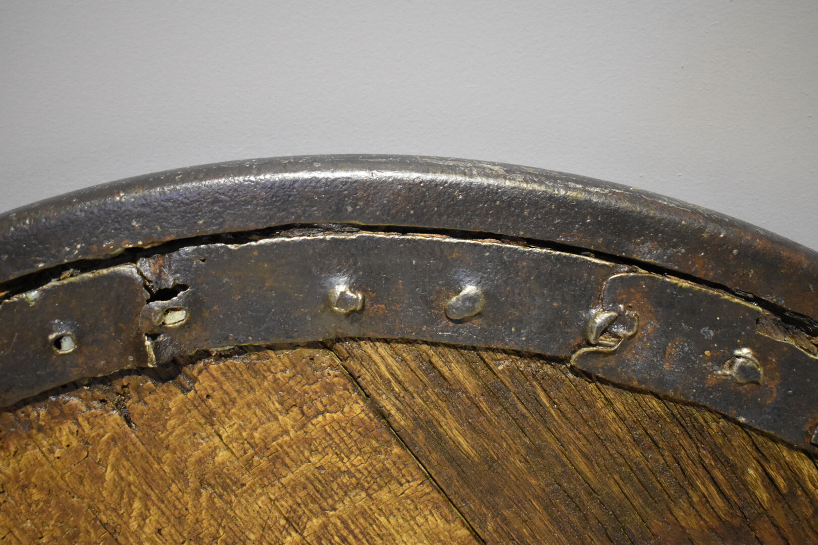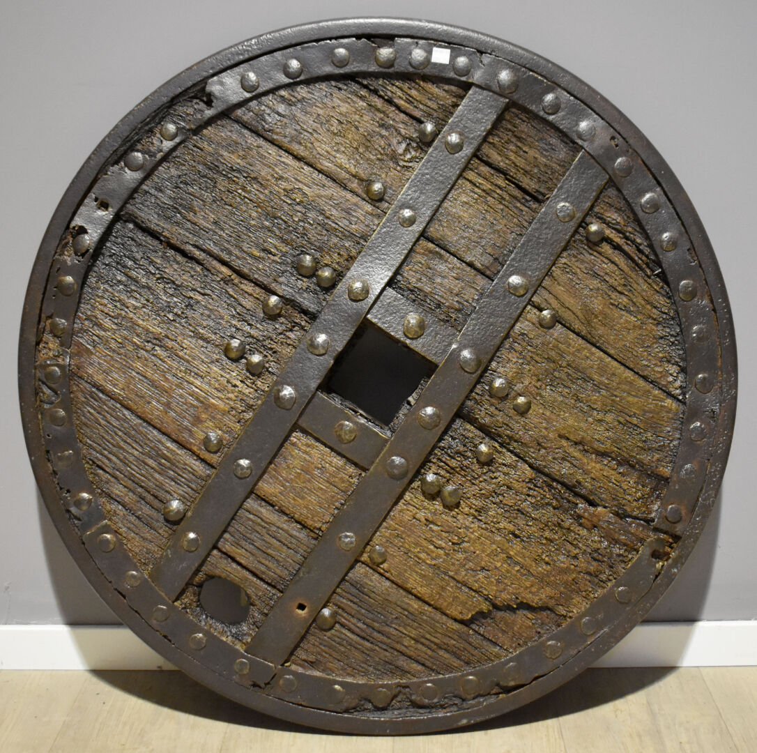 Roue en bois et métal forgé martelé. Probablement médiéval. Diam. : 85 cm.