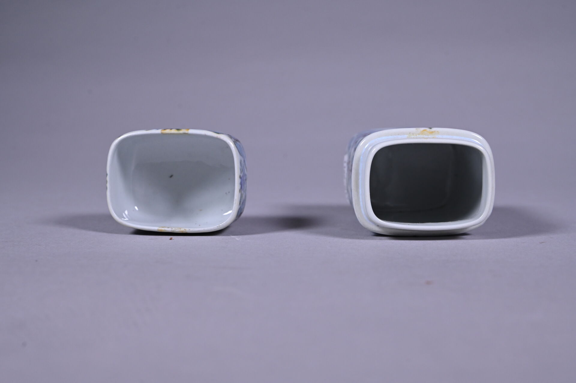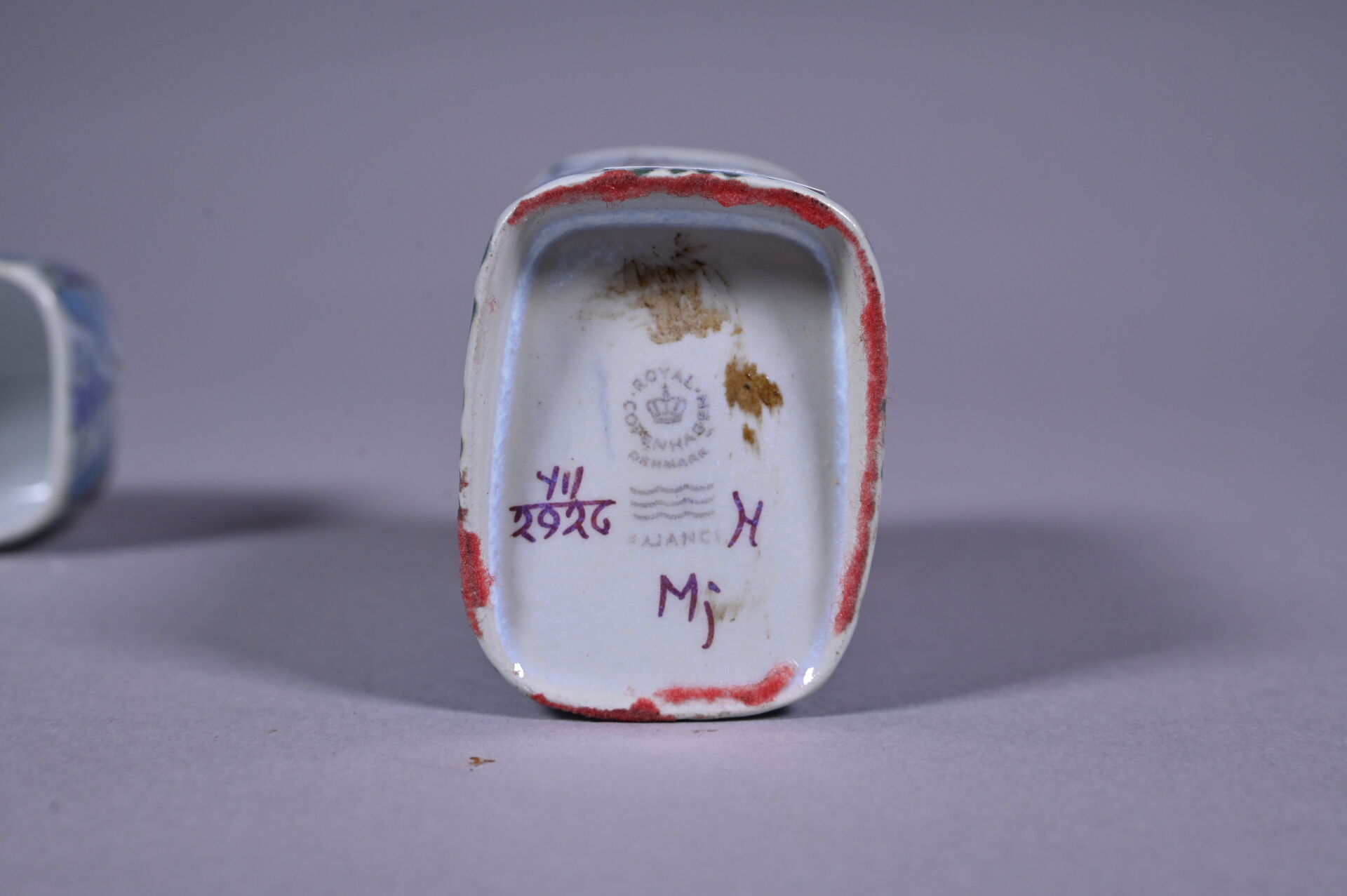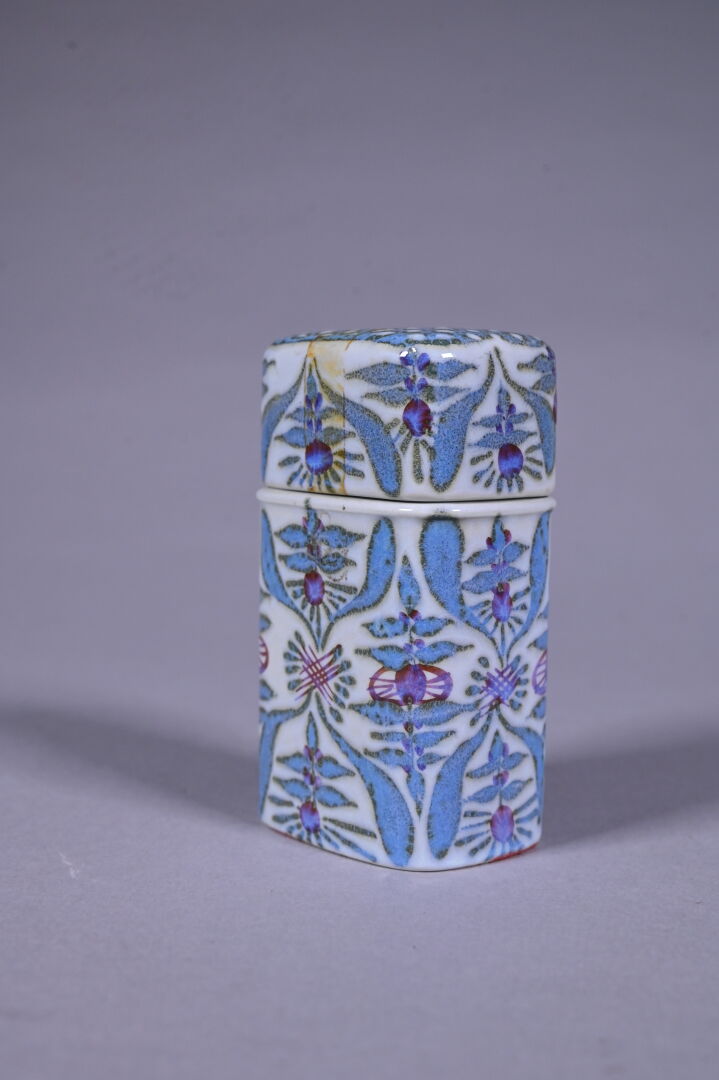 ROYAL COPENHAGUE. Petite boite en céramique émaillée de motifs géométriques en bleu et mauve (traces de scotch). Marquée au dessous. Haut. : 10,5 cm.