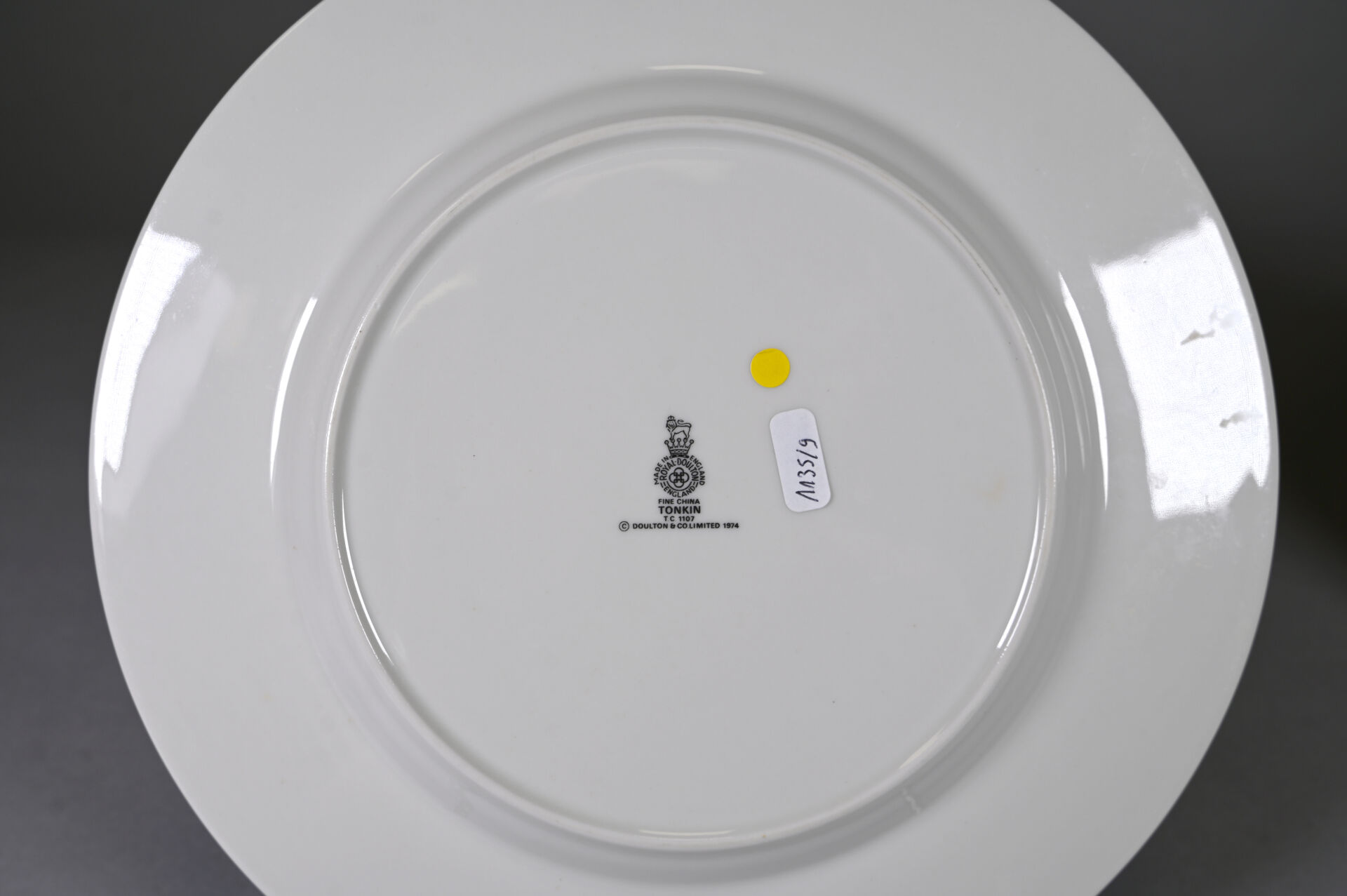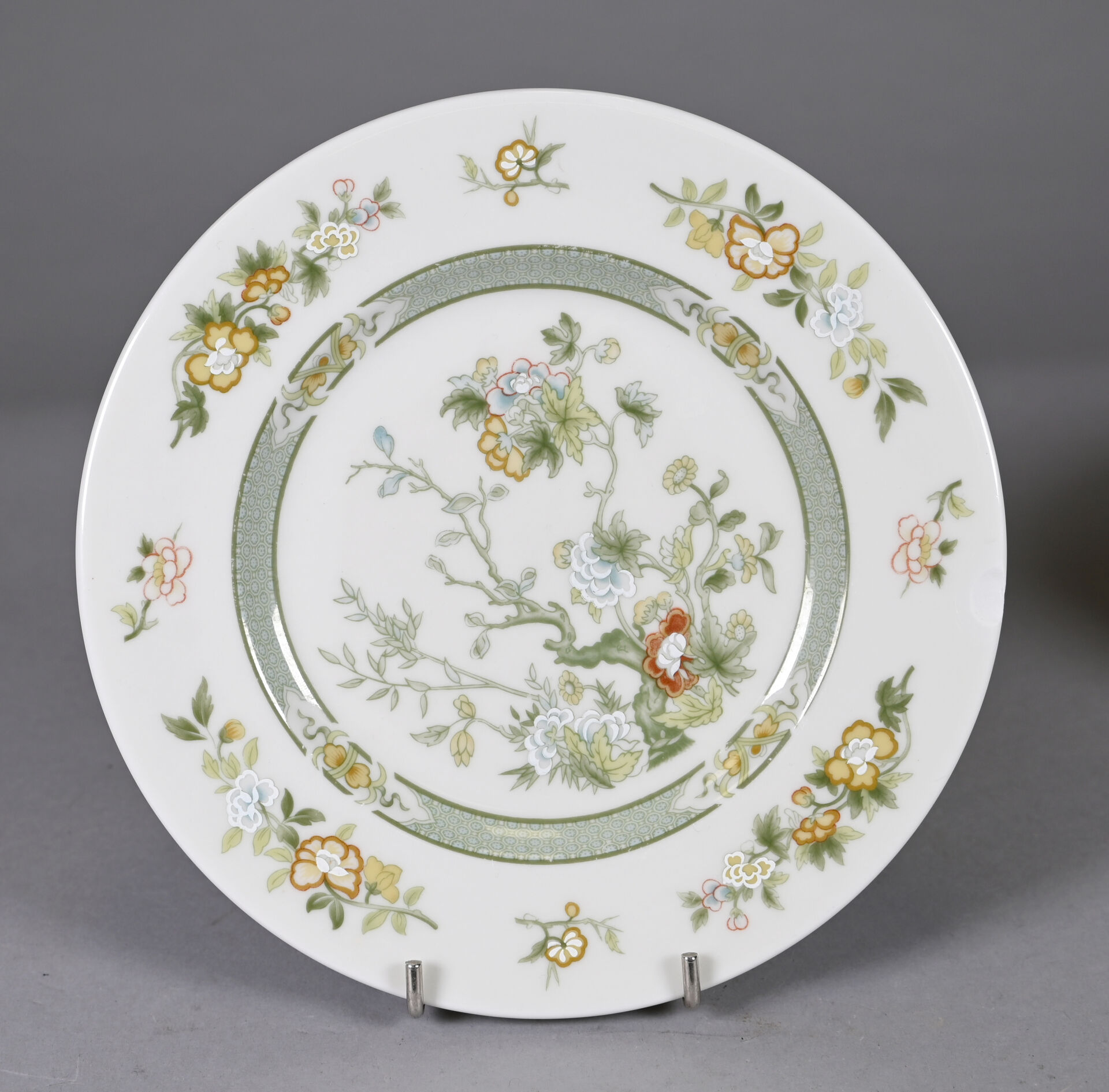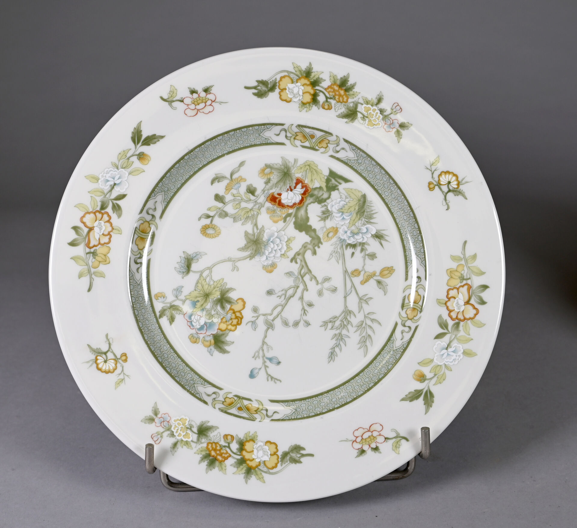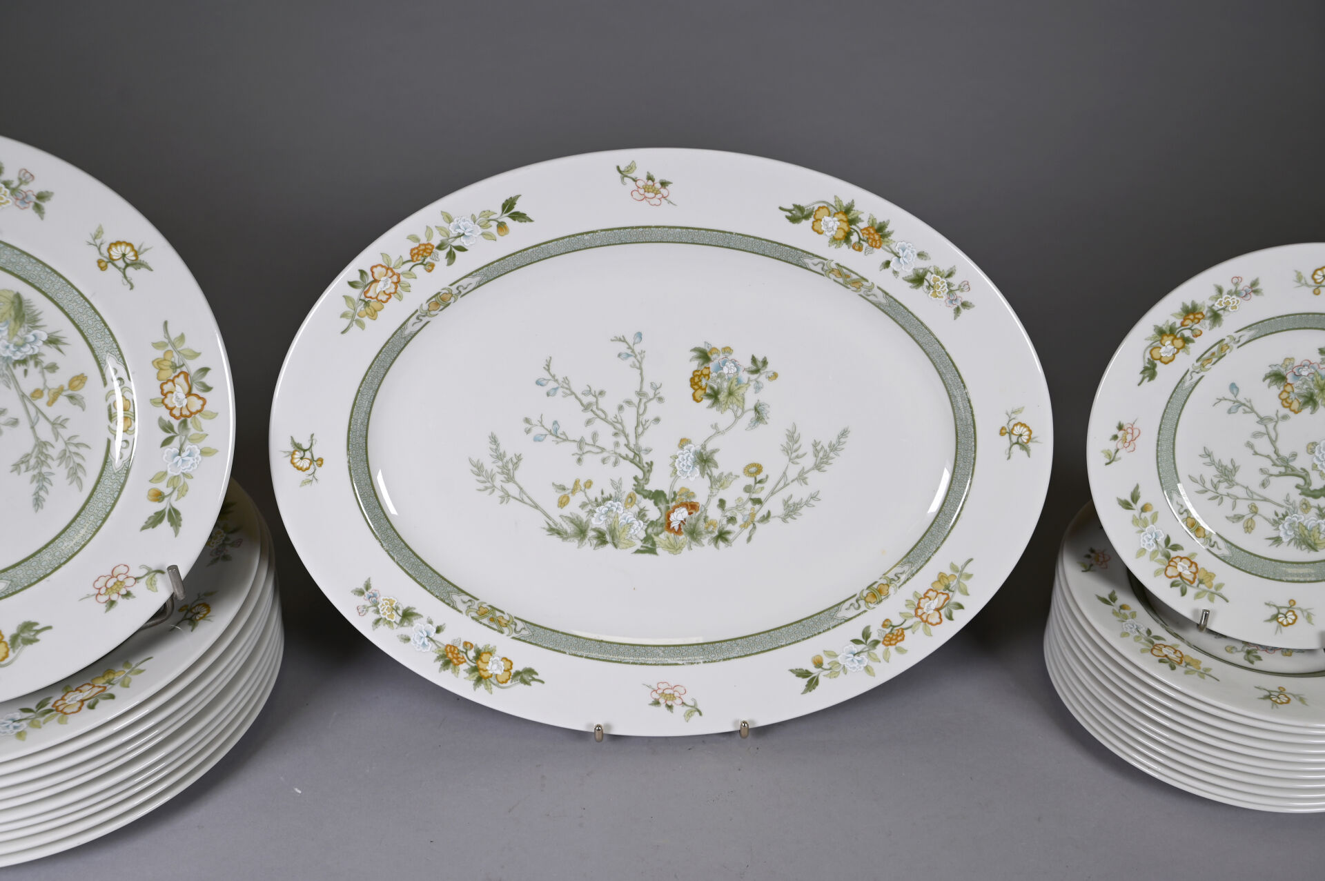 ROYAL DOULTON ENGLAND. Partie de service de table en porcelaine blanche à décor dans les camaieu de vert modèle « Tonkin » comprenant 11 assiettes plates, 12 assiettes à dessert et un plat de service ovale (un éclat). Marqué.
