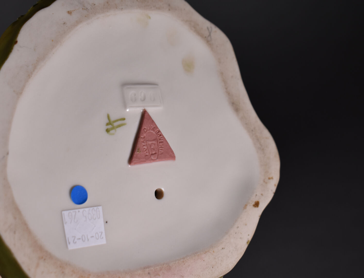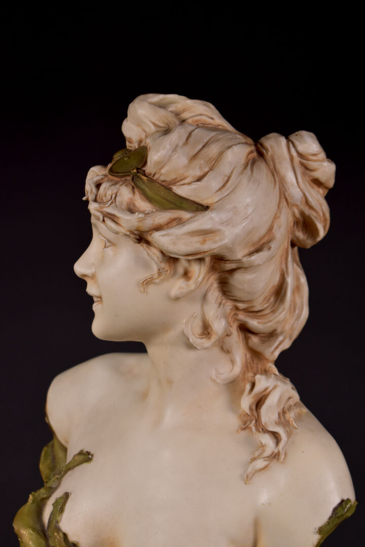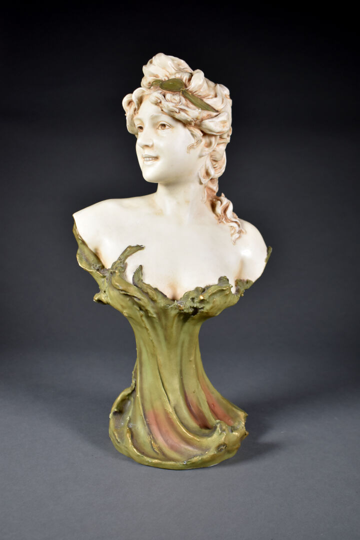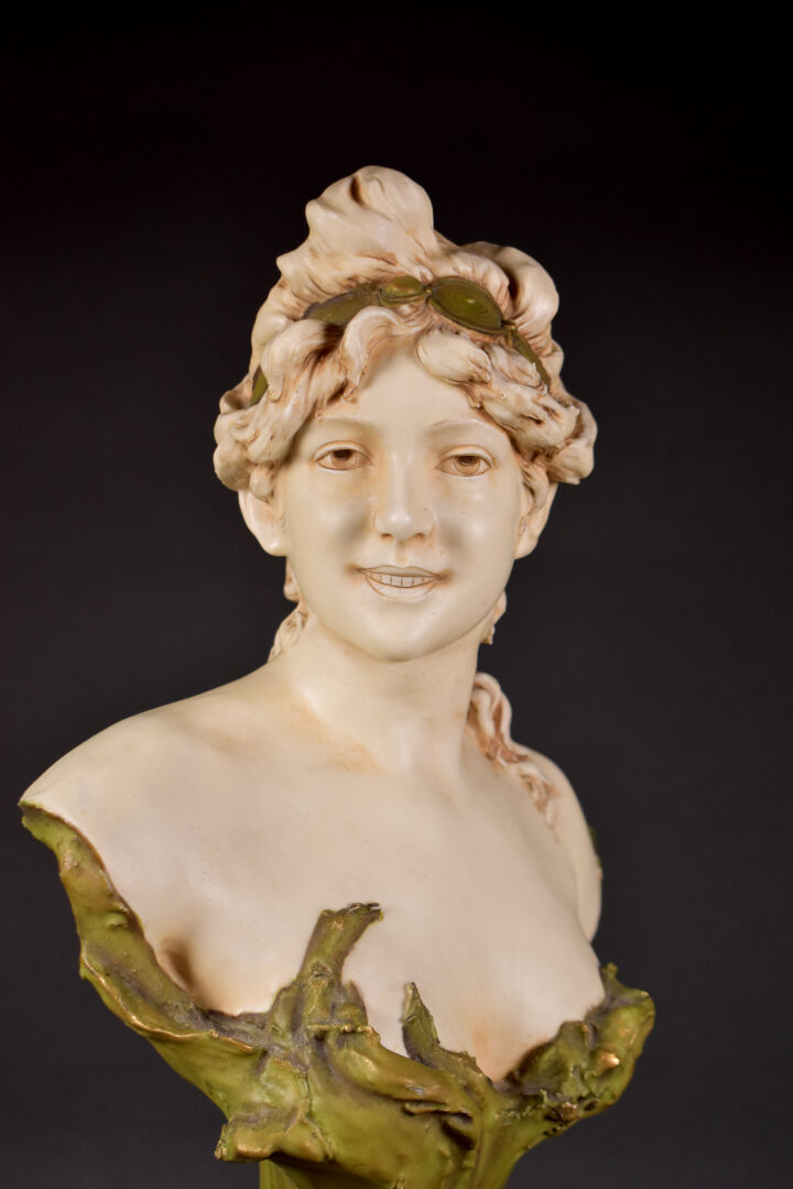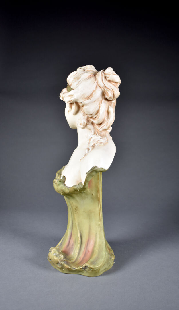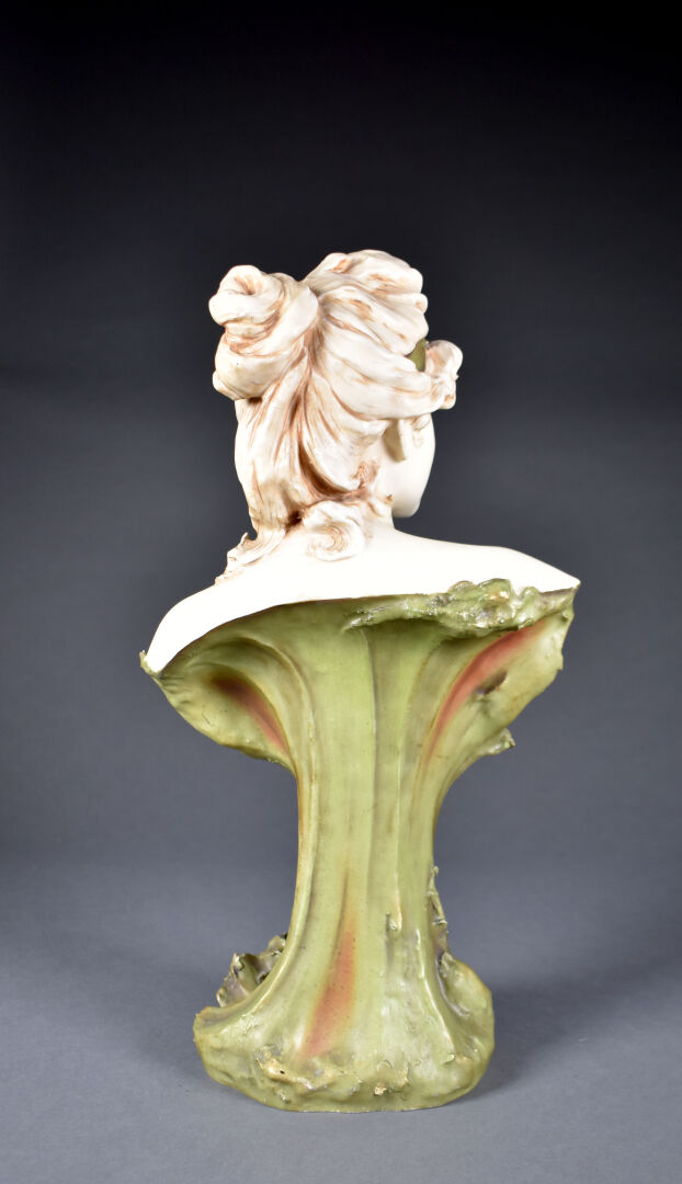 ROYAL DUX BOHEMIA. Buste de femme aux cheveux noués, sur piédouche, en céramique partiellement émaillée vert et or (égrenures). Marqué au-dessous et numéroté 969. Haut. 47 cm.