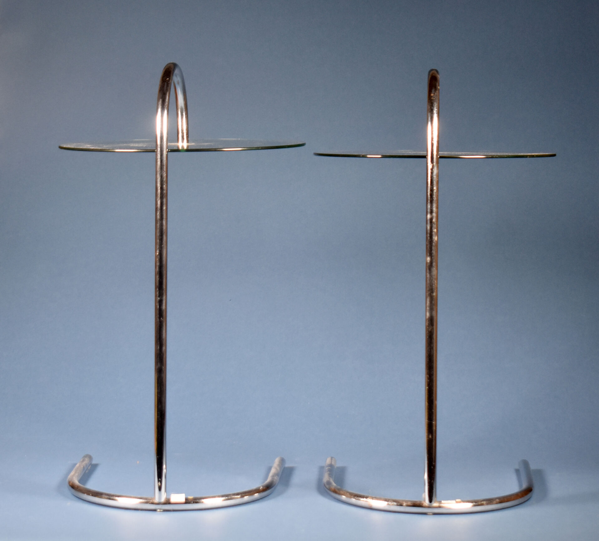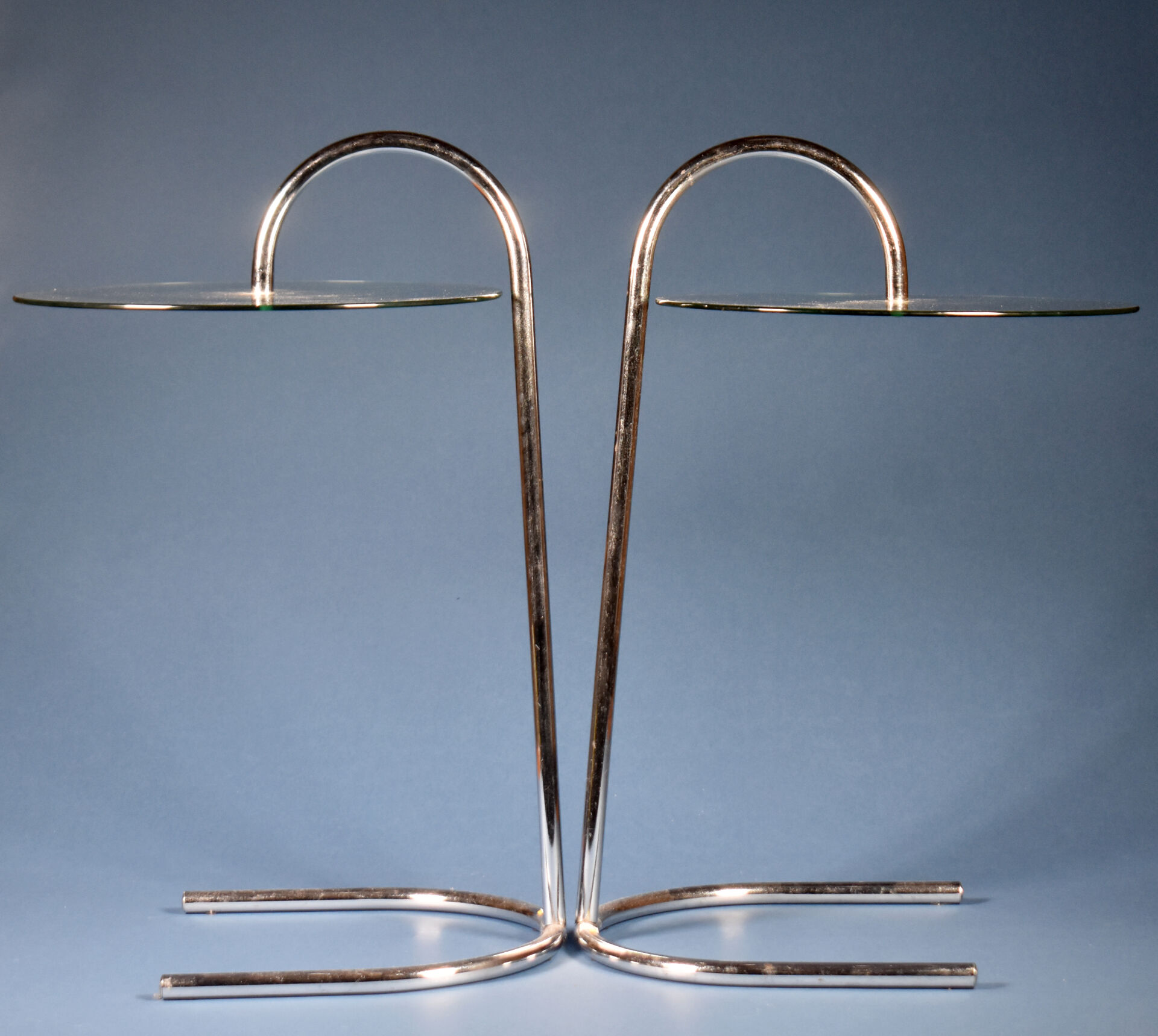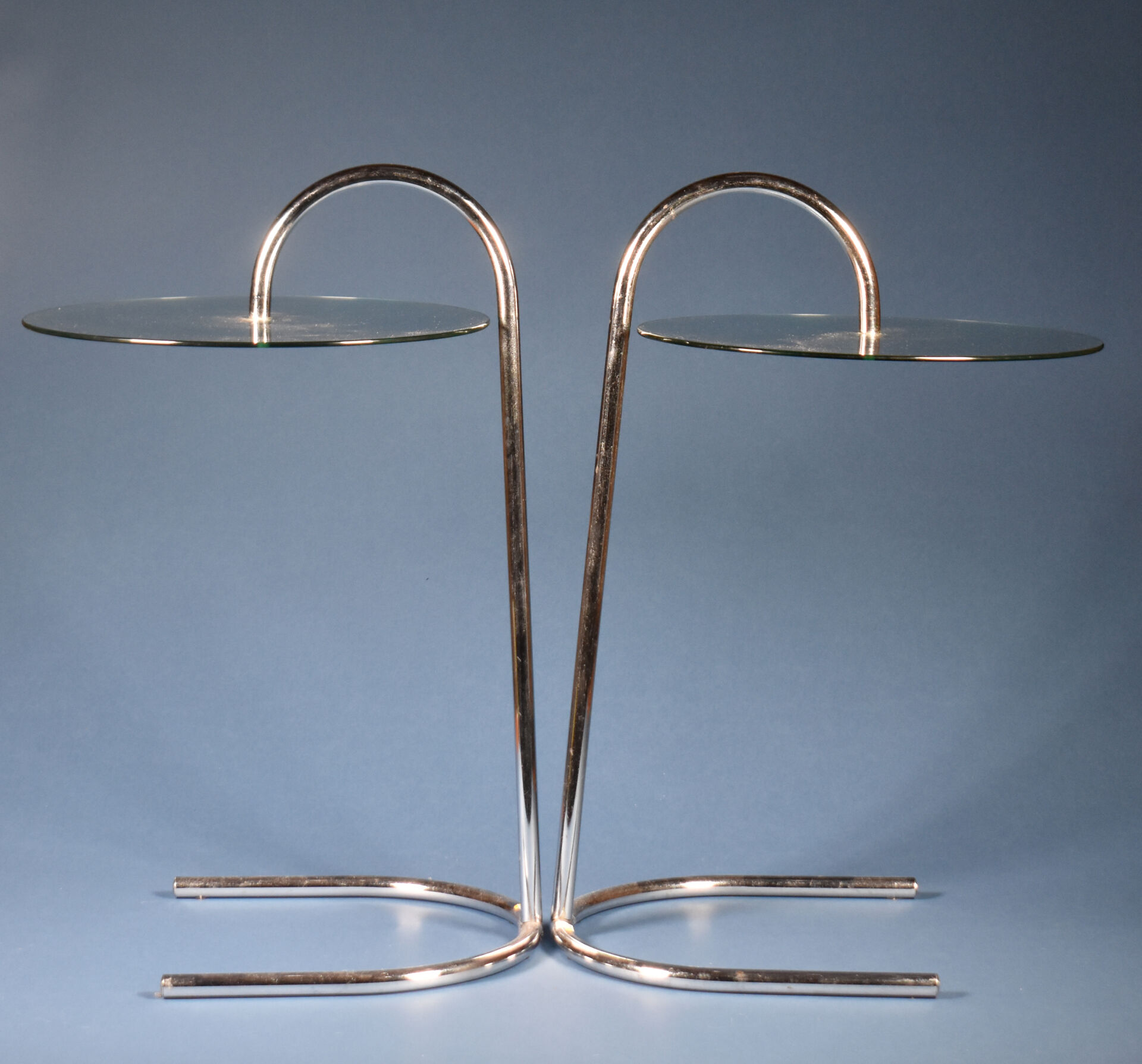 RY-IKEA. Paire de sellettes ou tables d’appoint en métal chromé et plateau de verre. Haut. : 69 cm.