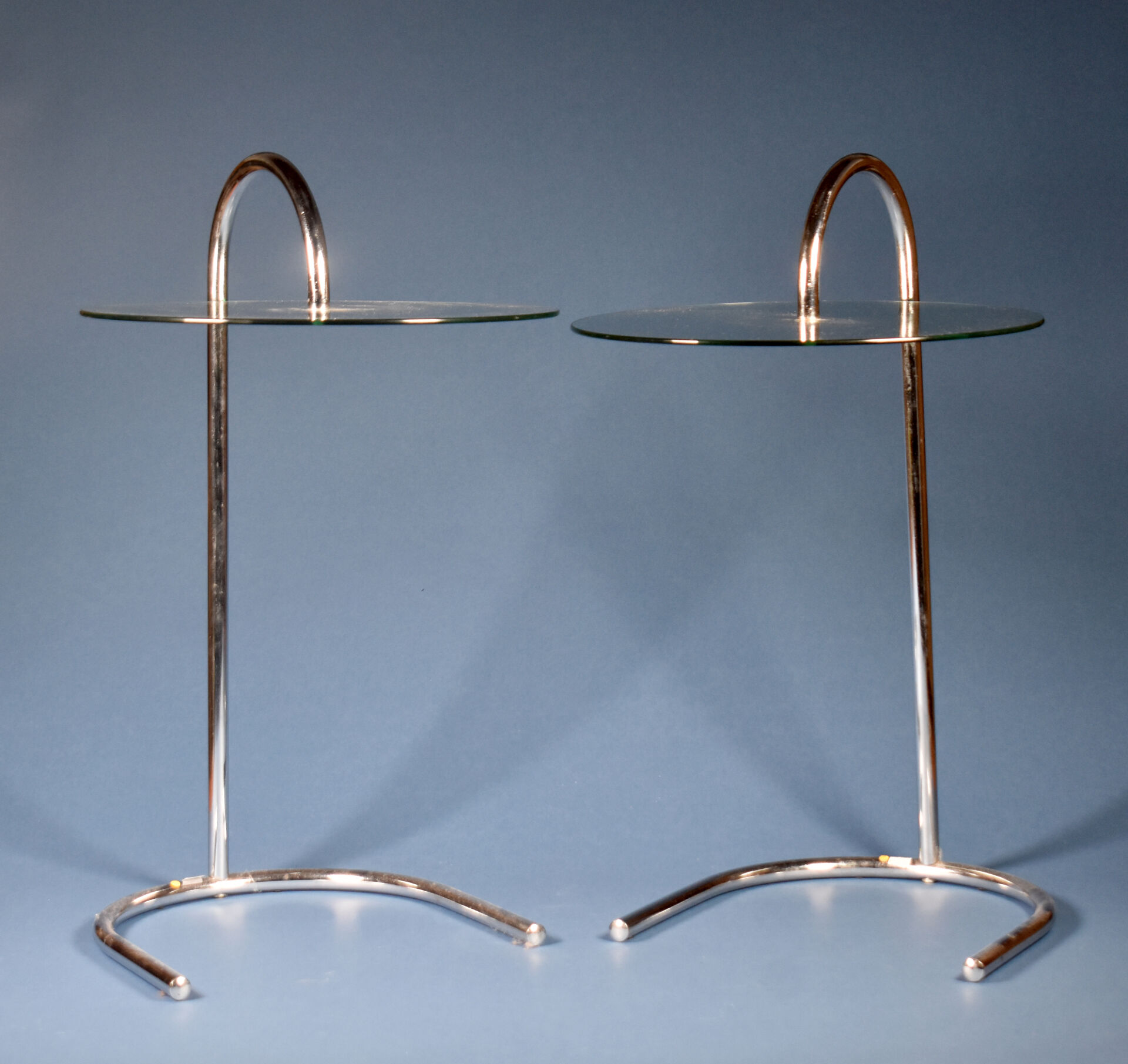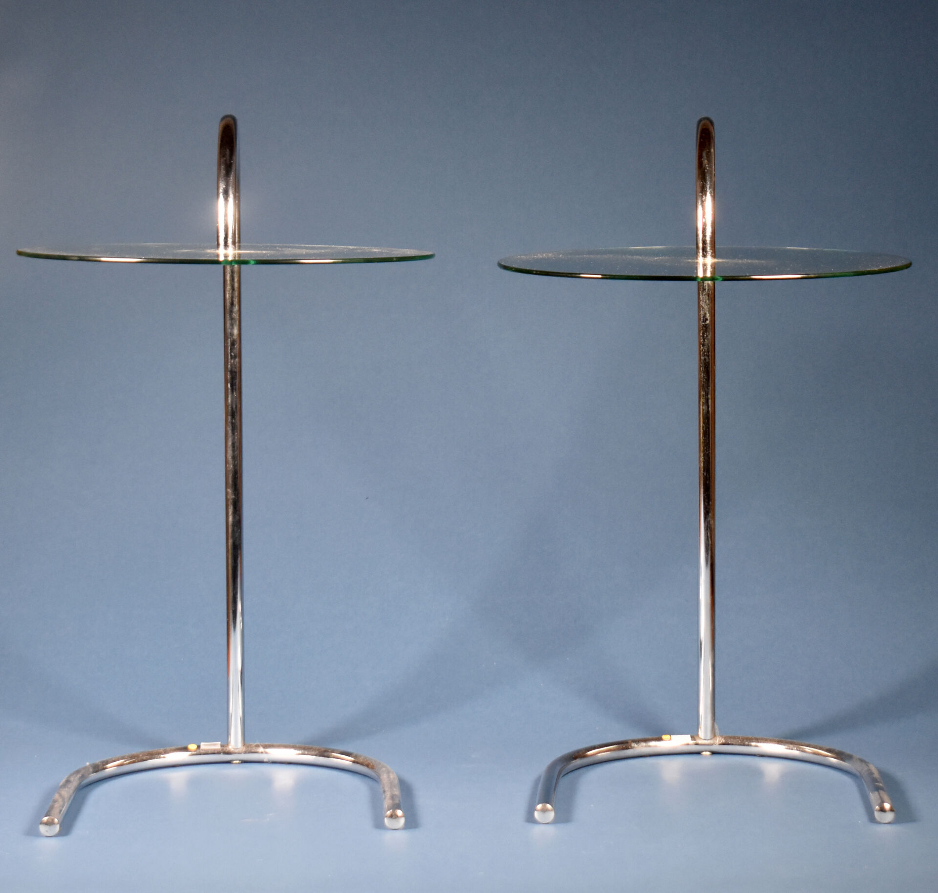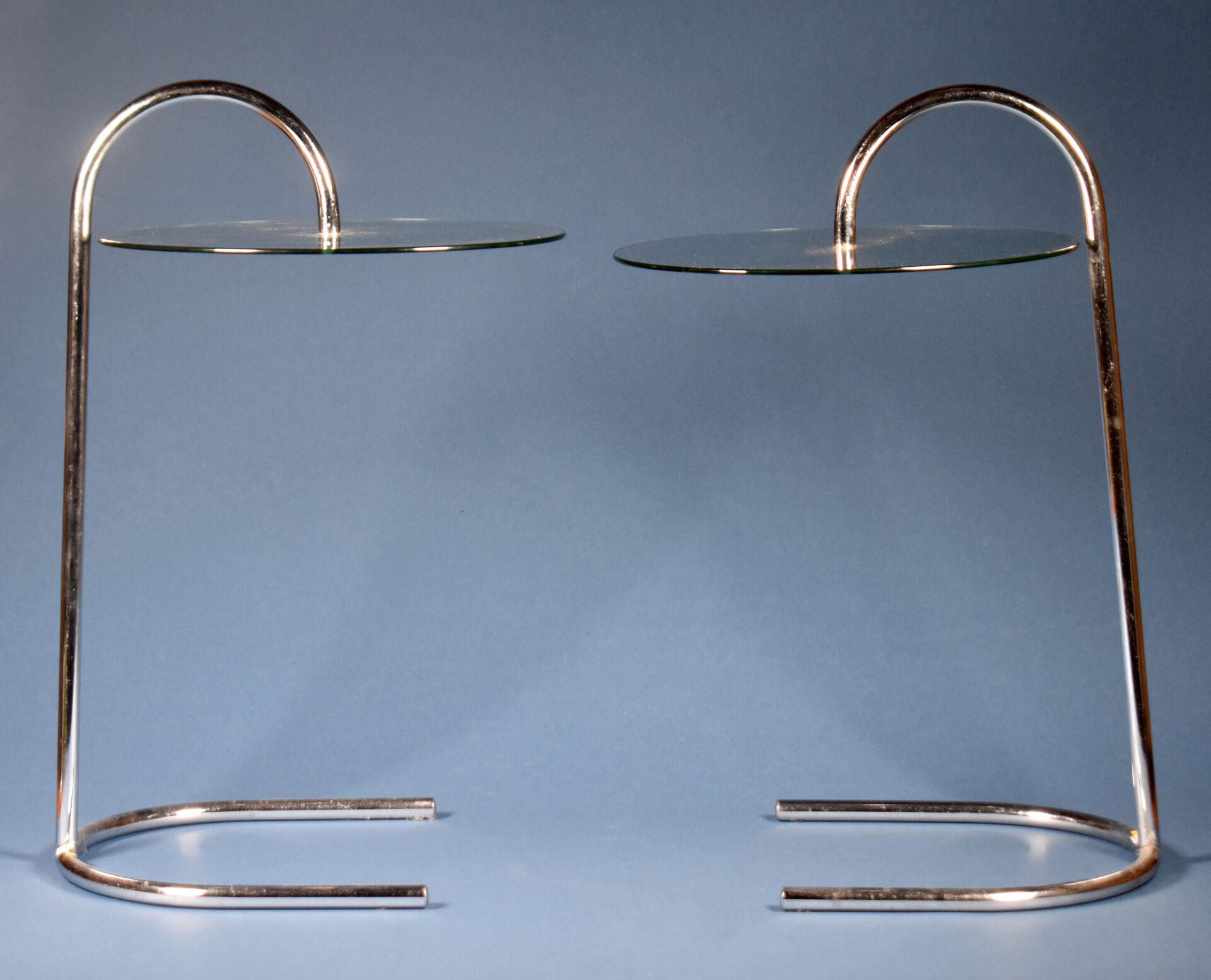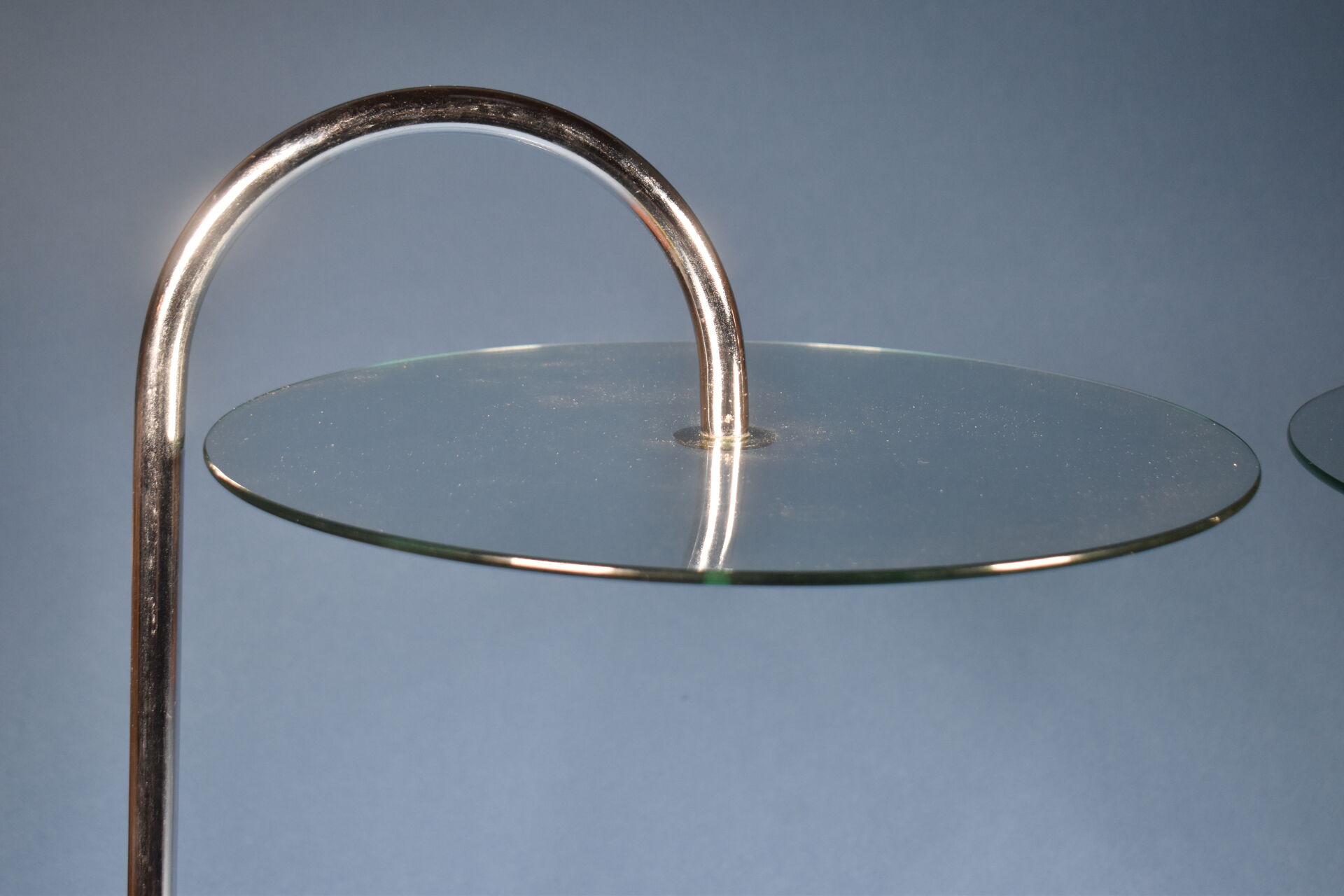 RY-IKEA. Paire de sellettes ou tables d’appoint en métal chromé et plateau de verre. Haut. : 69 cm.
