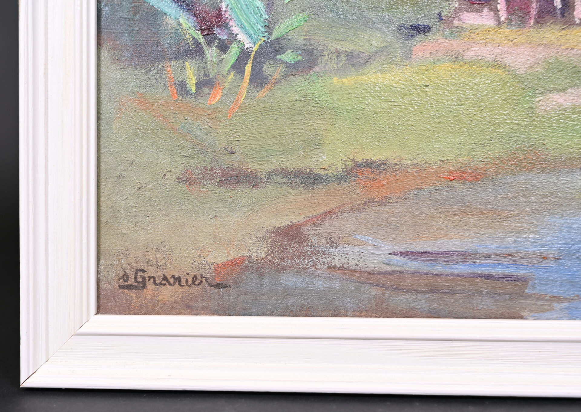 S. GRANIER (XIX-XXe siècle). Maisons au bord de l’eau, Indochine. Huile sur isorel signée en bas à gauche. 33 x 41 cm.