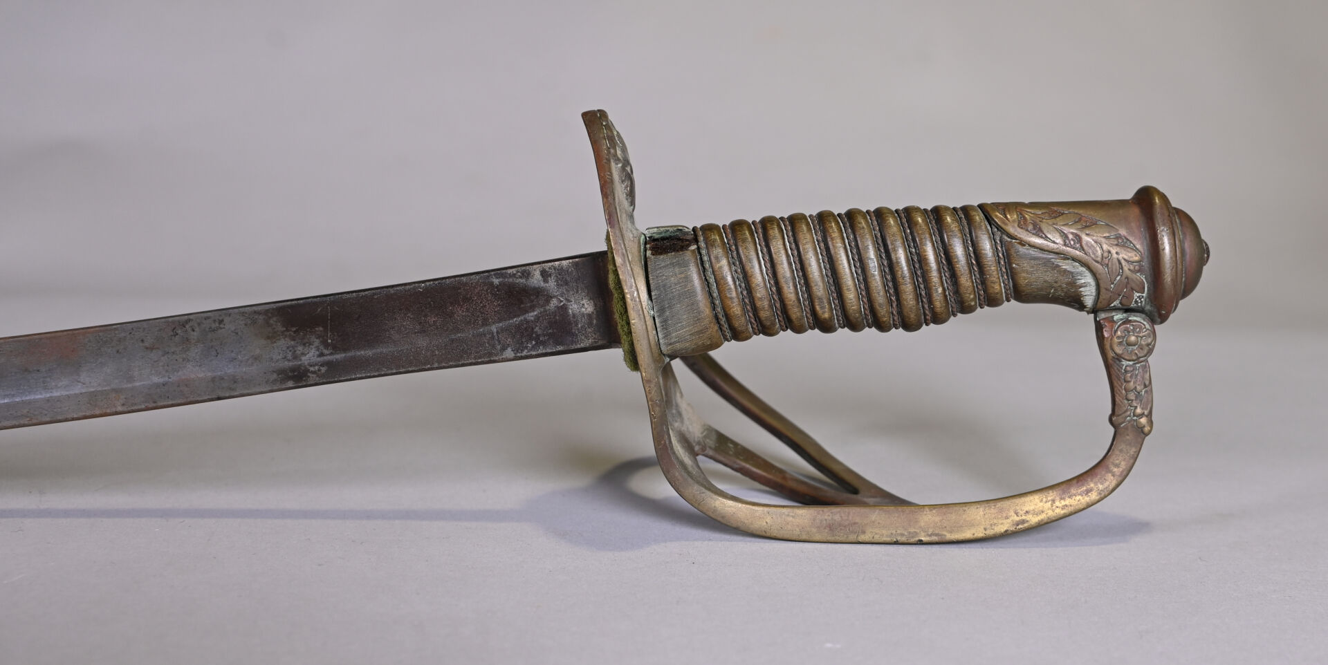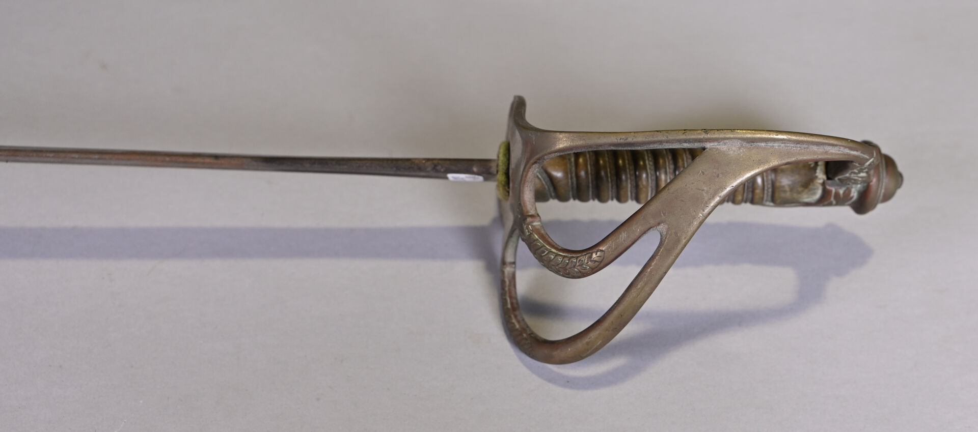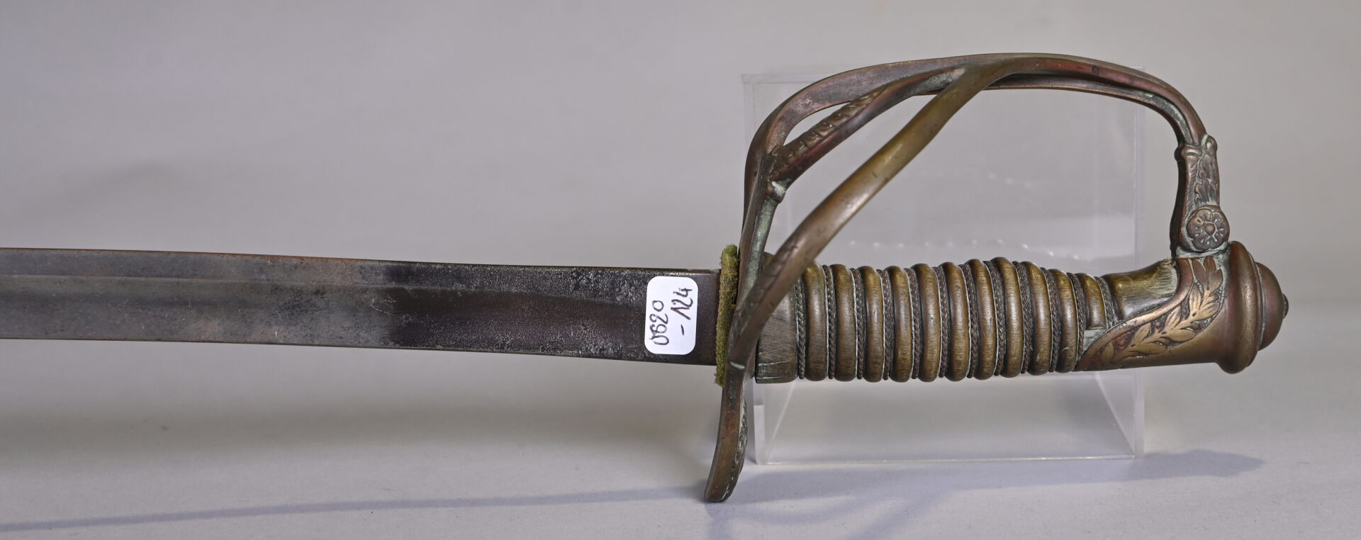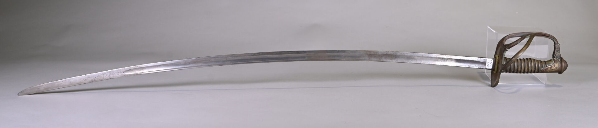 Sabre 1822 de cavalerie légère, issu de l’industrie privée. Lame courbe à gorge et dos plats. Monture en bronze doré ciselé. Calotte à courte queue. Branche de garde principale se subdivisant en deux brins arqués en S joignant le plateau. Pas de fourreau. Lame légèrement faussée à la pointe. État 2.