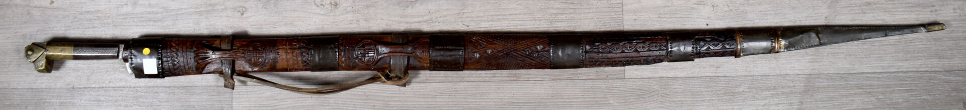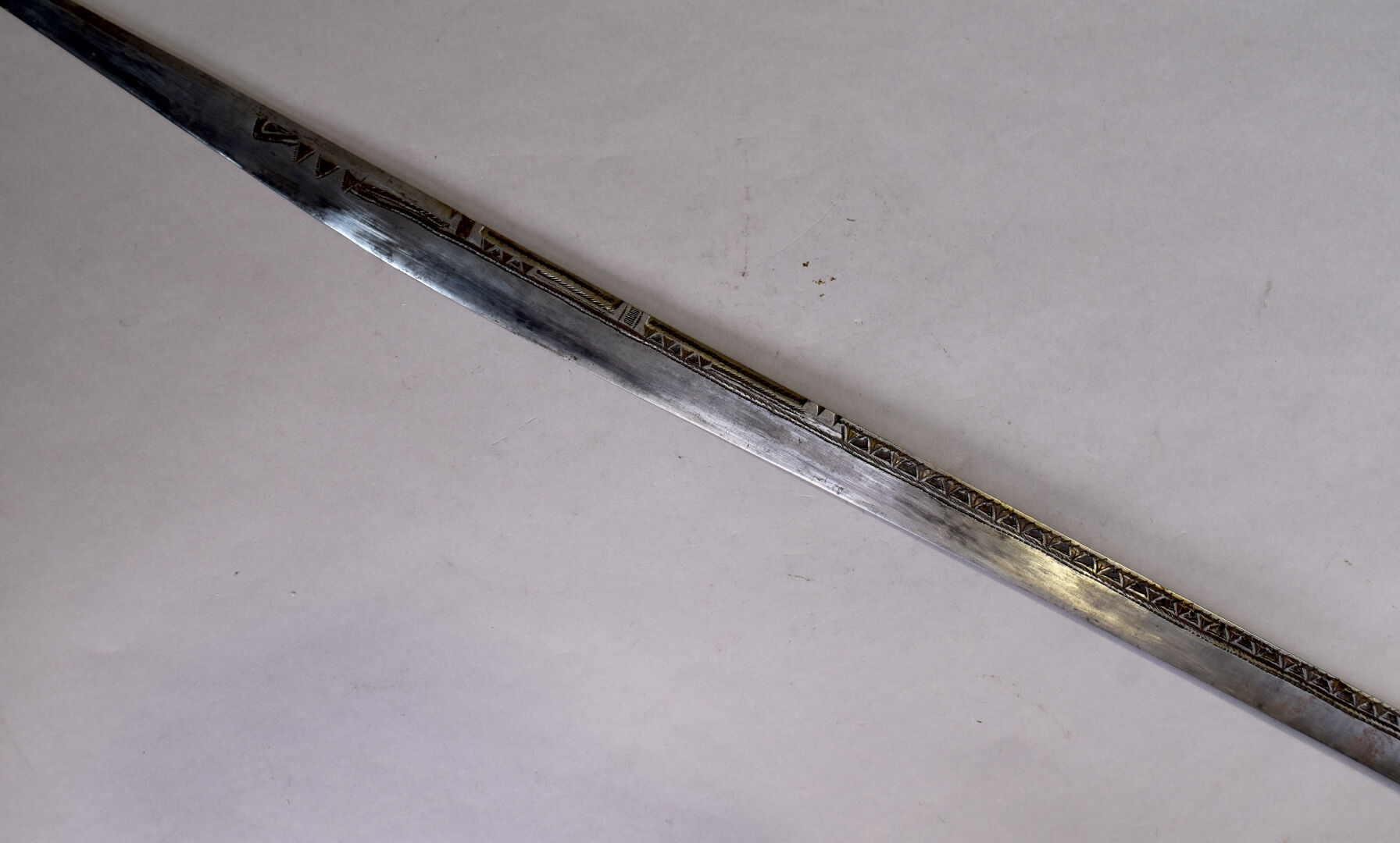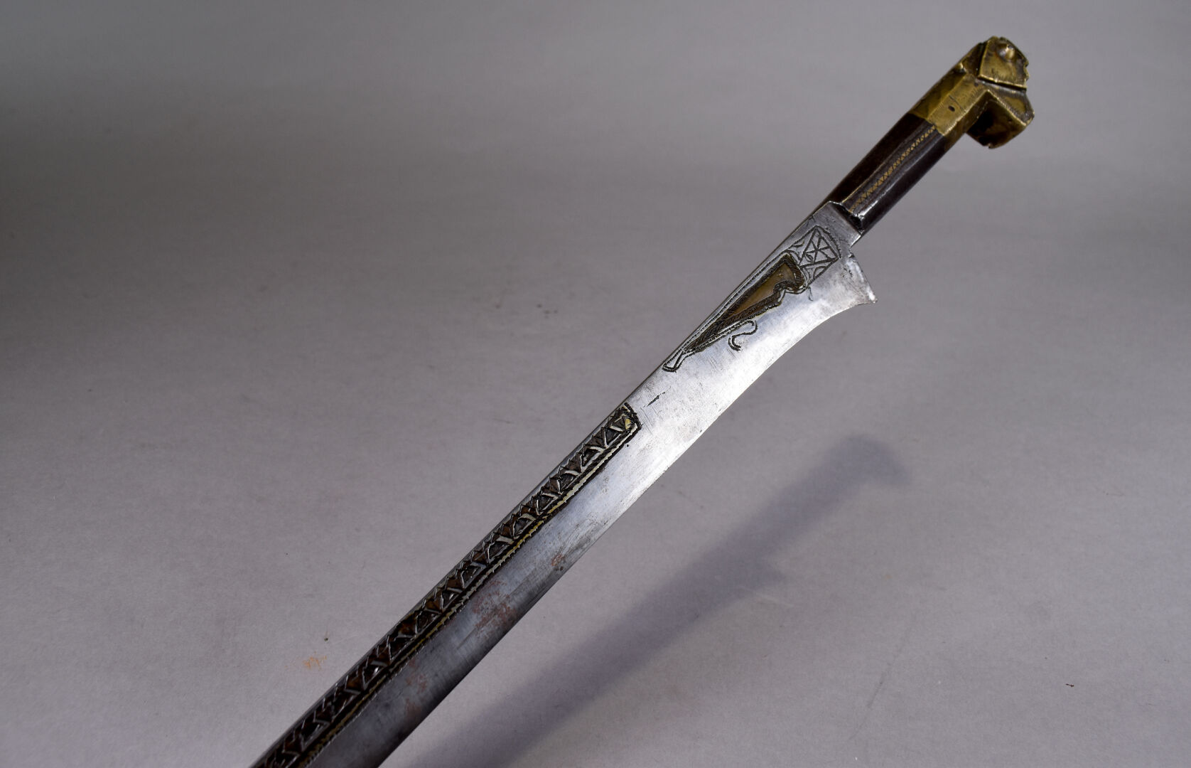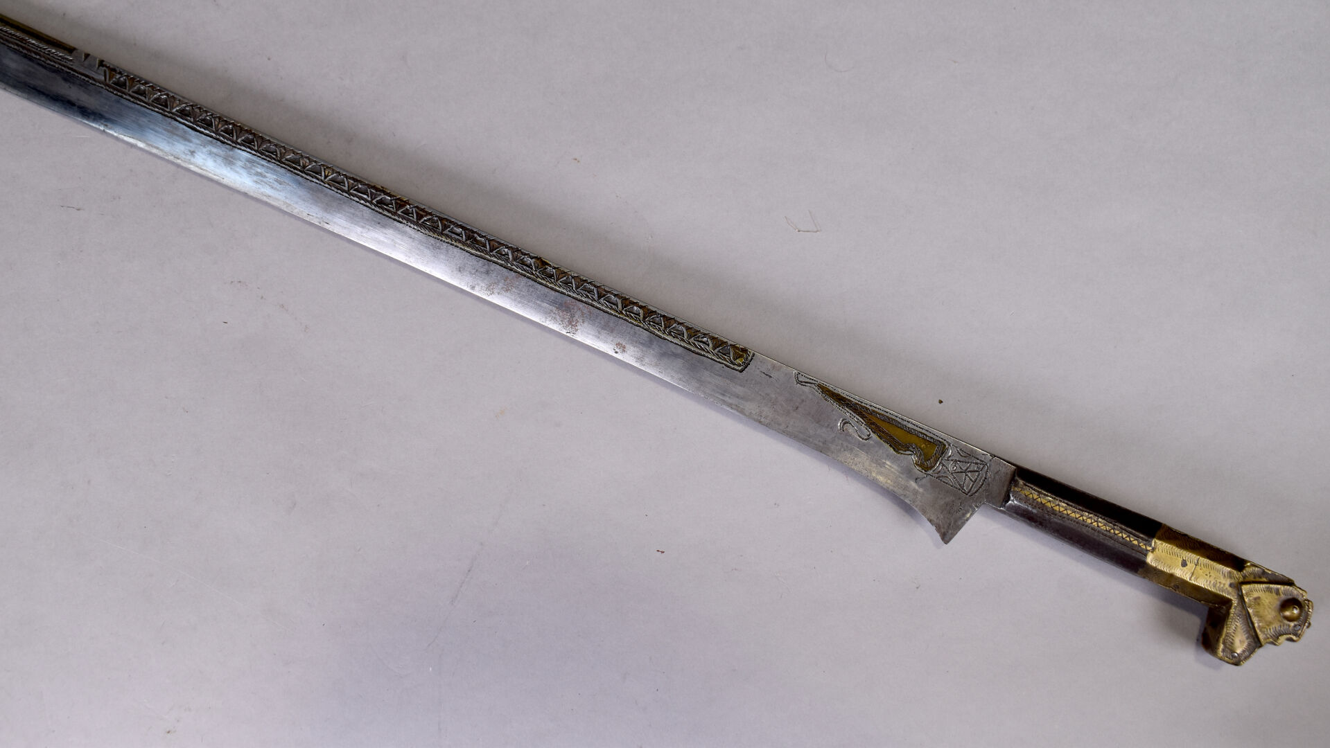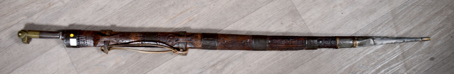 Sabre d’Afrique du nord Kabyle dit « Flissa », la lame gravée. Fourreau en cuivre et bois. Long. : 119 cm.