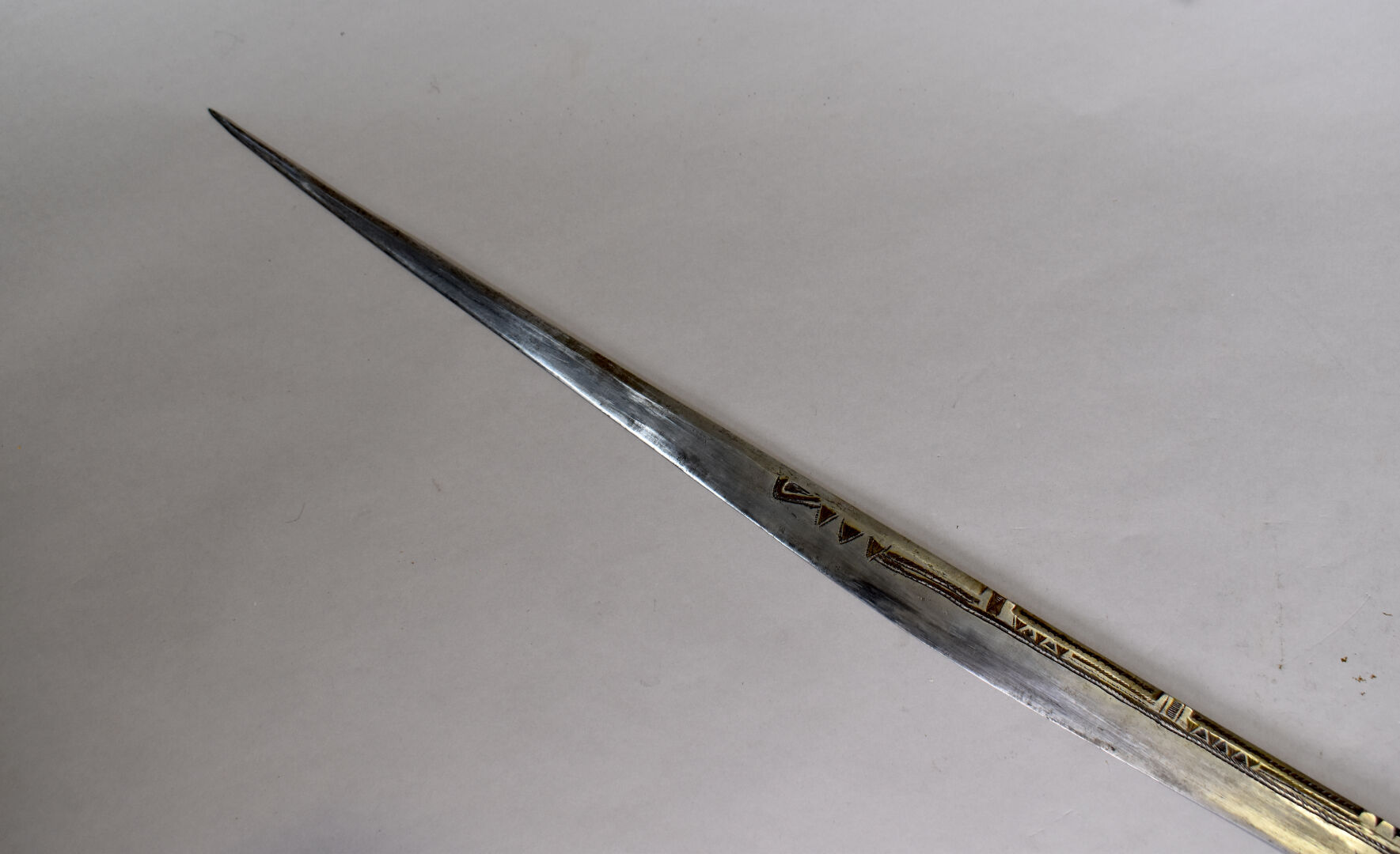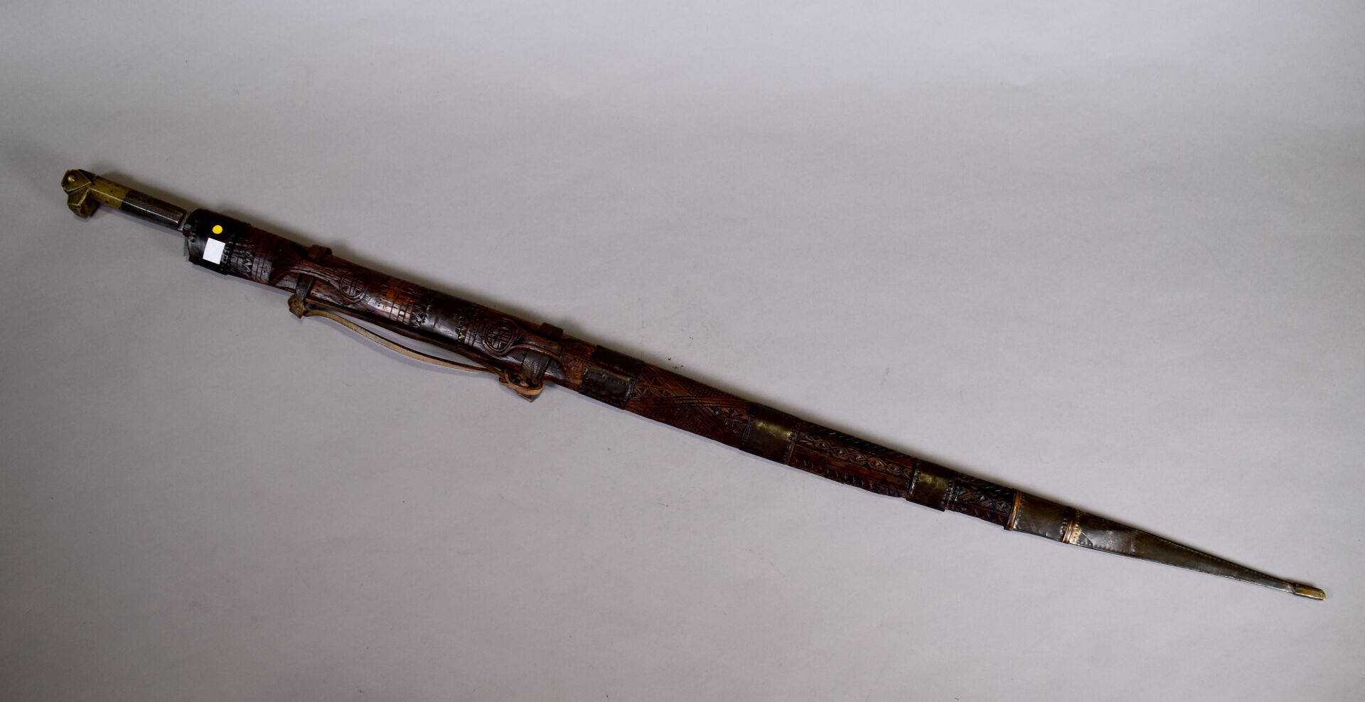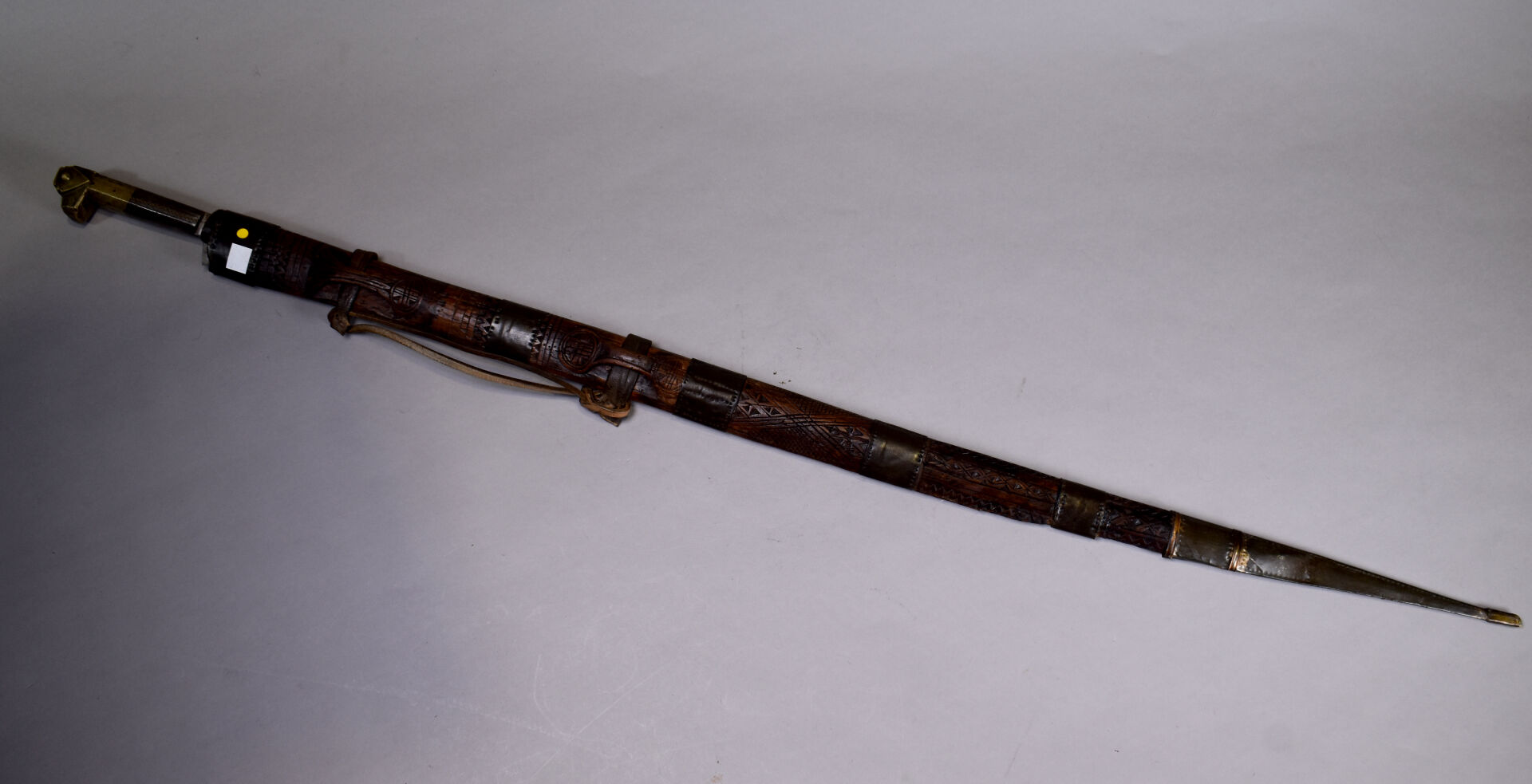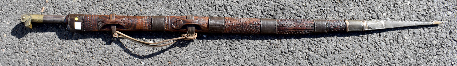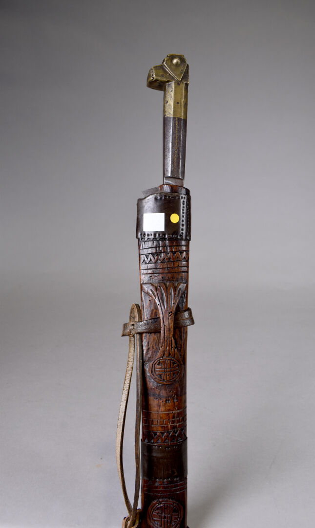 Sabre d’Afrique du nord Kabyle dit « Flissa », la lame gravée. Fourreau en cuivre et bois. Long. : 119 cm.
