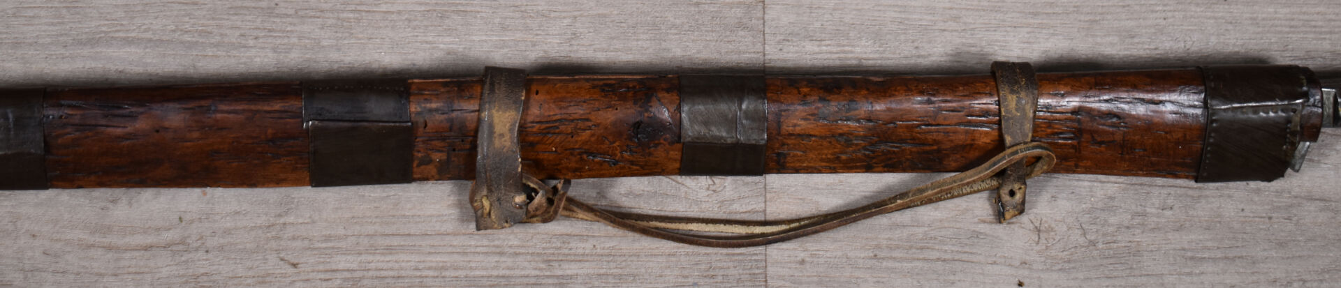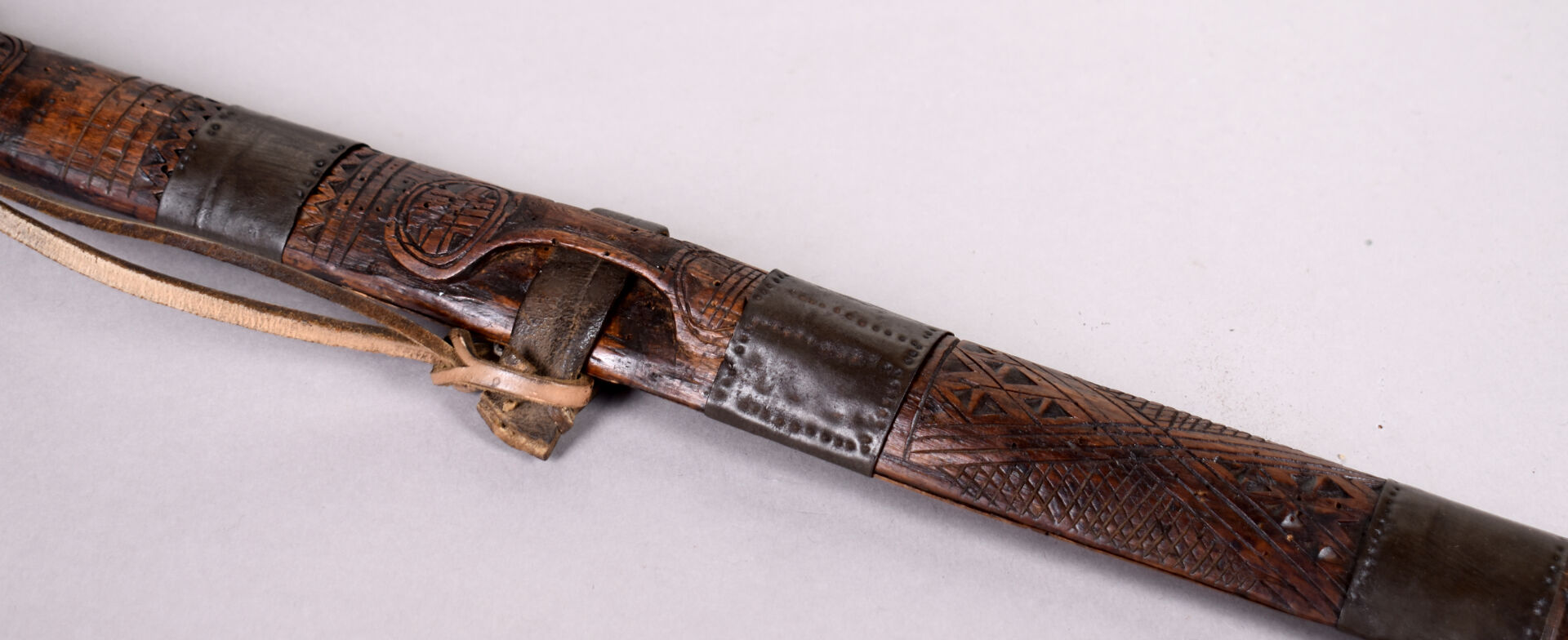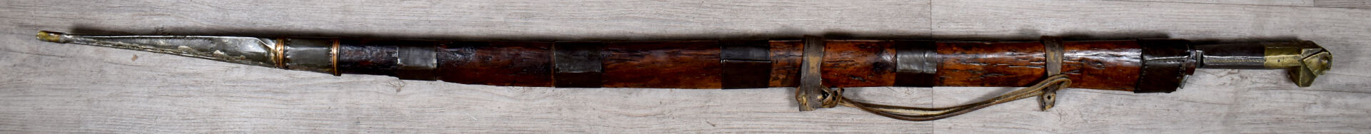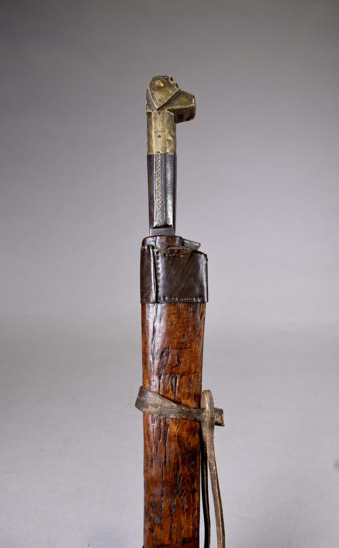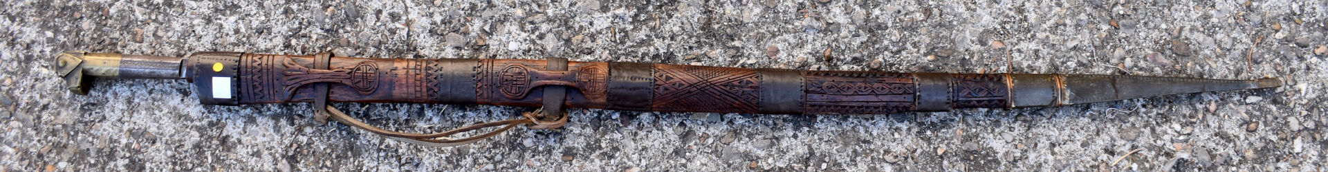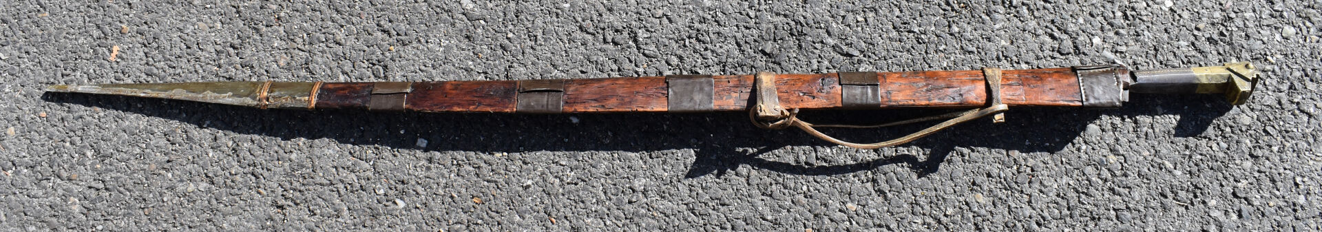 Sabre d’Afrique du nord Kabyle dit « Flissa », la lame gravée. Fourreau en cuivre et bois. Long. : 119 cm.