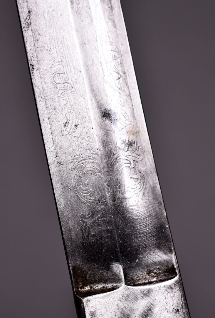 Sabre de cavalerie Allemande à la Blücher issu de l’industrie privée (Eickhorn Solingen) lame gravée à l’acide, ce sabre avec son fourreau à été brossé ce qui a endommagé les gravures, fusée filigranée habillée de galuchat. Vers 1890. Etat 2