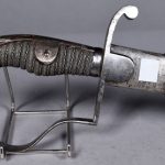 Sabre de cavalerie Allemande à la Blücher issu de l’industrie privée (Eickhorn Solingen) lame gravée à l’acide, ce sabre avec son fourreau à été brossé ce qui a endommagé les gravures, fusée filigranée habillée de galuchat. Vers 1890. Etat 2 Expert : M. Gilles SIGRO.