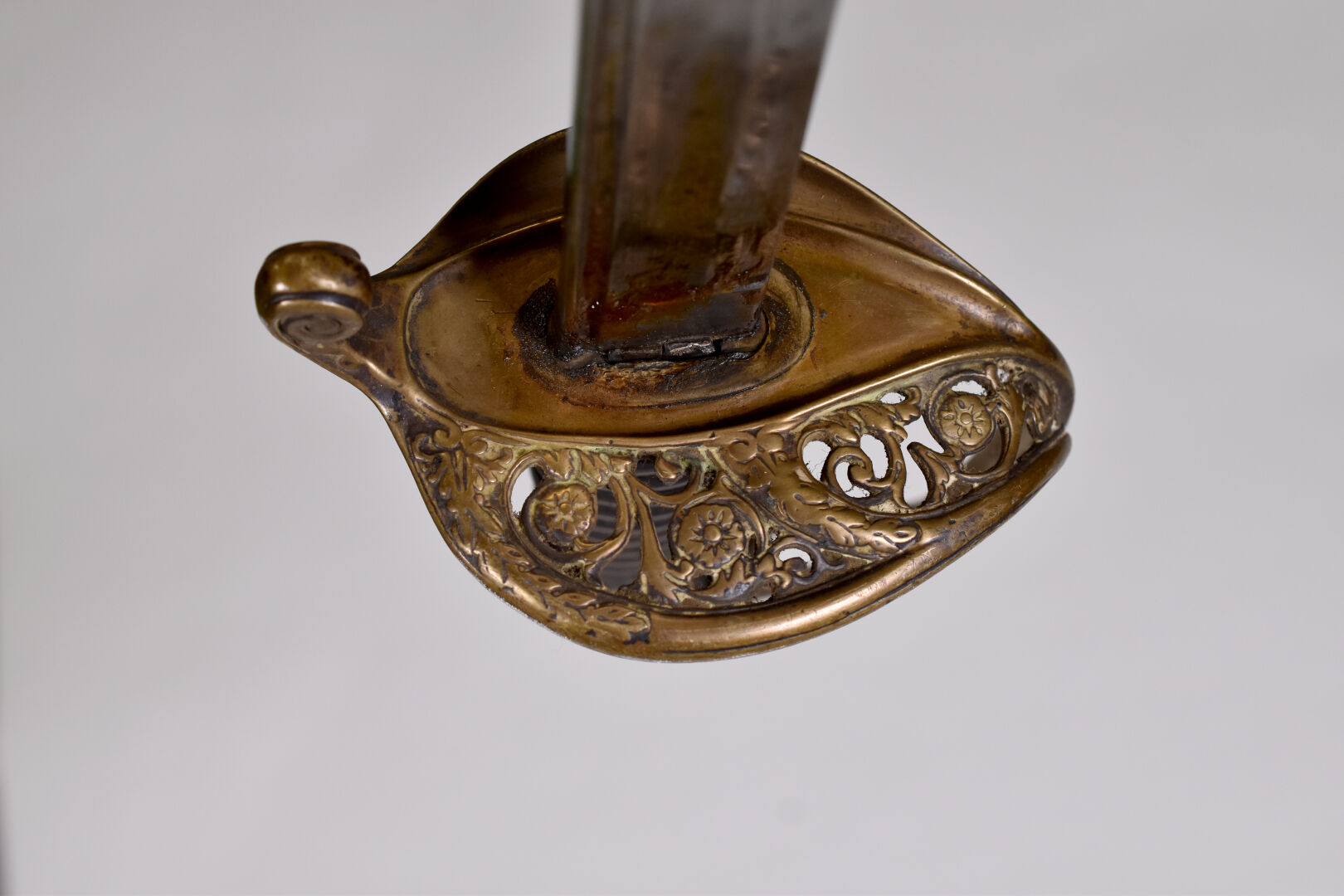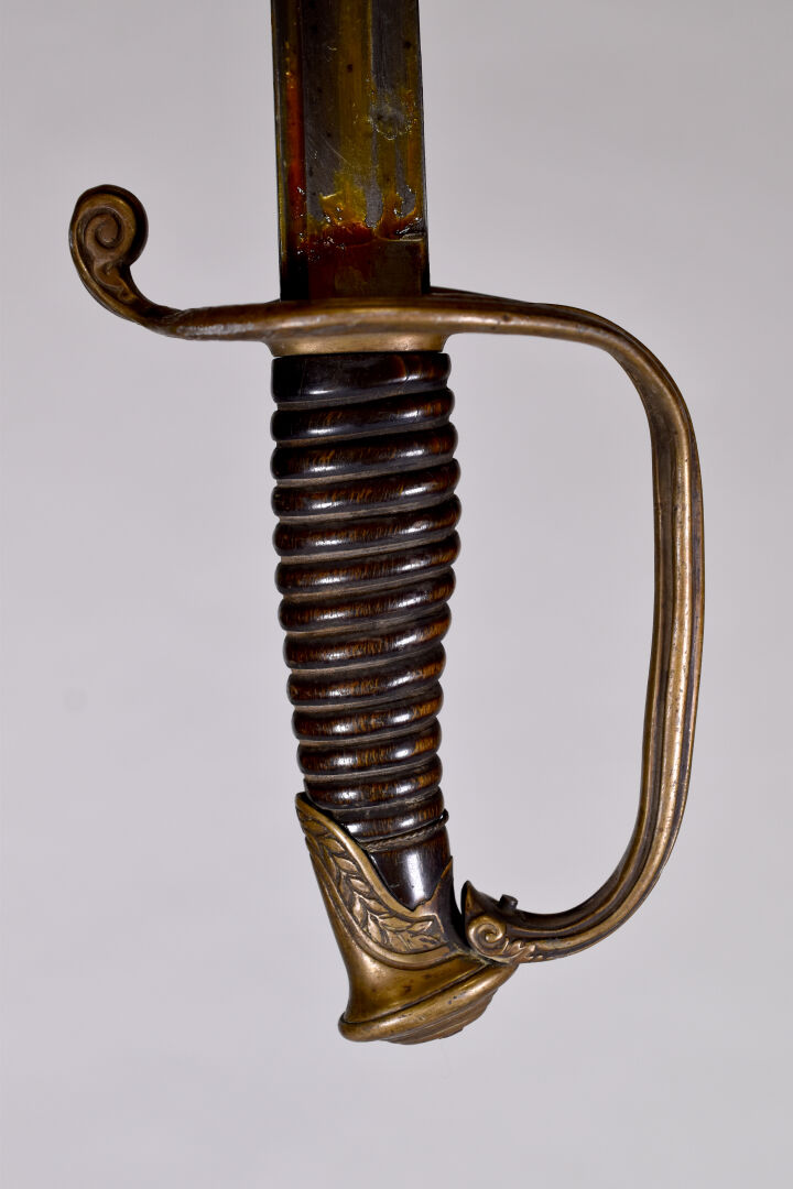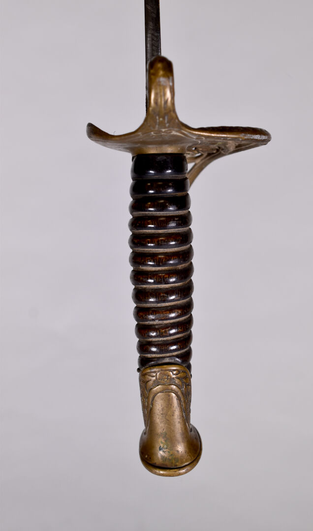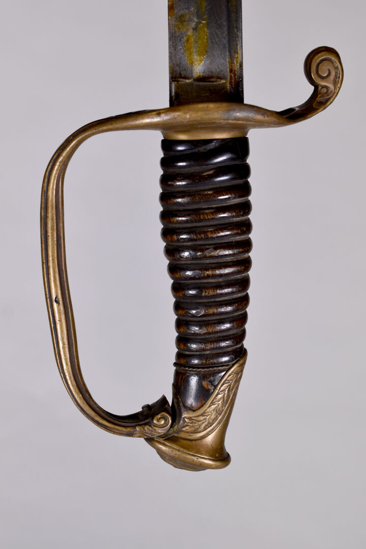 Sabre modèle 1845 d’adjudant. Lame signée au dos (marquage illisible) et monture en bronze doré ciselé. Fusée corne sombre, et filigrane absent. Dans son fourreau en tôle d’acier à deux bracelets. État 2.