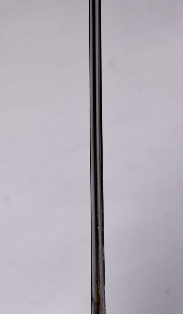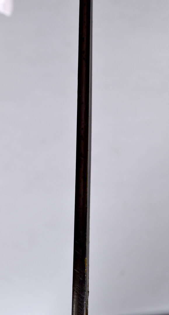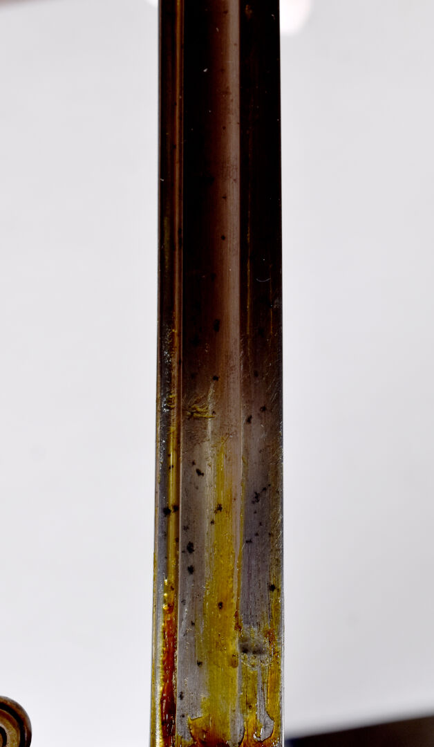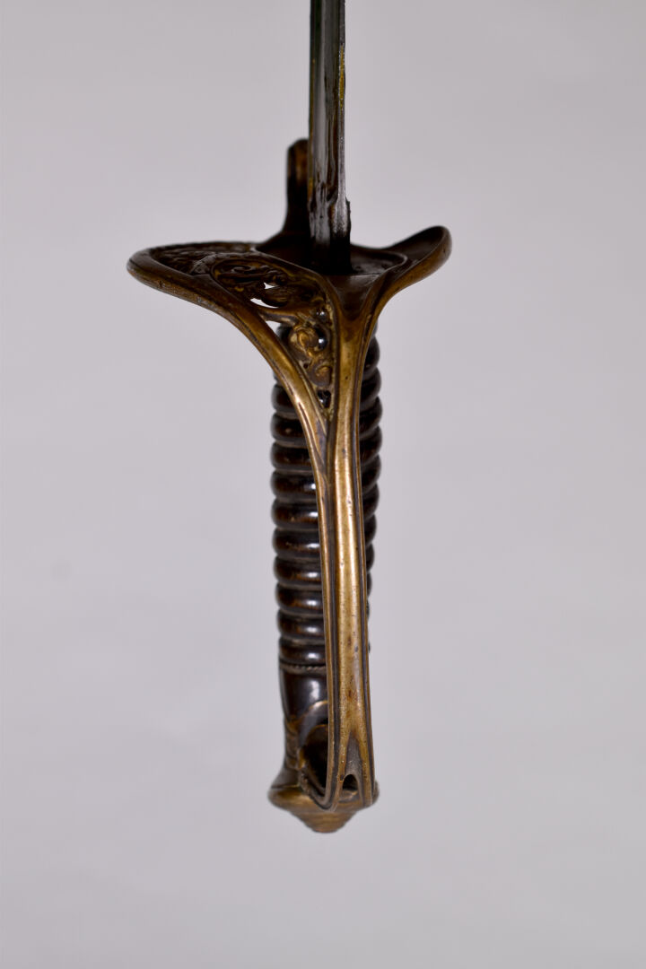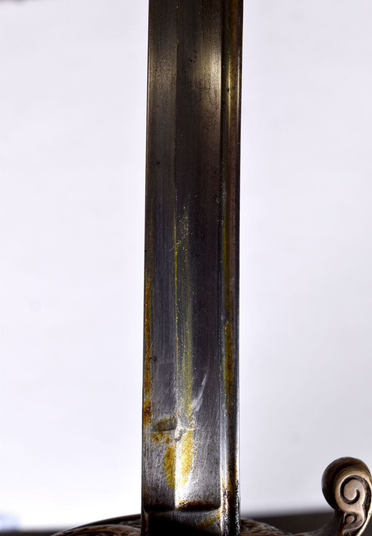Sabre modèle 1845 d’adjudant. Lame signée au dos (marquage illisible) et monture en bronze doré ciselé. Fusée corne sombre, et filigrane absent. Dans son fourreau en tôle d’acier à deux bracelets. État 2.