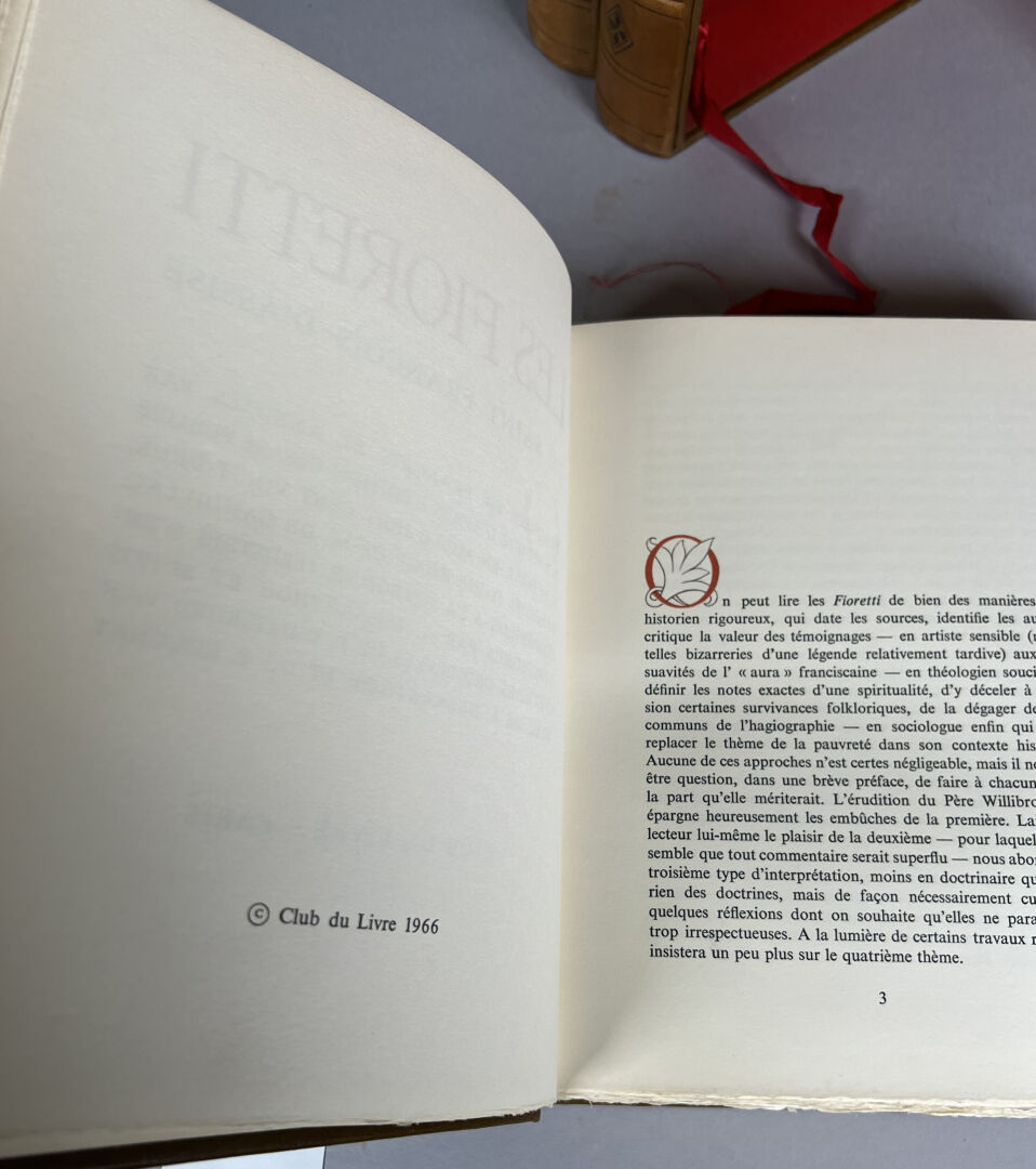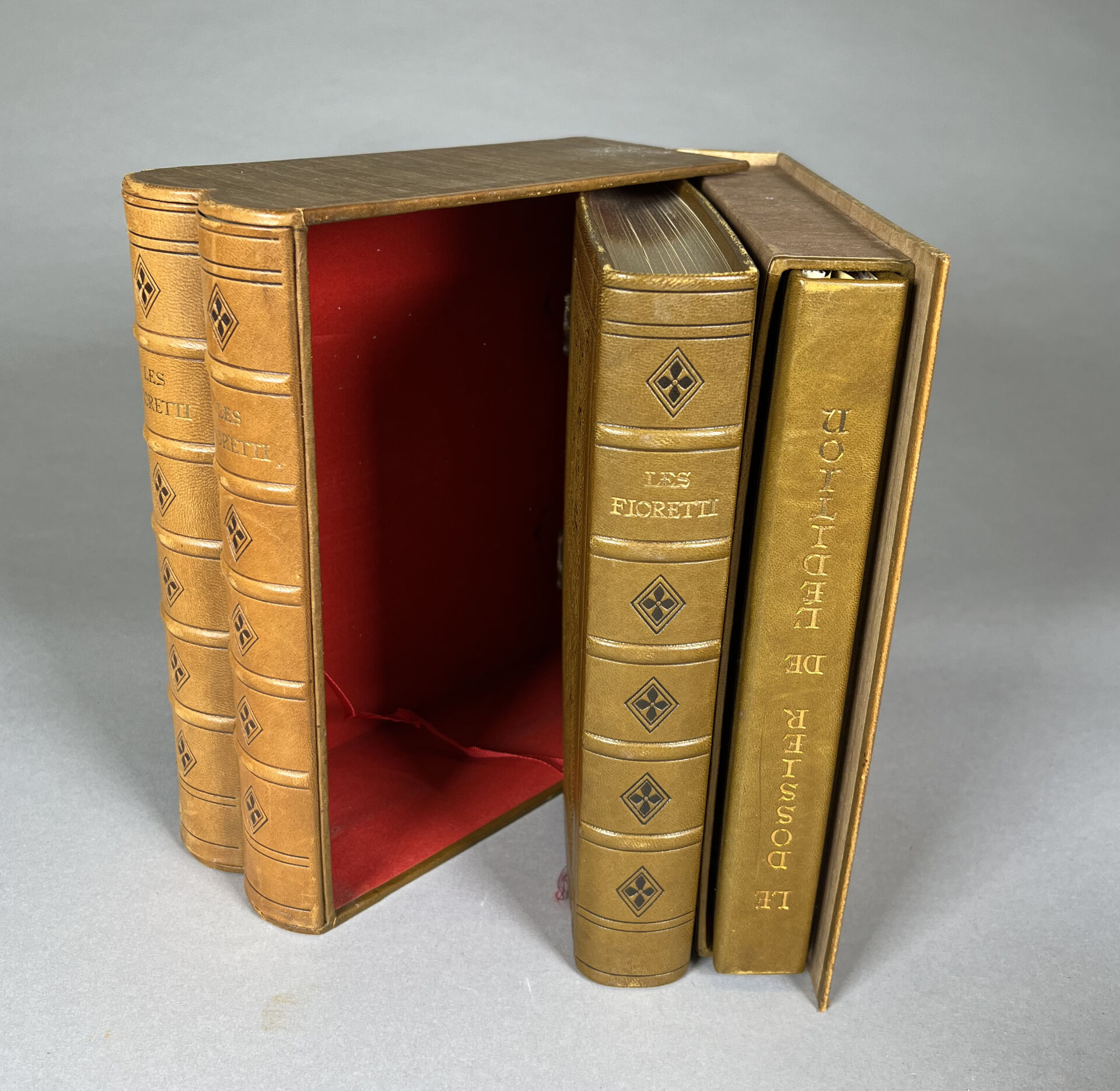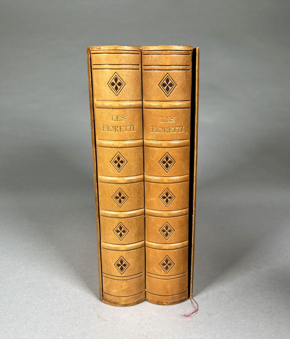 SAINT FRANCOIS D’ASSISE Les Fioretti. Edition Club du livre Paris, 1966. 1 Vol In-8, Tranche dorée, illustrations pleine page et dans le texte en couleurs par A. Dussarthou. Reliure en maroquin havane à décor à froid. Dos à nerfs et caissons ornés. Exemplaire numéroté 1230, Accompagnée d’un Dossier de l’édition Emboitage façon bois.