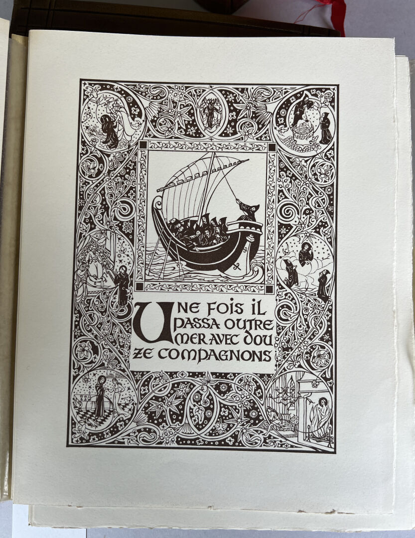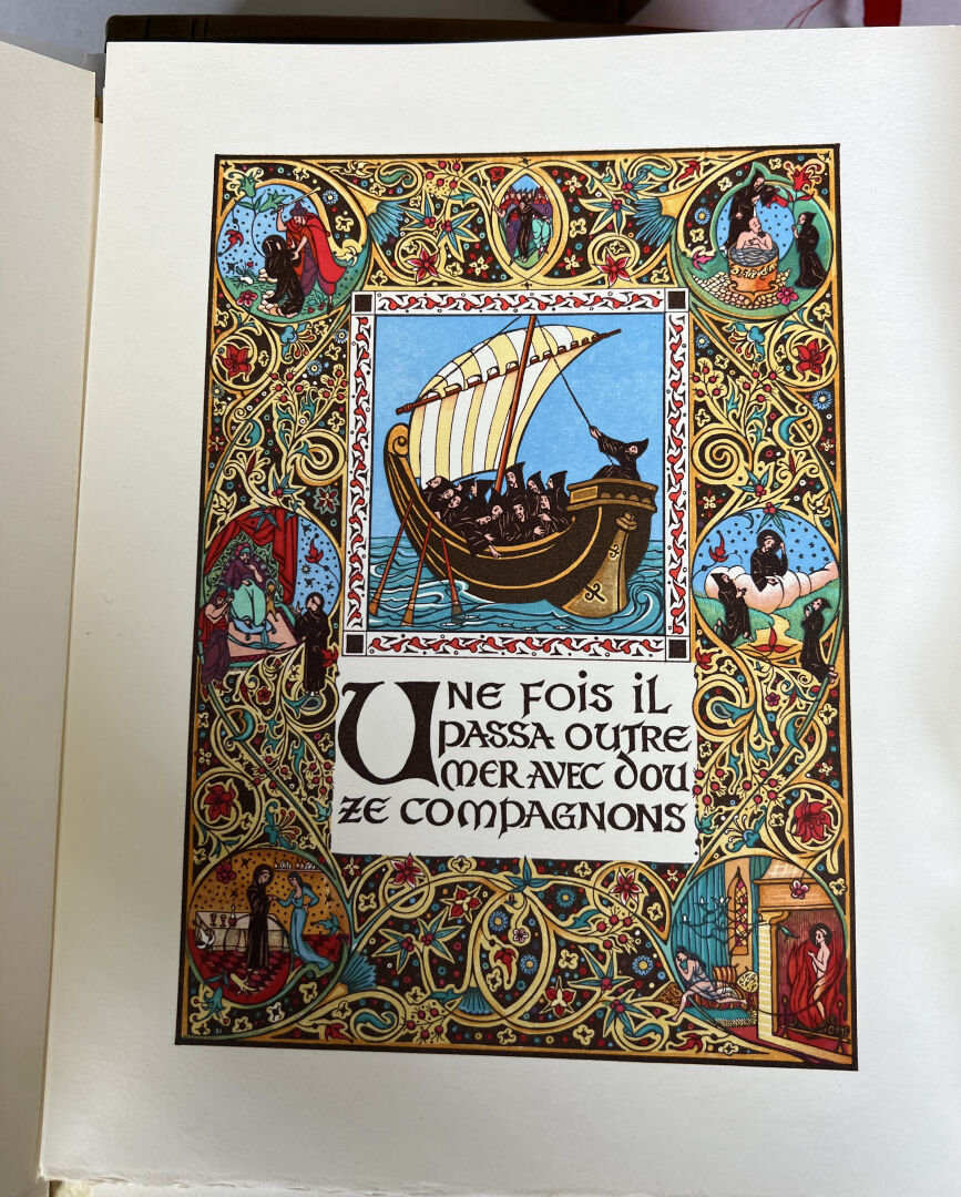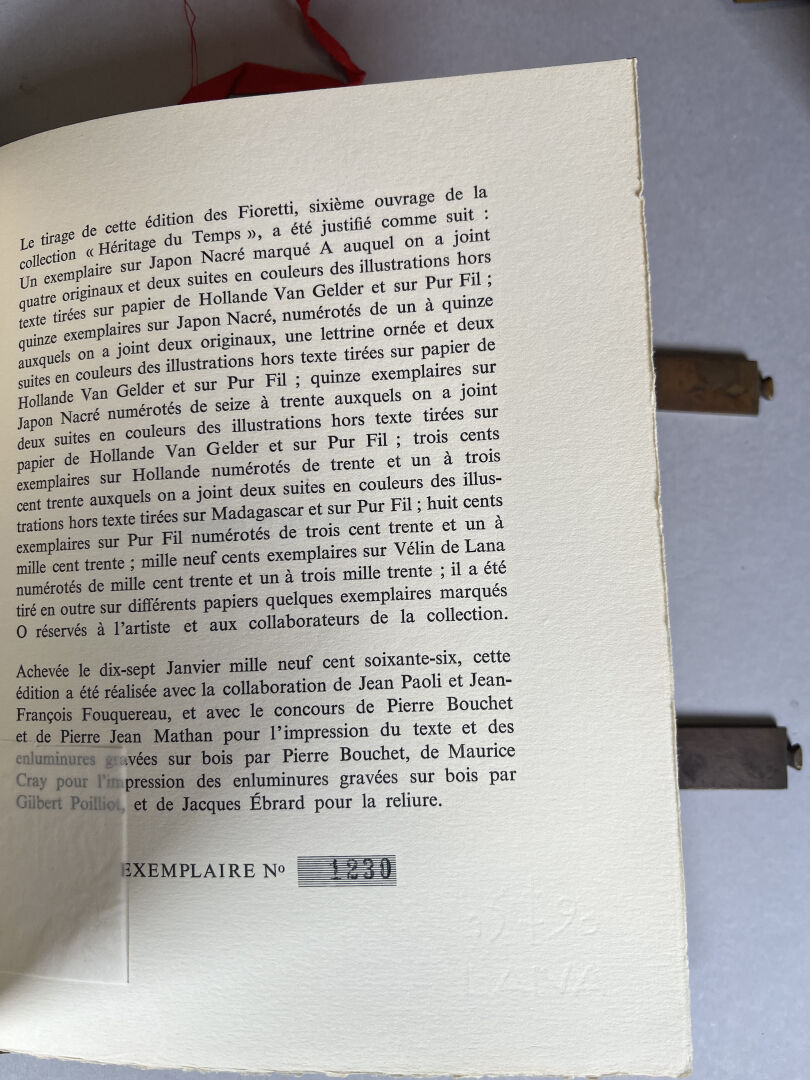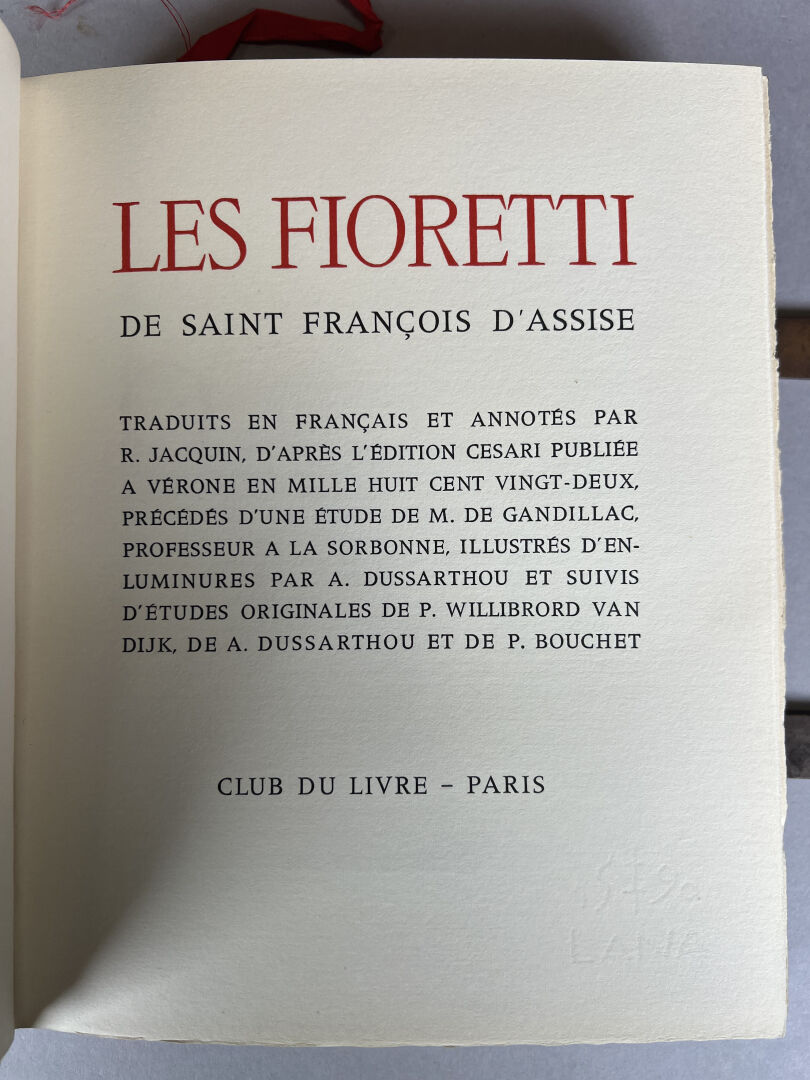 SAINT FRANCOIS D’ASSISE Les Fioretti. Edition Club du livre Paris, 1966. 1 Vol In-8, Tranche dorée, illustrations pleine page et dans le texte en couleurs par A. Dussarthou. Reliure en maroquin havane à décor à froid. Dos à nerfs et caissons ornés. Exemplaire numéroté 1230, Accompagnée d’un Dossier de l’édition Emboitage façon bois.