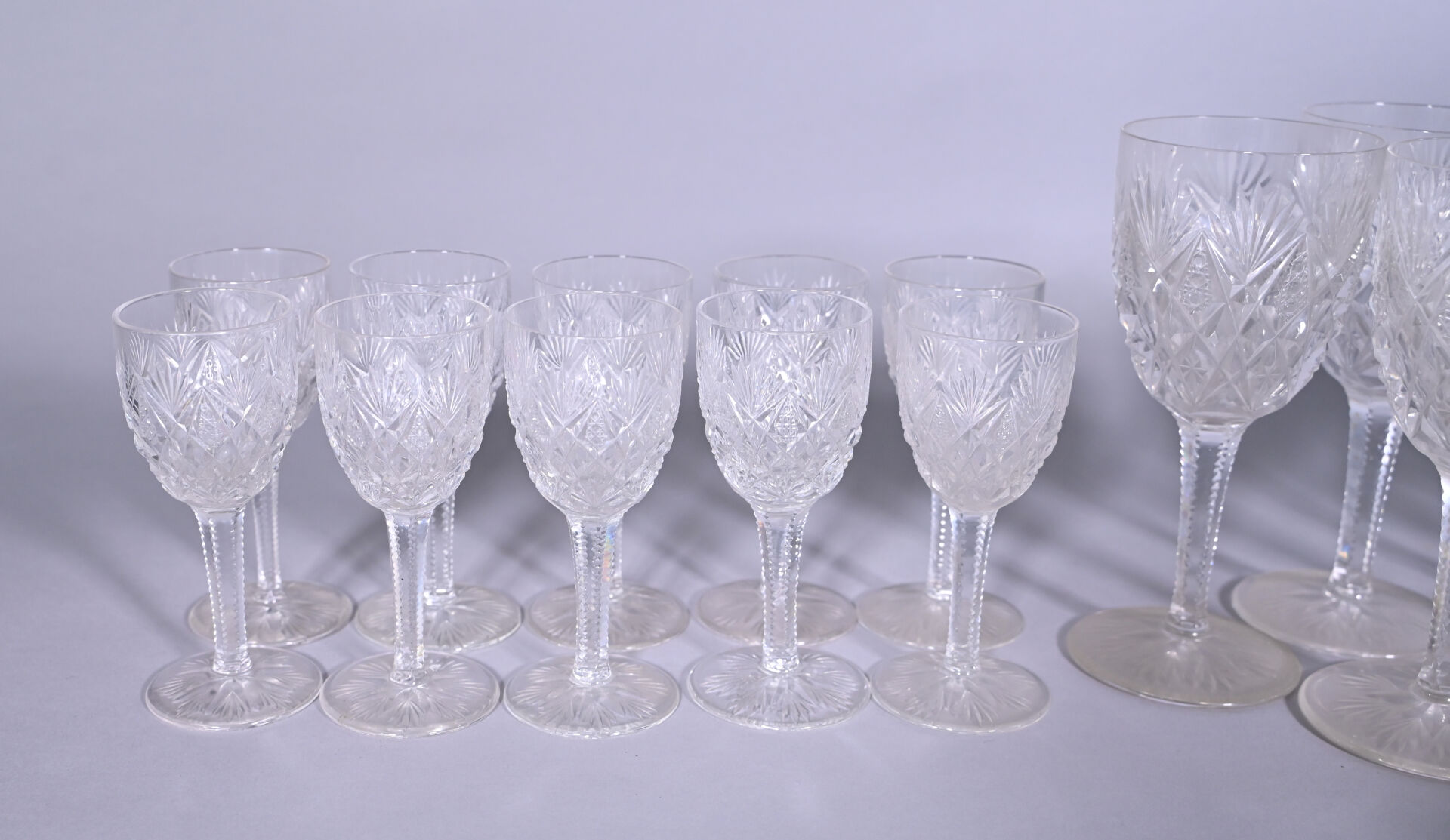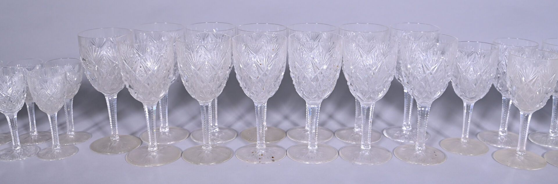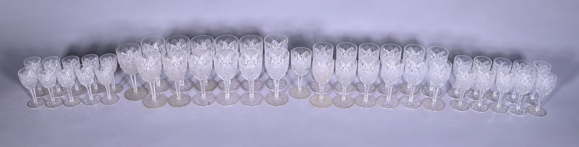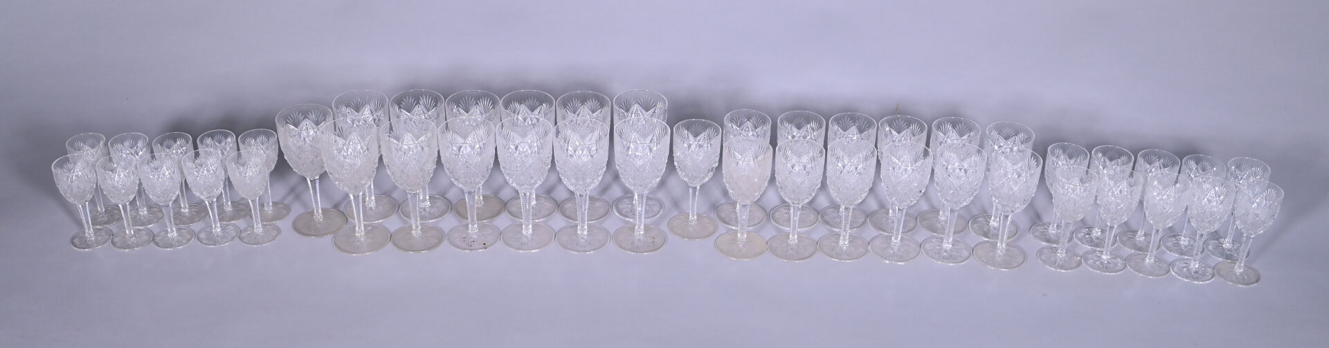 SAINT-LOUIS. Partie de service de verres à pied en cristal à décor gravé à la roue soit 13 verres à eau, 13 verres à vin rouge, 10 verres à vin blanc, 10 verres à Porto ou liqueur. Boites, certaines d’origine.