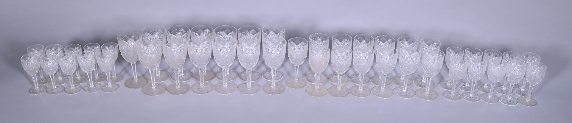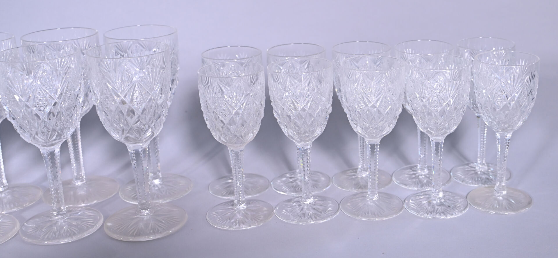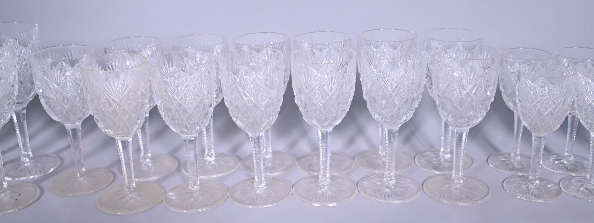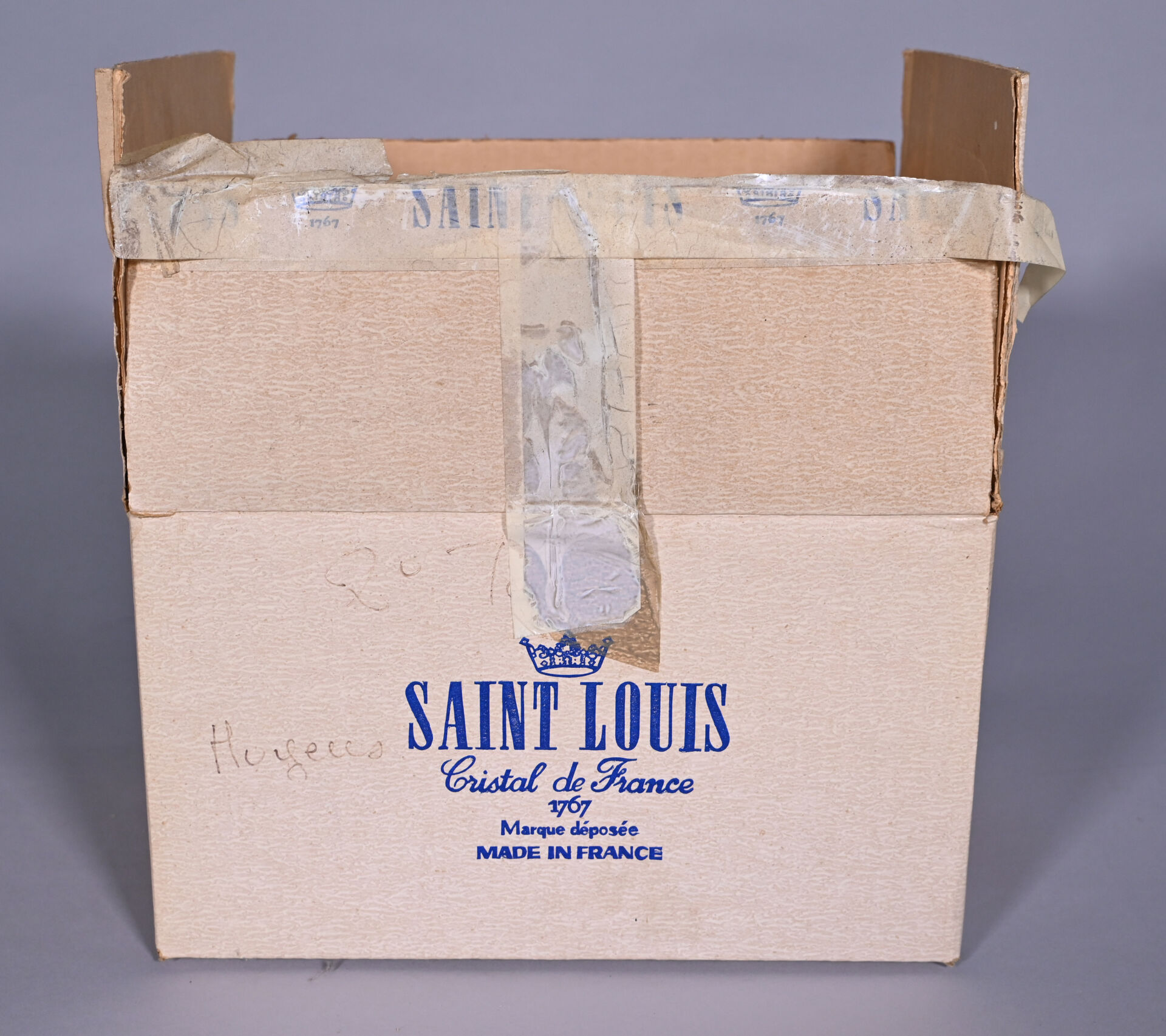 SAINT-LOUIS. Partie de service de verres à pied en cristal à décor gravé à la roue soit 13 verres à eau, 13 verres à vin rouge, 10 verres à vin blanc, 10 verres à Porto ou liqueur. Boites, certaines d’origine.