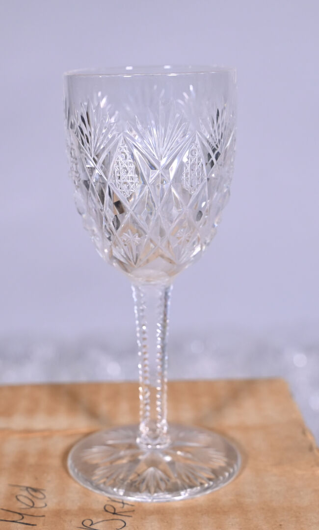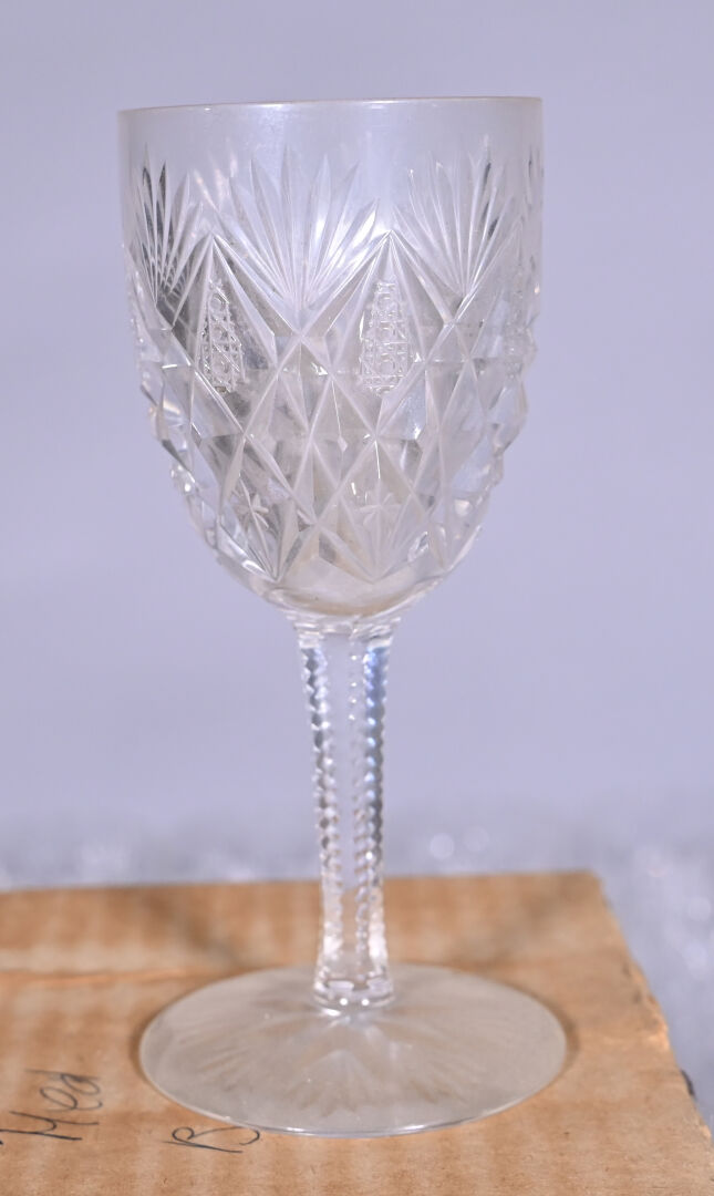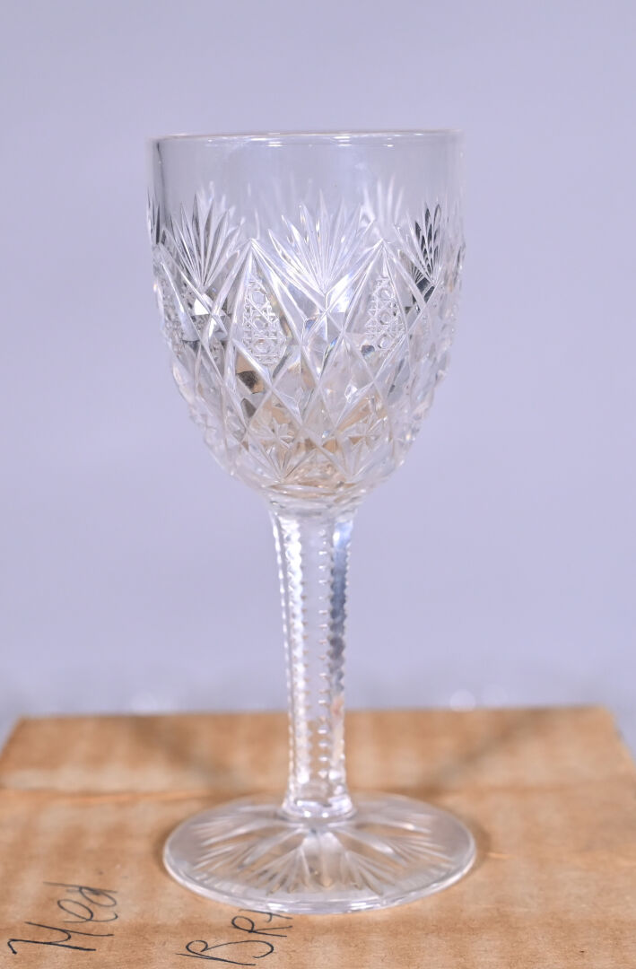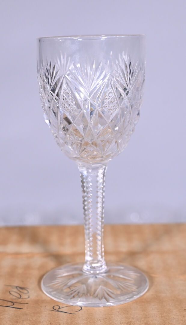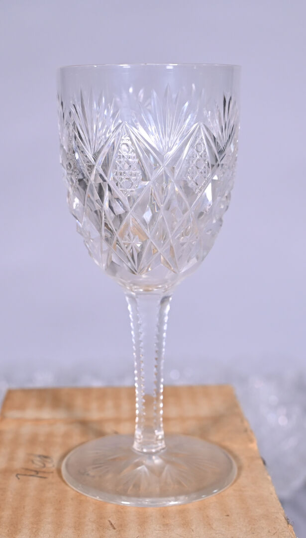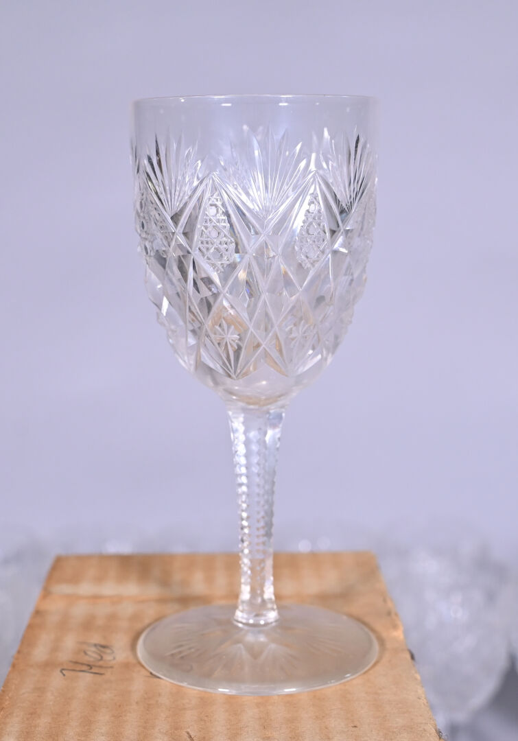 SAINT-LOUIS. Partie de service de verres à pied en cristal à décor gravé à la roue soit 13 verres à eau, 13 verres à vin rouge, 10 verres à vin blanc, 10 verres à Porto ou liqueur. Boites, certaines d’origine.