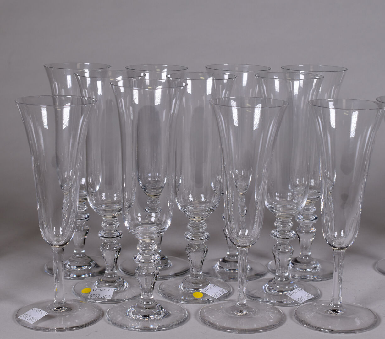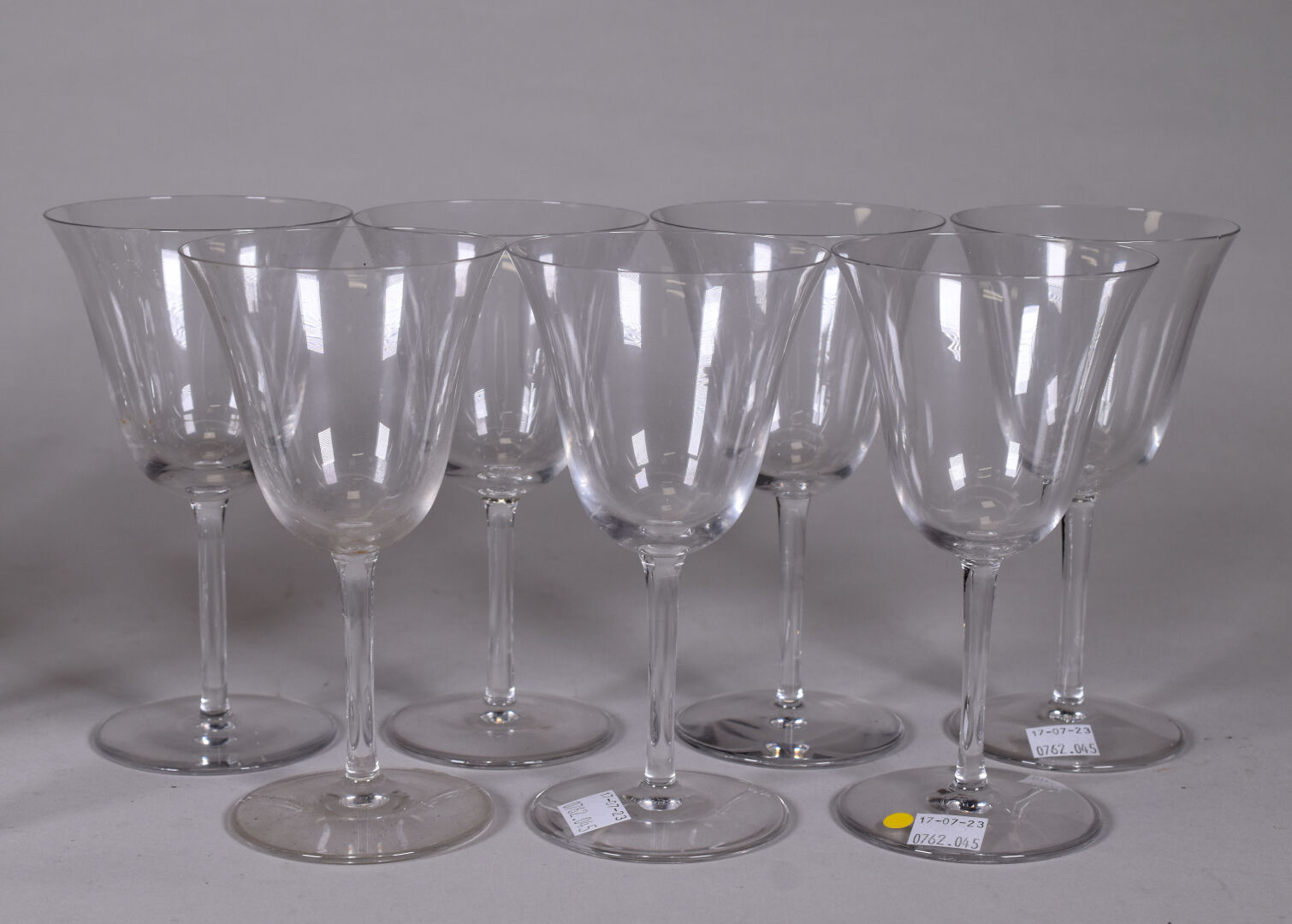 SAINT-LOUIS. Partie de service de verres à pied en cristal, modèle ? comprenant 7 verres à eau, 8 verres à vin et 3 flûtes (marqués au dessous). On joint : BACCARAT 8 flutes en cristal (marquées au dessous).