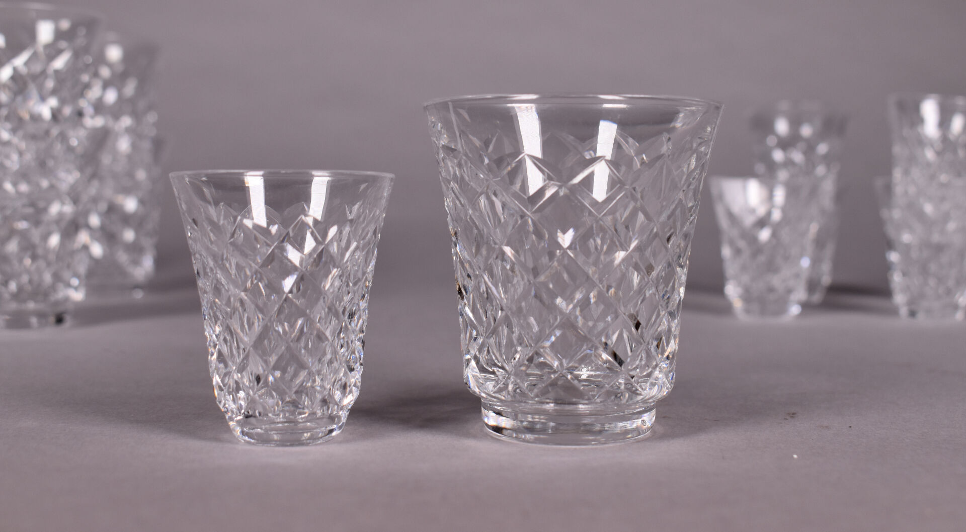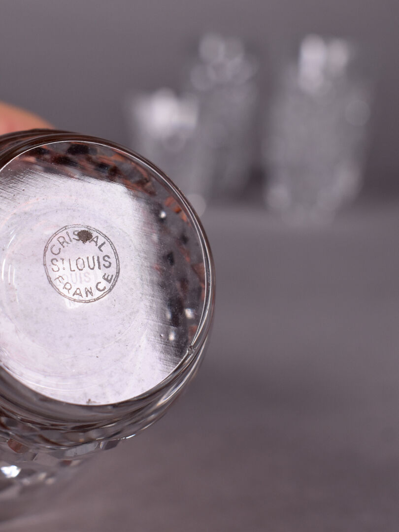 SAINT LOUIS. Partie de service de verres en cristal modèle ? en cristal à décor gravé de croisillons comprenant 8 verres à liqueur et 8 verres à Porto. Marqués. Haut. : 5,5 cm et 7 cm.