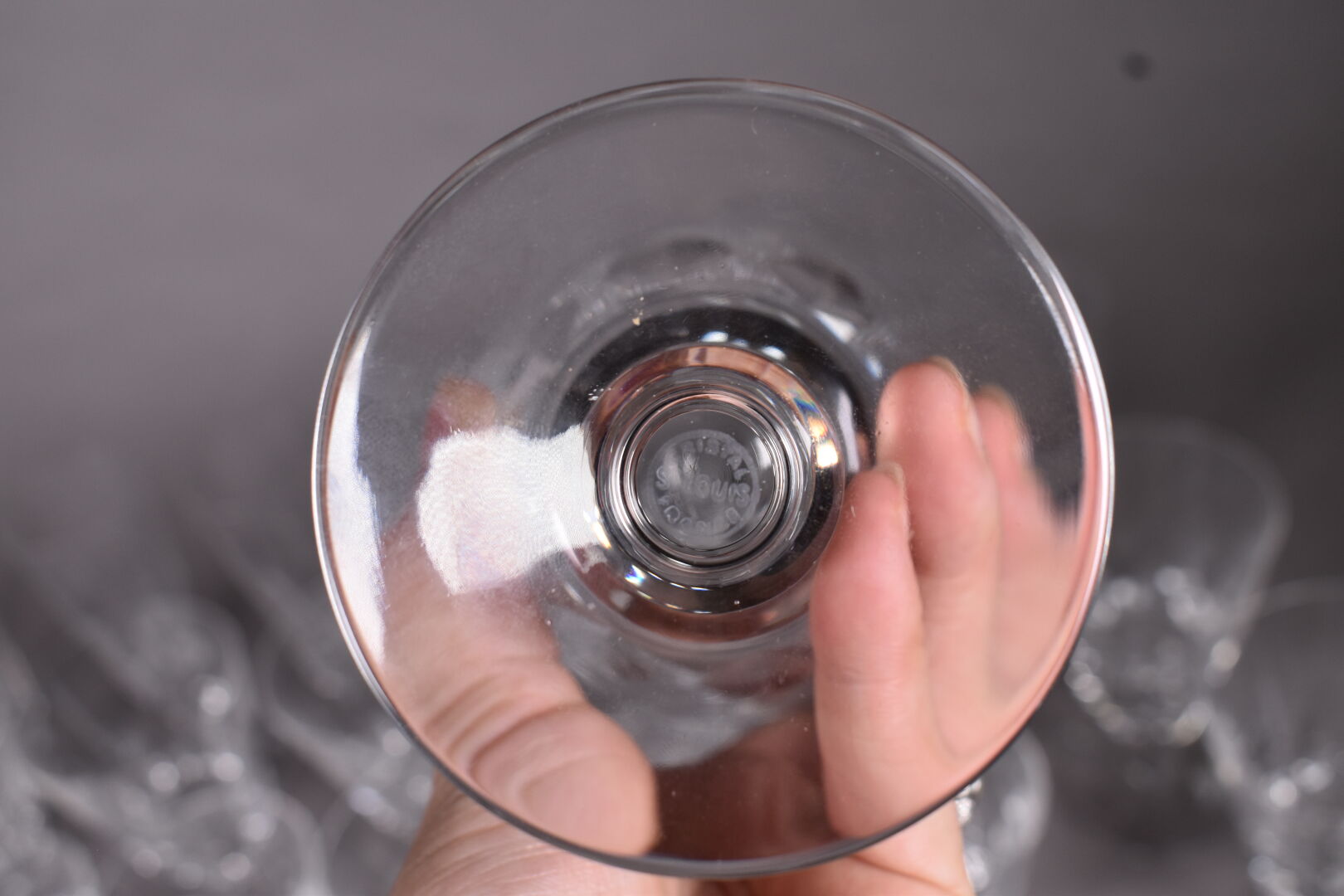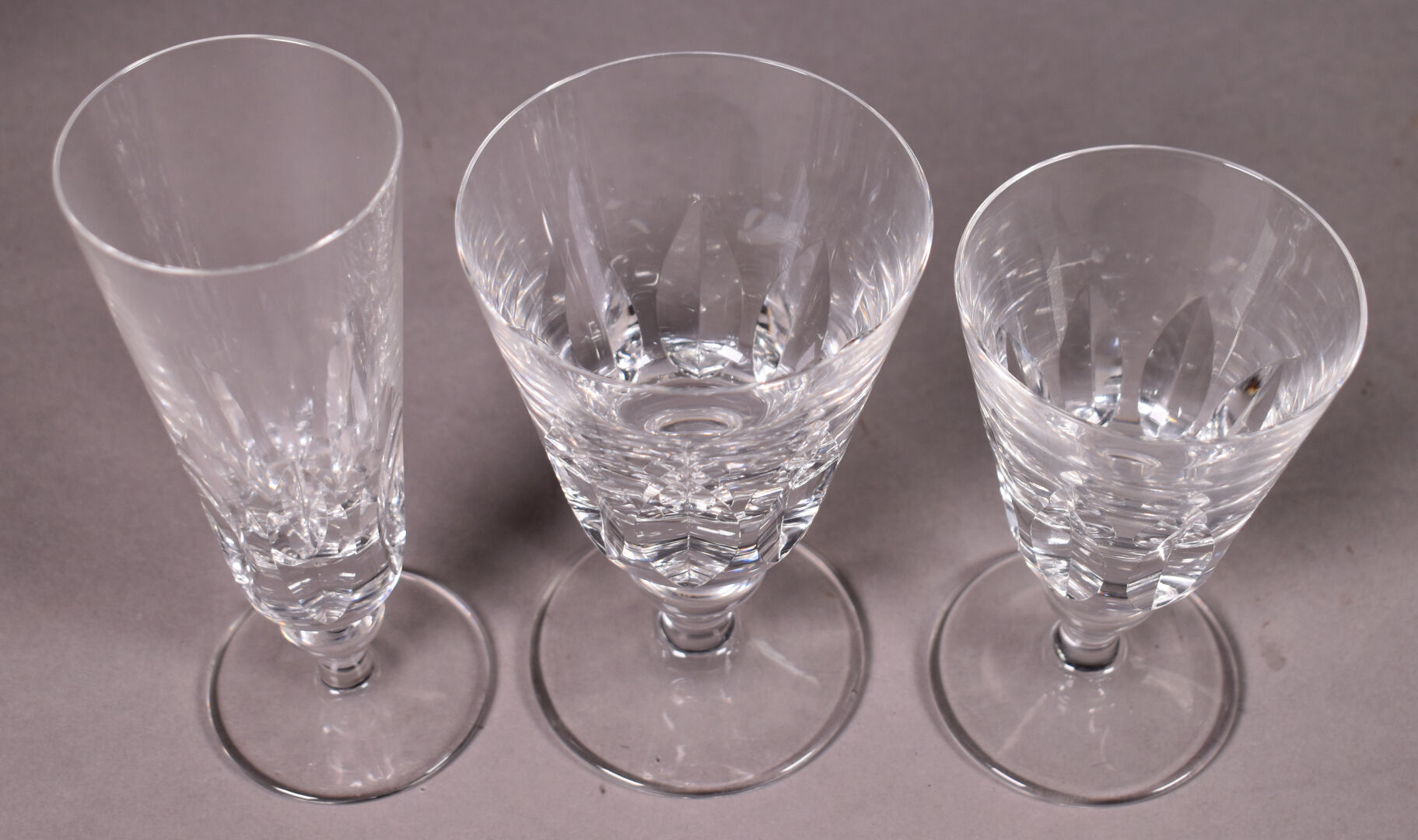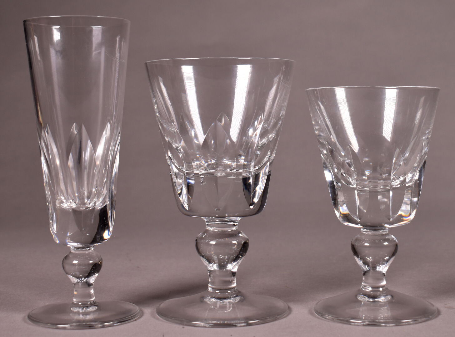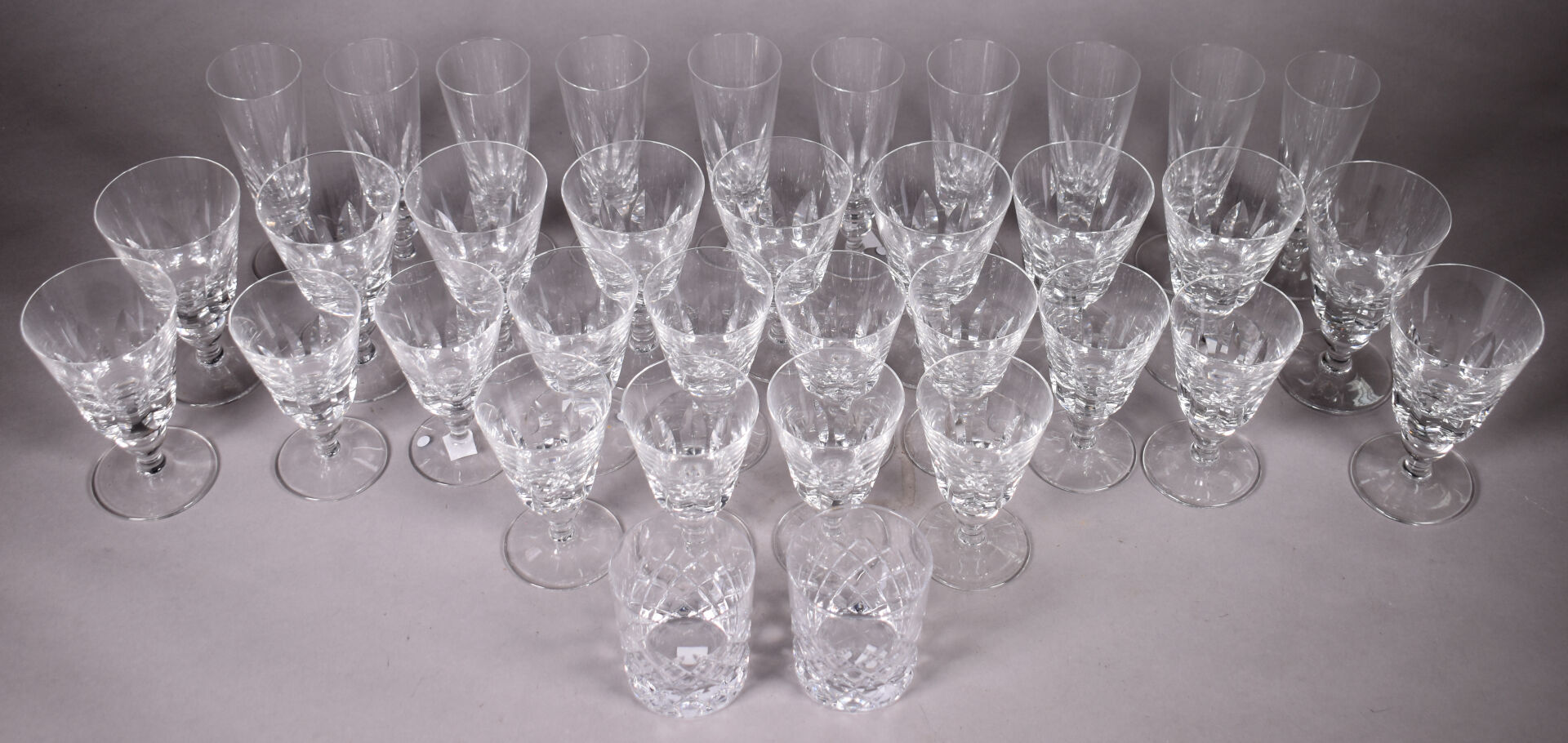 SAINT LOUIS. Partie de service de verres en cristal modèle « JERSEY » comprenant : – 11 verres à eau ( Haut. : 15 cm) – 12 verres à vin (3 égrenures et un fèle) – (Haut. : 13 cm ) – 10 flûtes à champagne (Haut. : 17 cm). On joint deux verres à whisky d’une autre manufacture en cristal taillé.