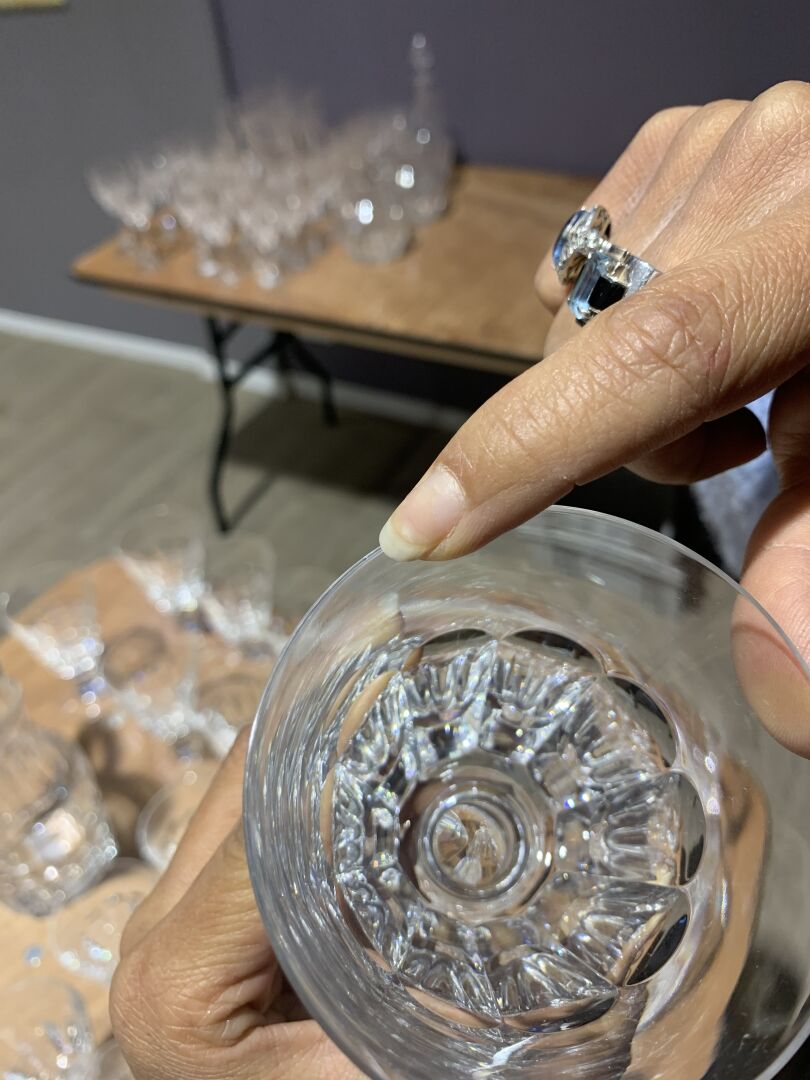 SAINT-LOUIS. Partie de service en cristal modèle Caton comprenant 12 verres à eau, 12 verres à vins, 10 flûtes à champagne et 1 carafe (petite égrenure sur un verre à vin). Marqué au dessous.