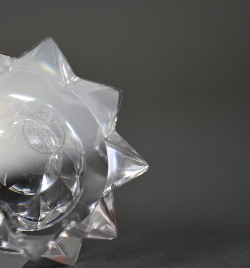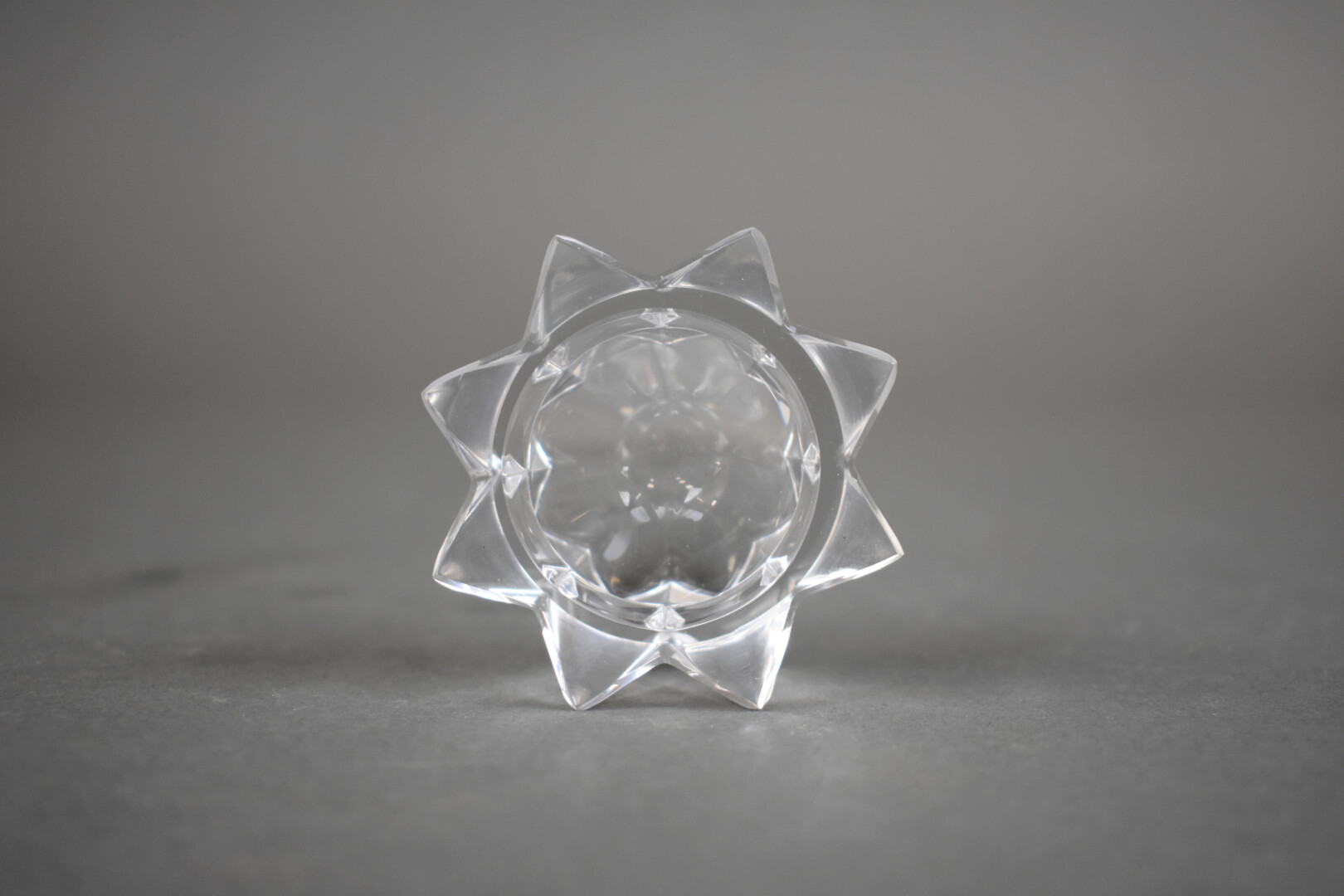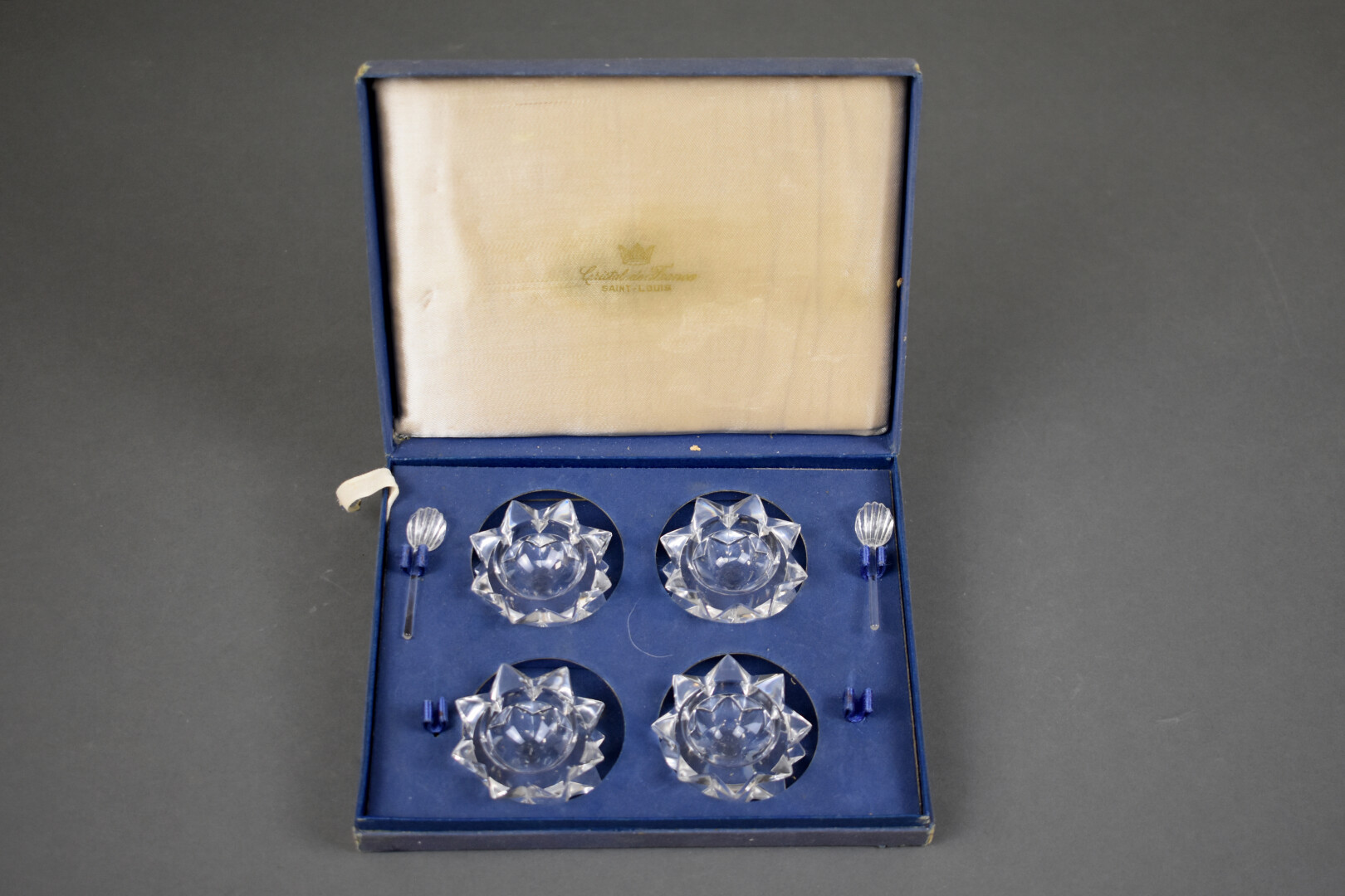 SAINT LOUIS. Suite de quatre salerons en cristal à pointes (un éclat) avec deux cuillères (manquent deux). Marqué au dessous Boîte.