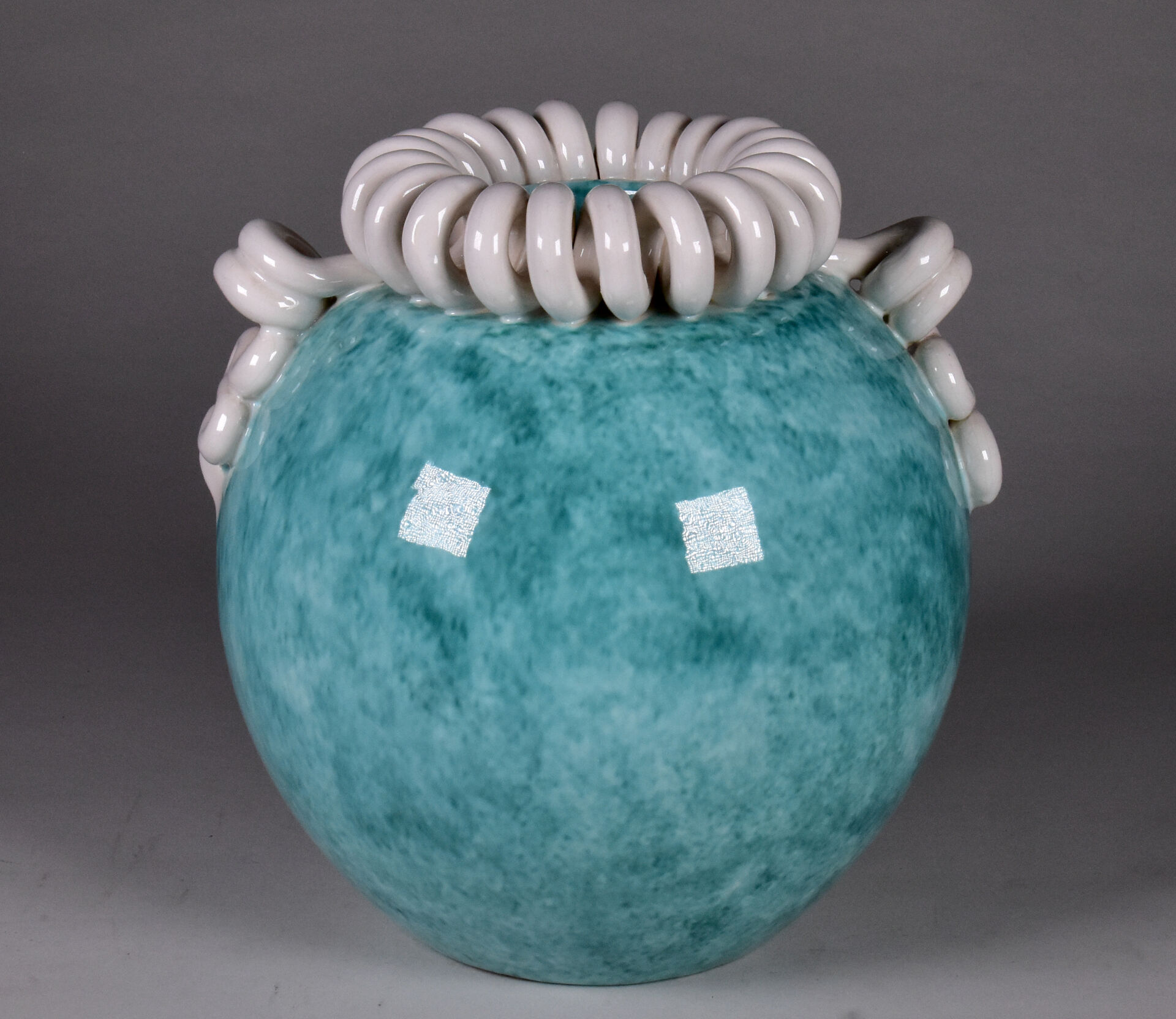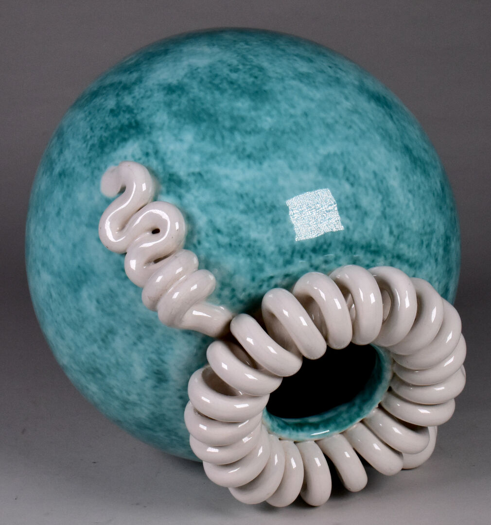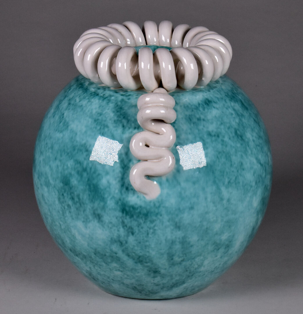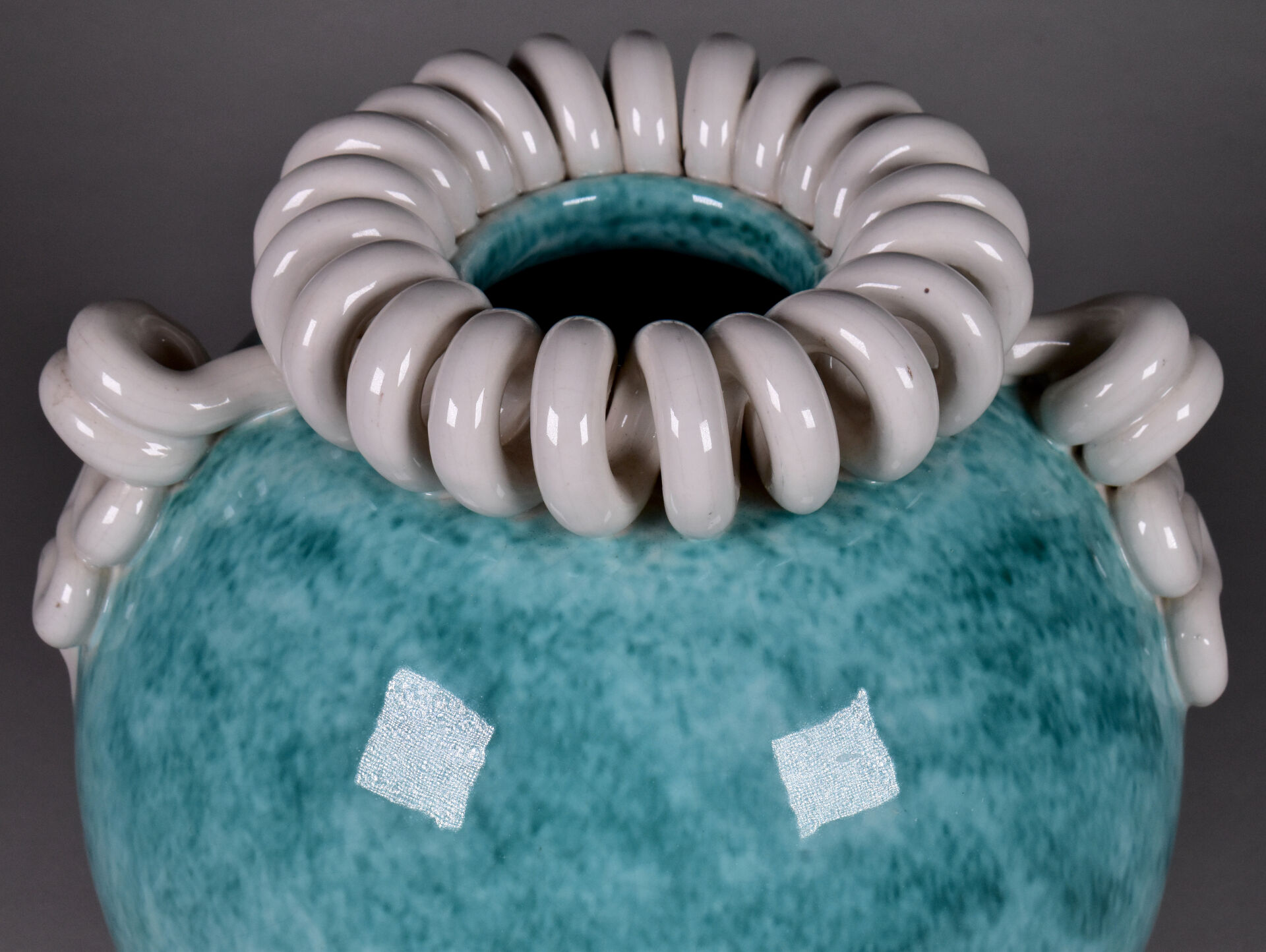 SAINTE RADEGONDE. Vase boule en céramique émaillée céladon les anses et le col formés de torsades en crème. Haut. : 25 cm.