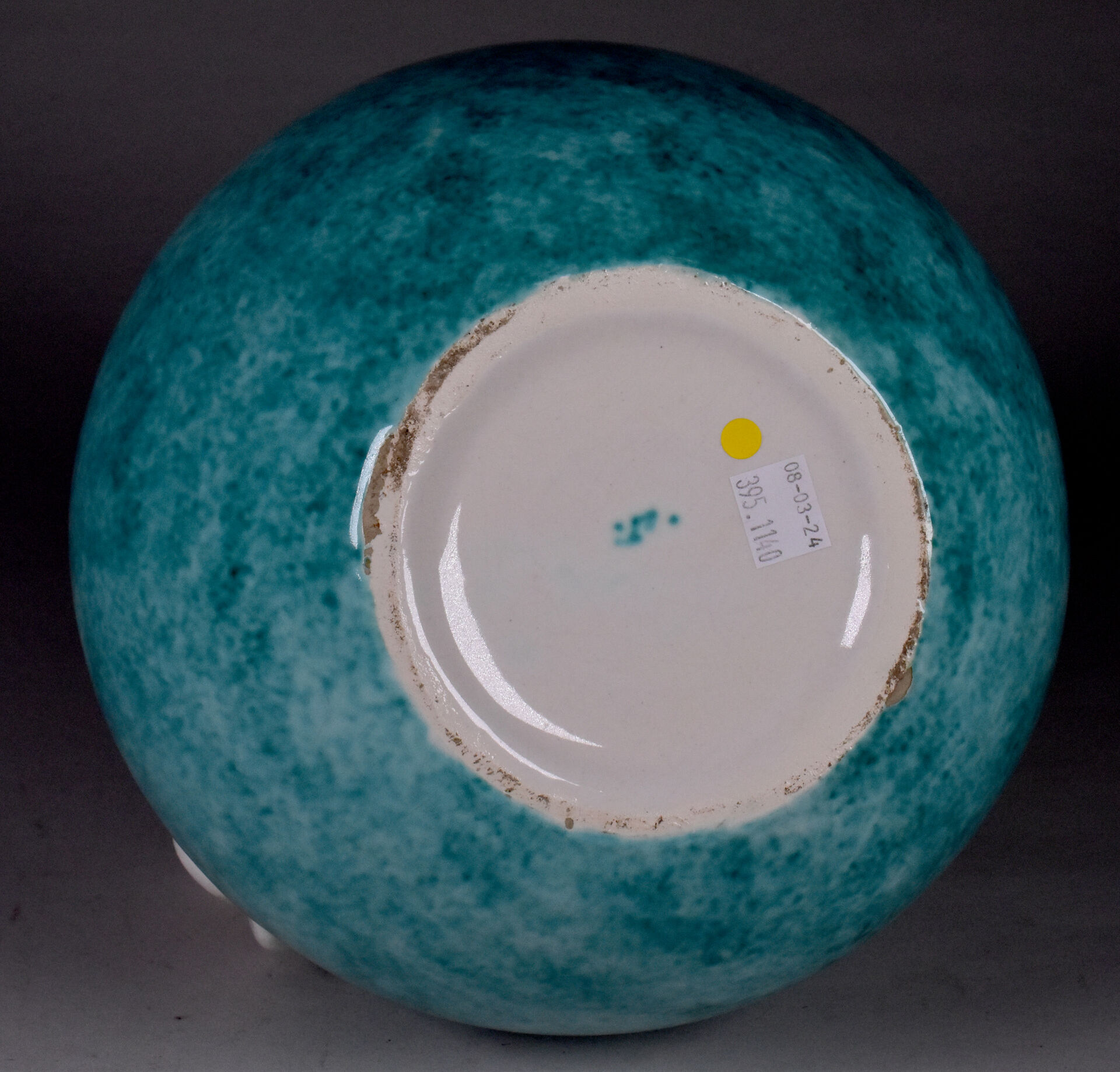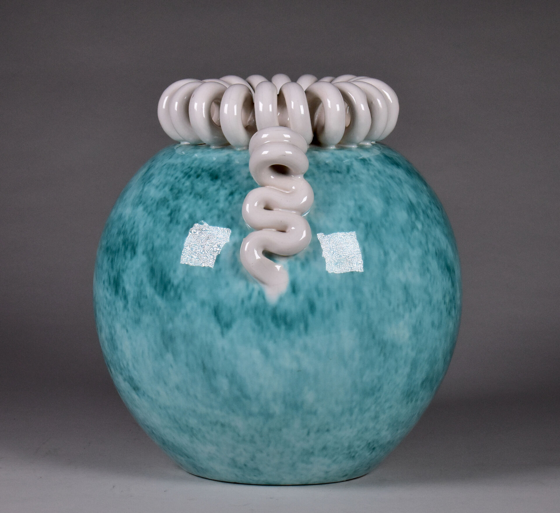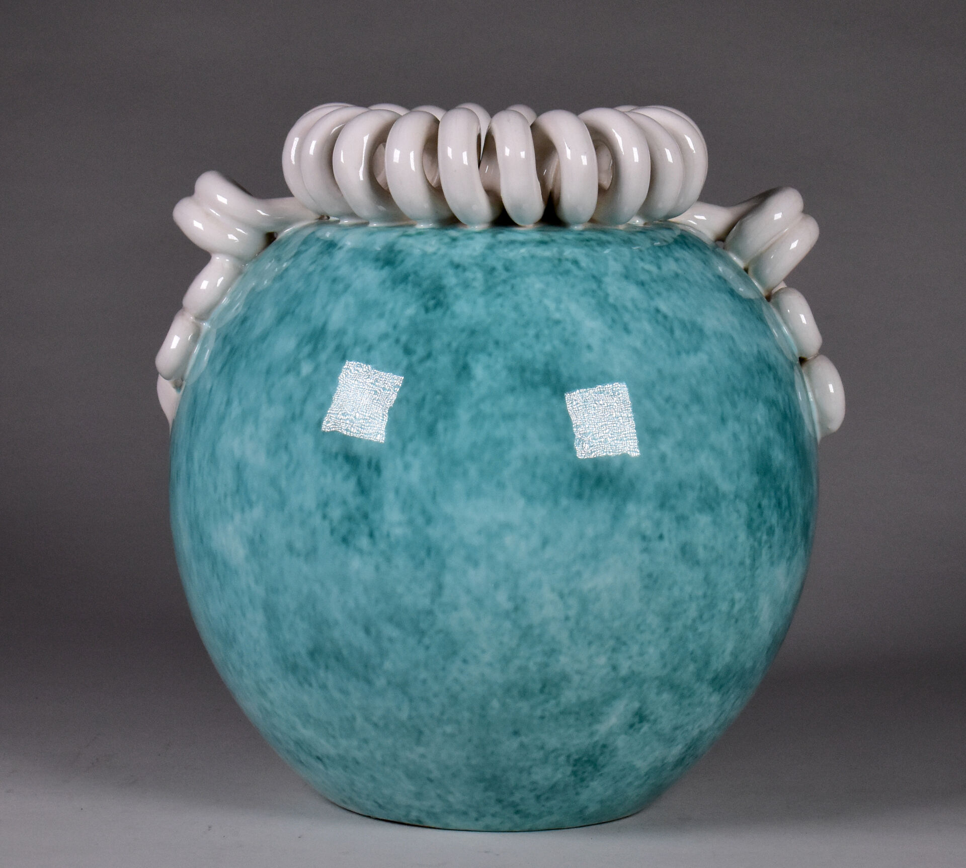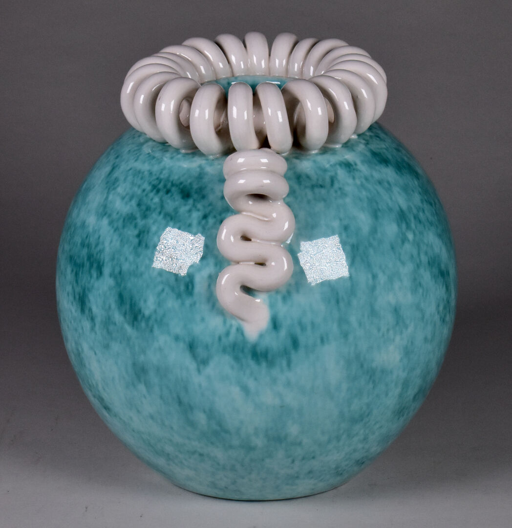 SAINTE RADEGONDE. Vase boule en céramique émaillée céladon les anses et le col formés de torsades en crème. Haut. : 25 cm.