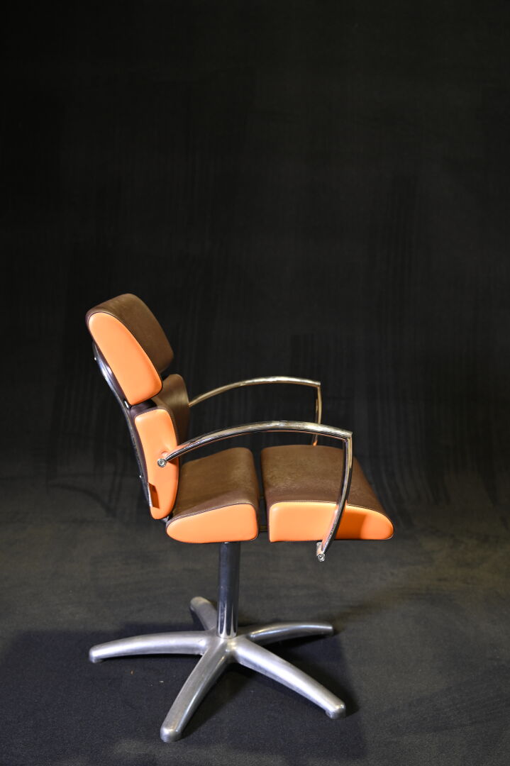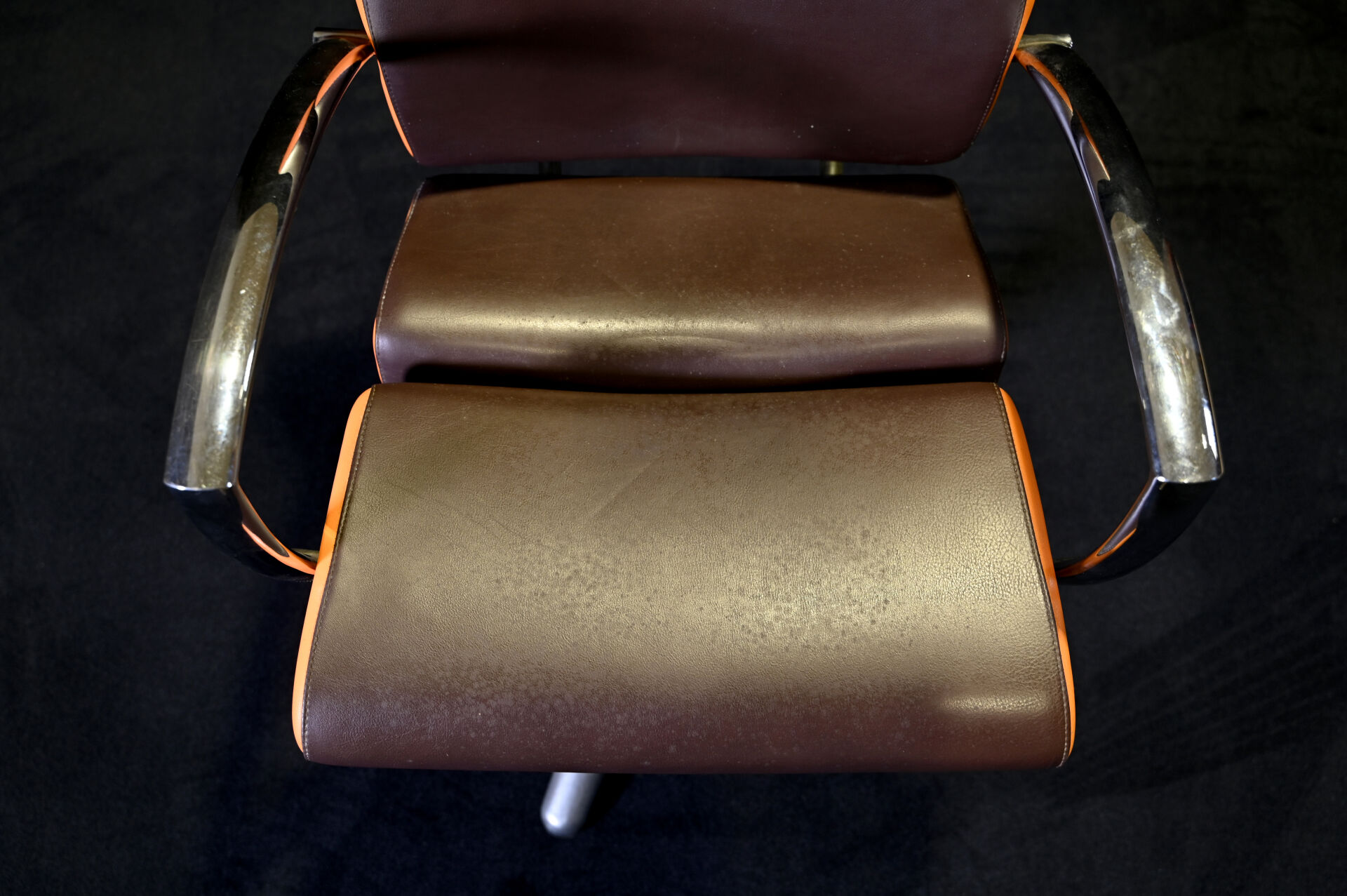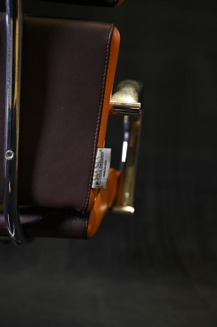 SALON AMBIANCE. Fauteuil de bureau en métal brossé et chromé à garniture de skaï orange et chocolat. Vers 1970. Haut. : 85 cm.