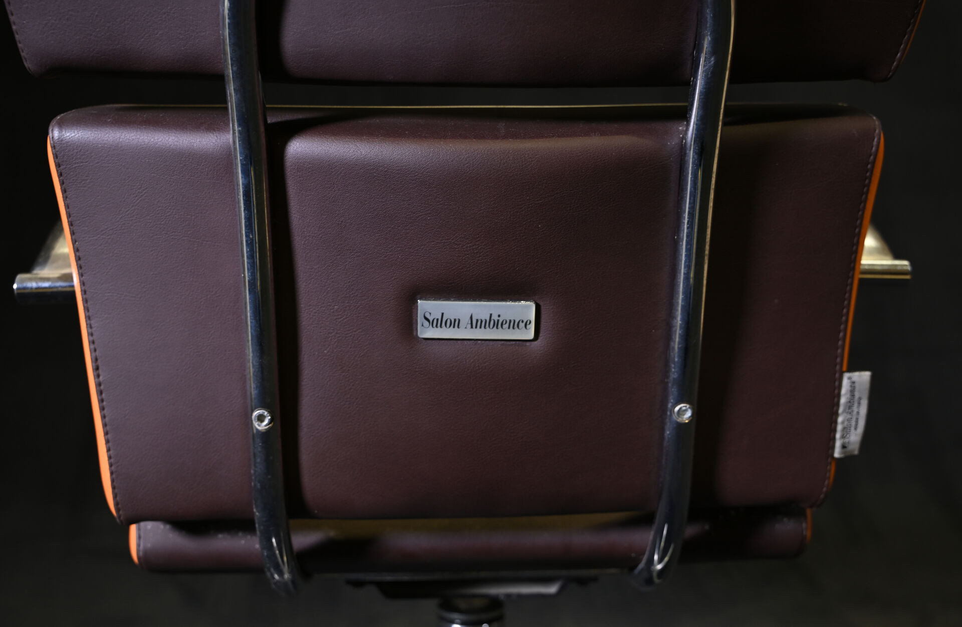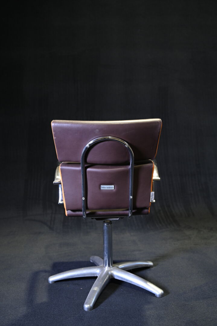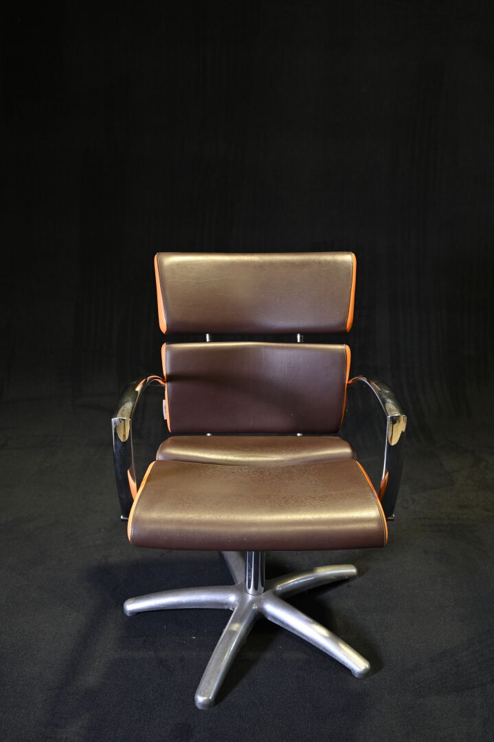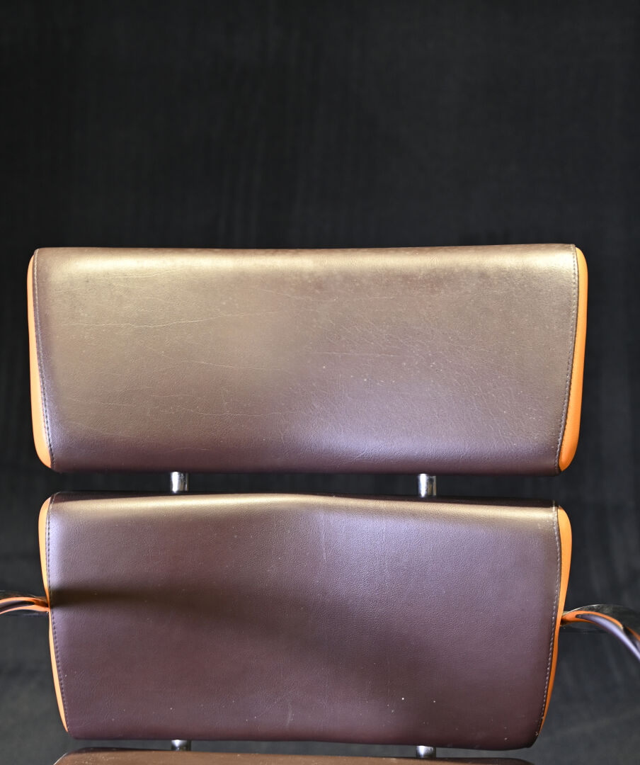 SALON AMBIANCE. Fauteuil de bureau en métal brossé et chromé à garniture de skaï orange et chocolat. Vers 1970. Haut. : 85 cm.