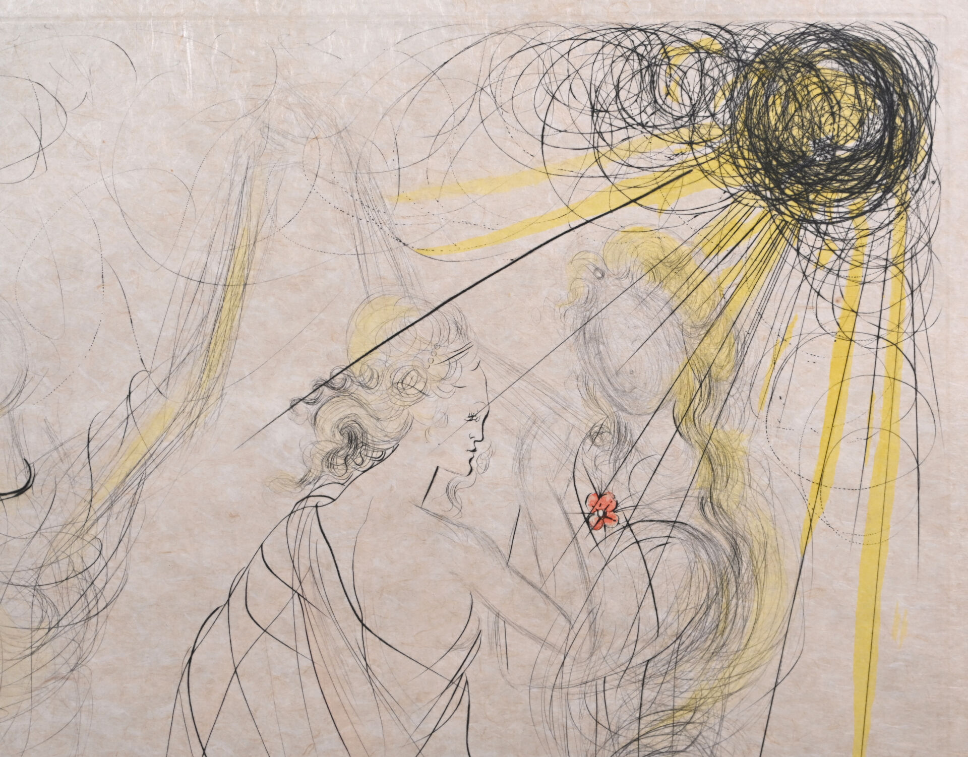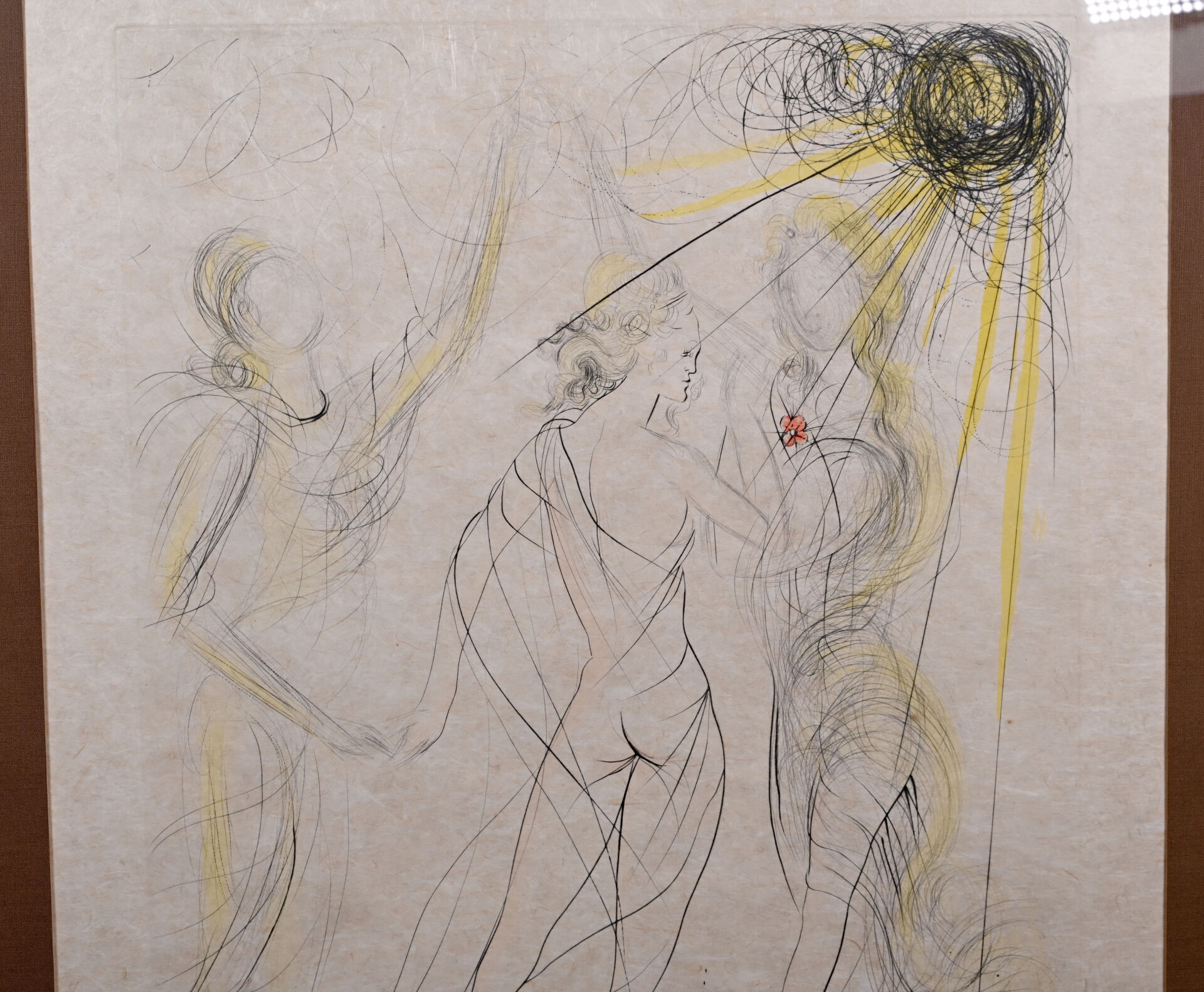 Salvador DALI (1904 – 1989). Le Printemps. Pointe sèche réhaussée en couleurs sur papier japon, signée en b&as à droite au crayon, numérotée 97/120 en bas à gauche. 68 x47 cm (à vue).