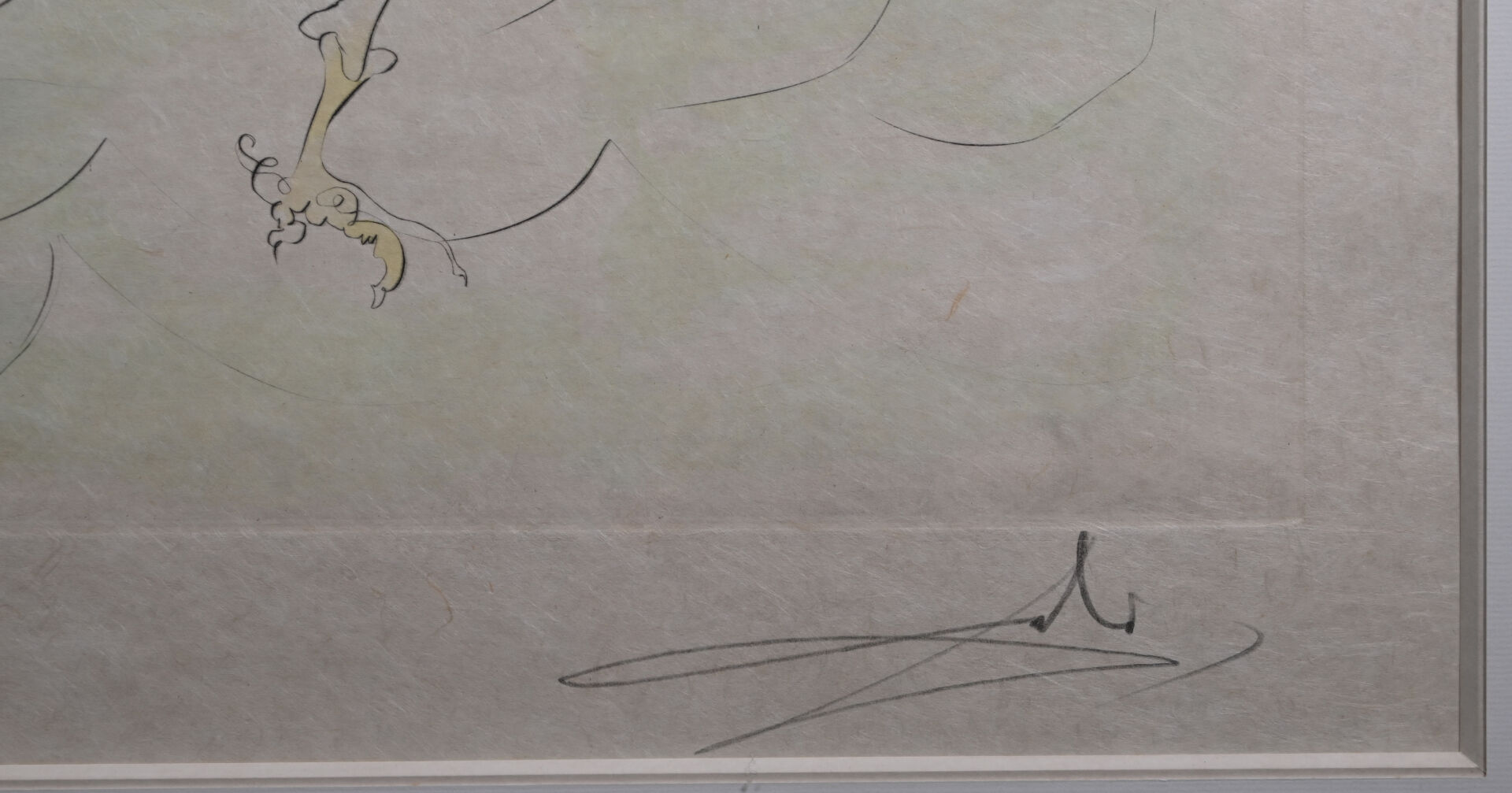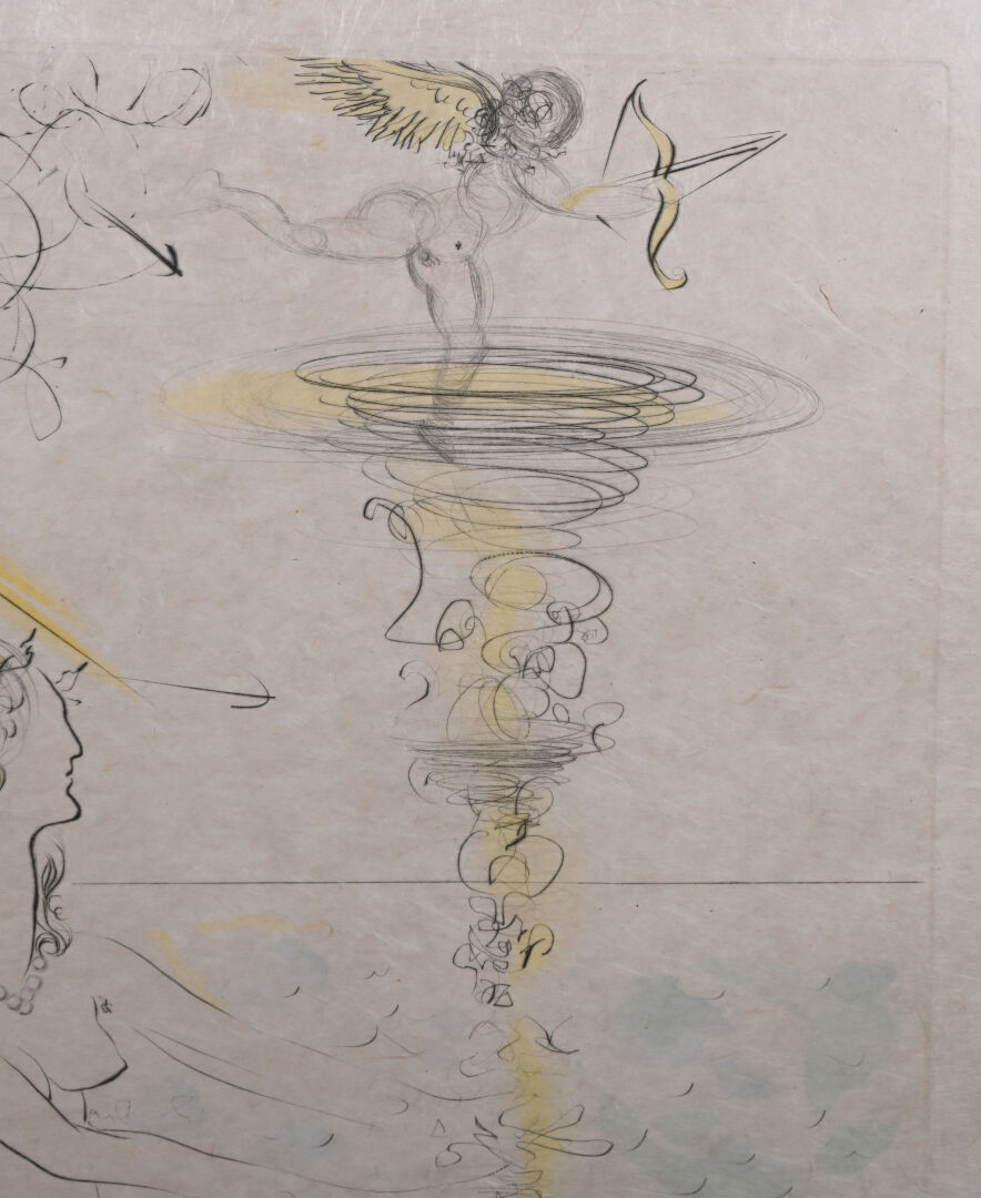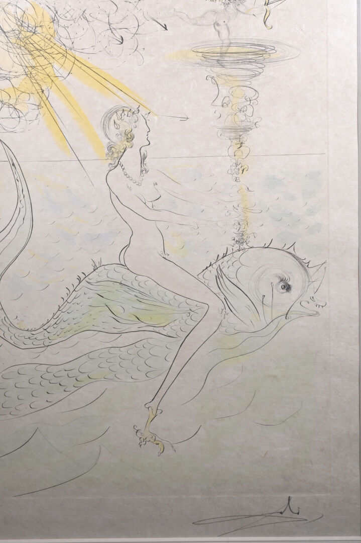 Salvador DALI (1904 – 1989). Sirène au Dauphin – 1971. Pointe sèche réhaussée en couleurs sur papier japon signée en bas à droite au crayon. Numérotée 20/120 en bas à gauche. 66,5×47 cm (à vue).