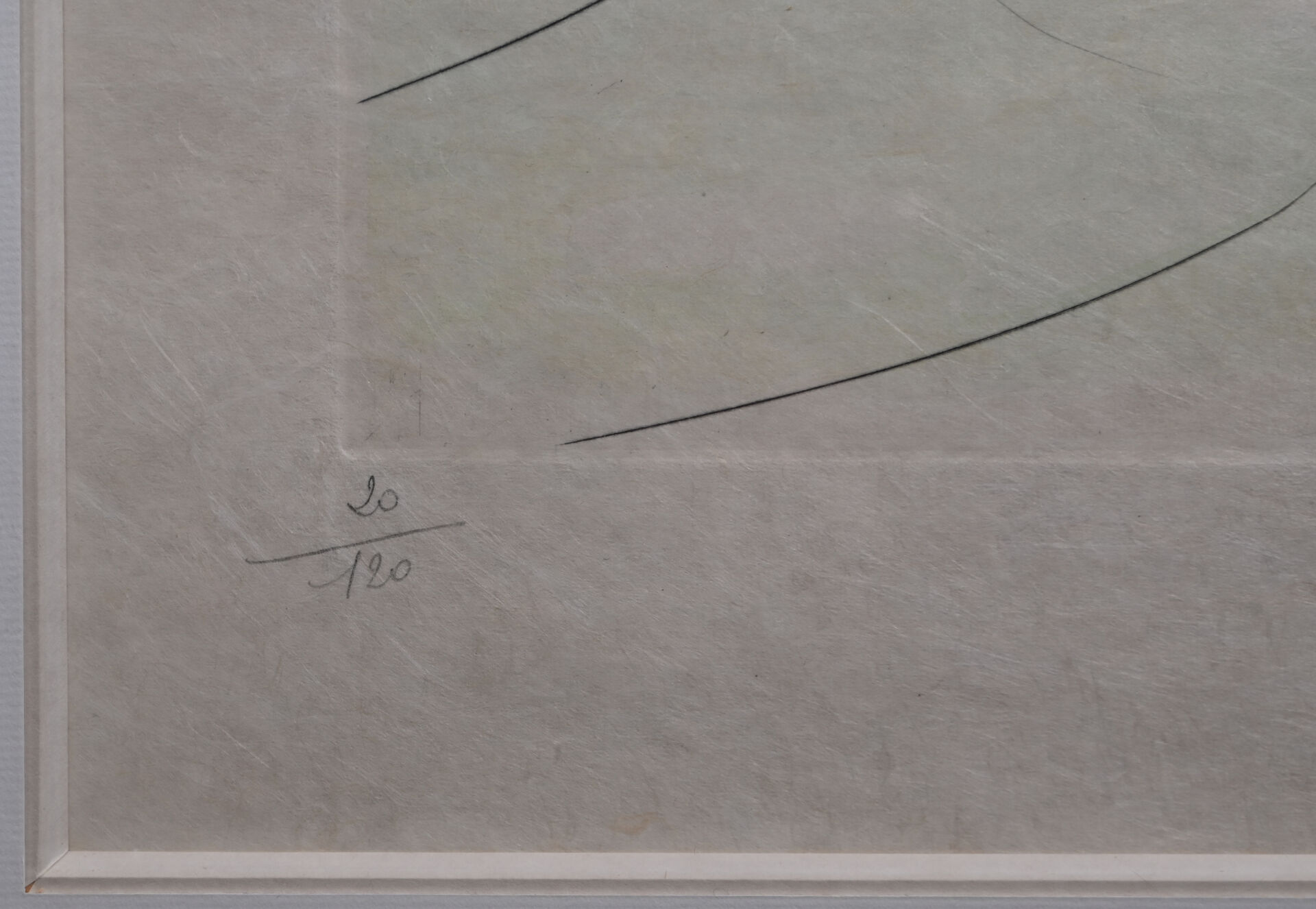 Pointe sèche réhaussée en couleurs sur papier japon signée en bas à droite au crayon. Numérotée 20/120 en bas à gauche.
