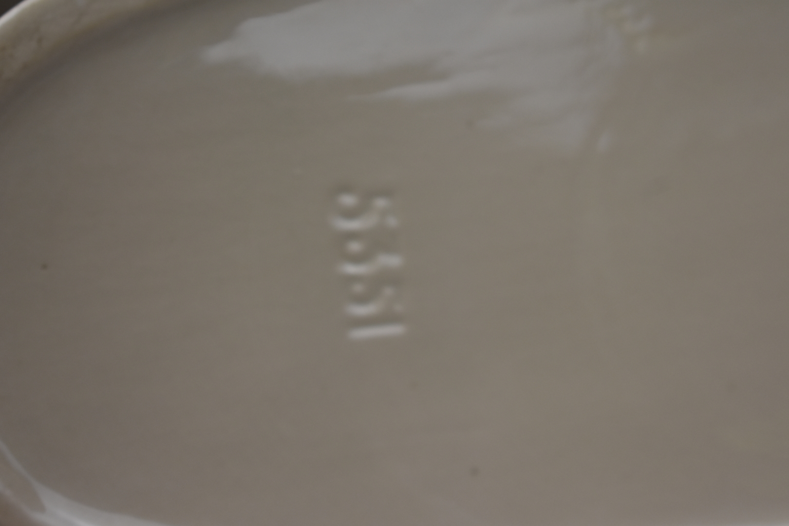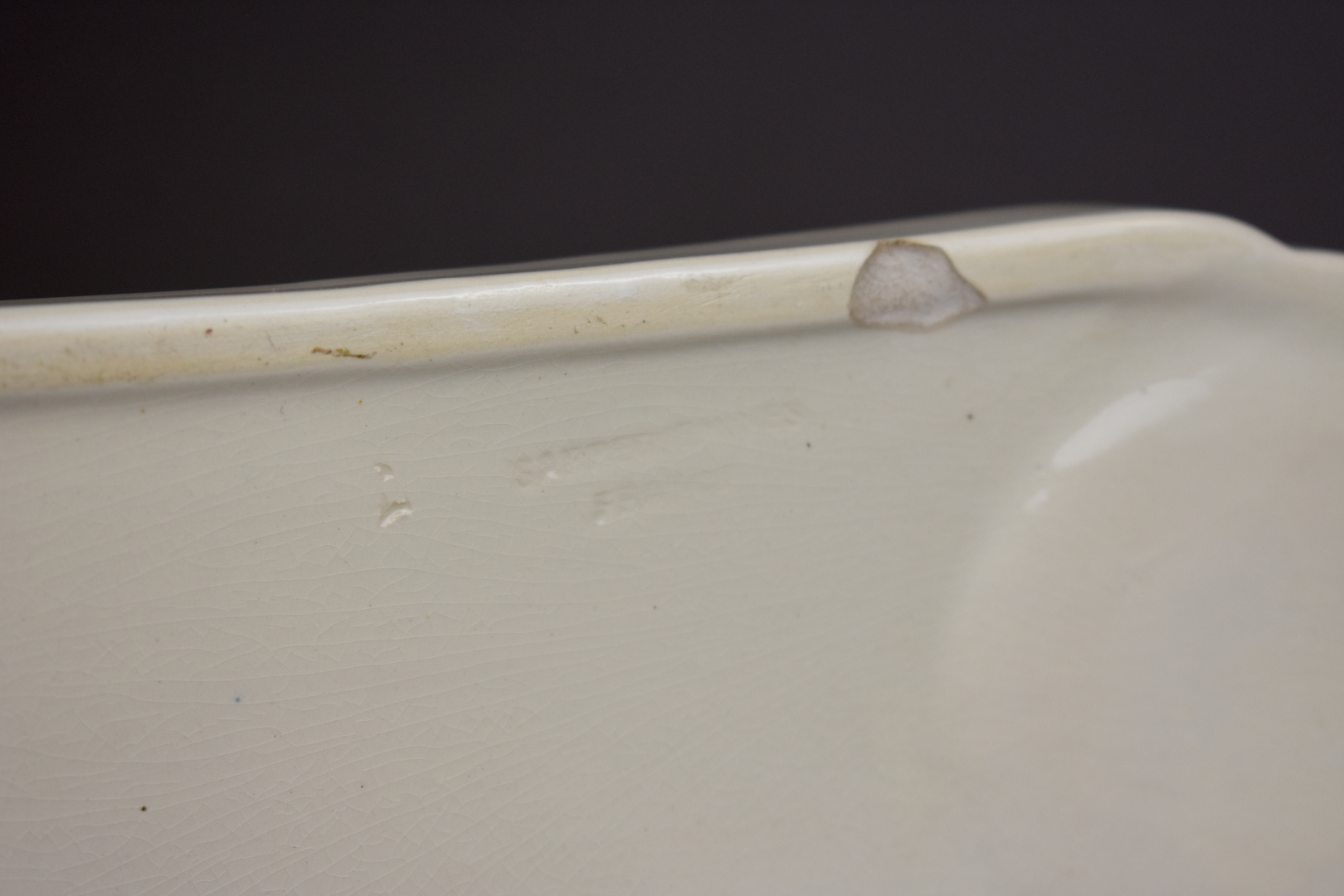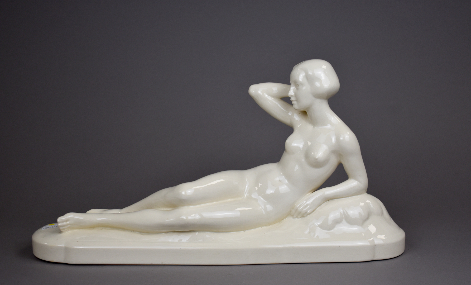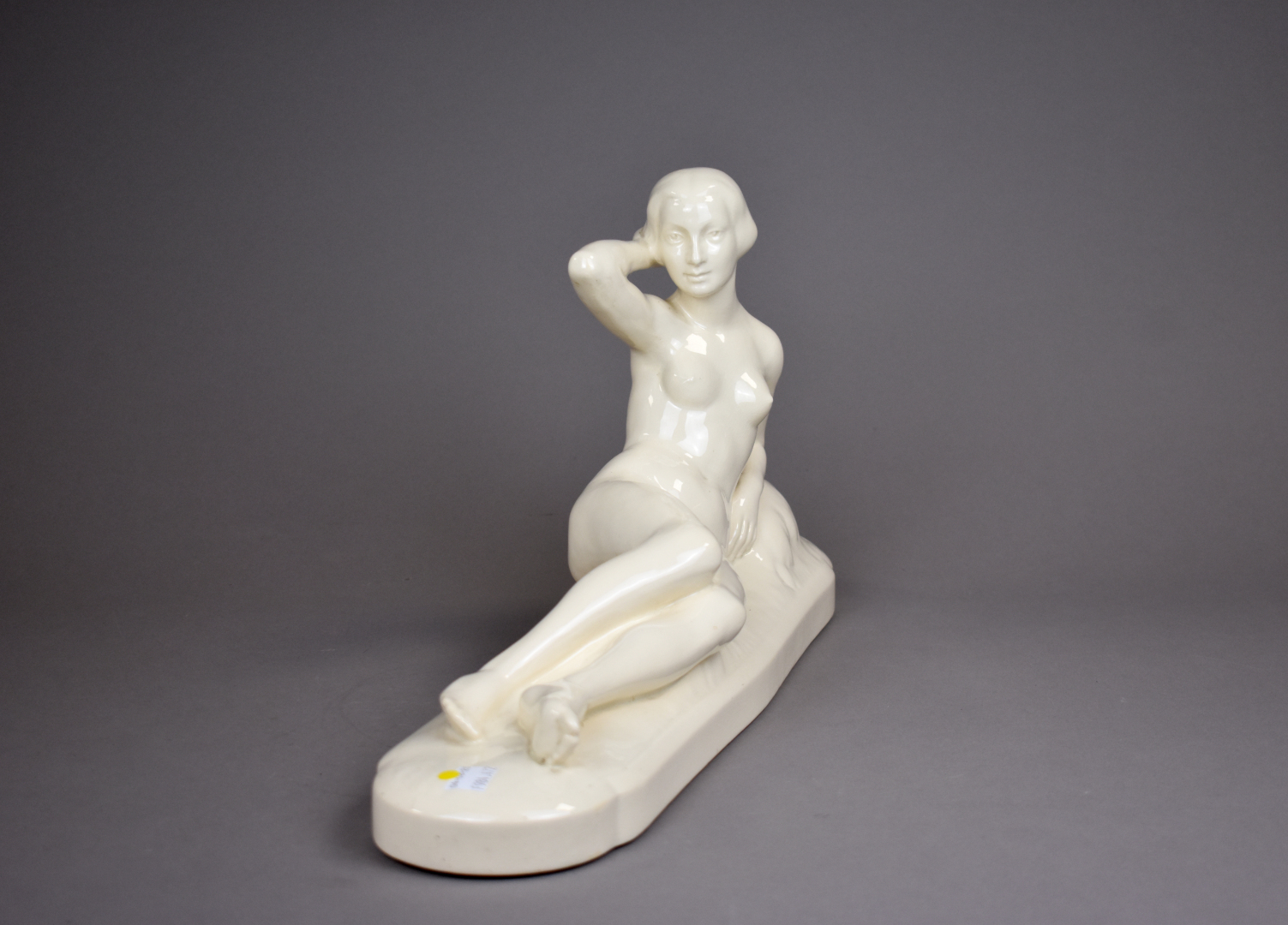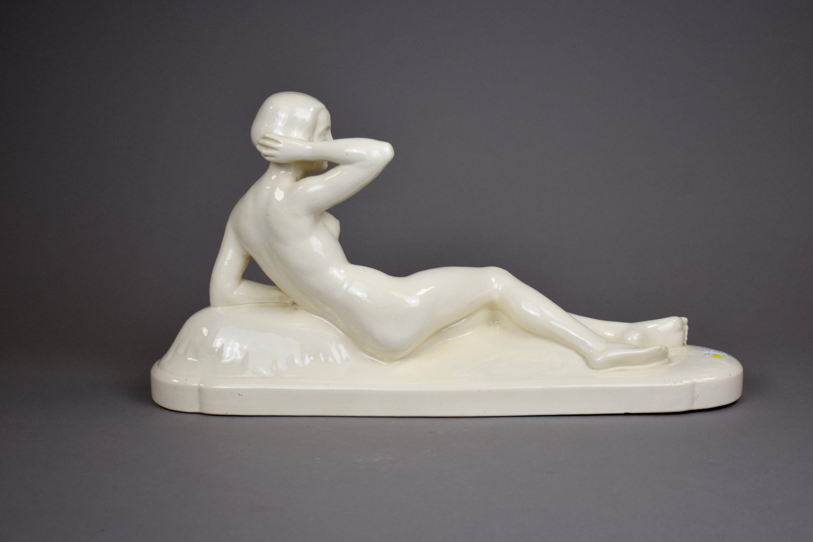 SARREGUEMINES. Garçonne allongée en faïence émaillée crème craquelée (éclat sous la base, légers frottements) (marquée). Haut. : 24 cm – Larg. : 47 cm.