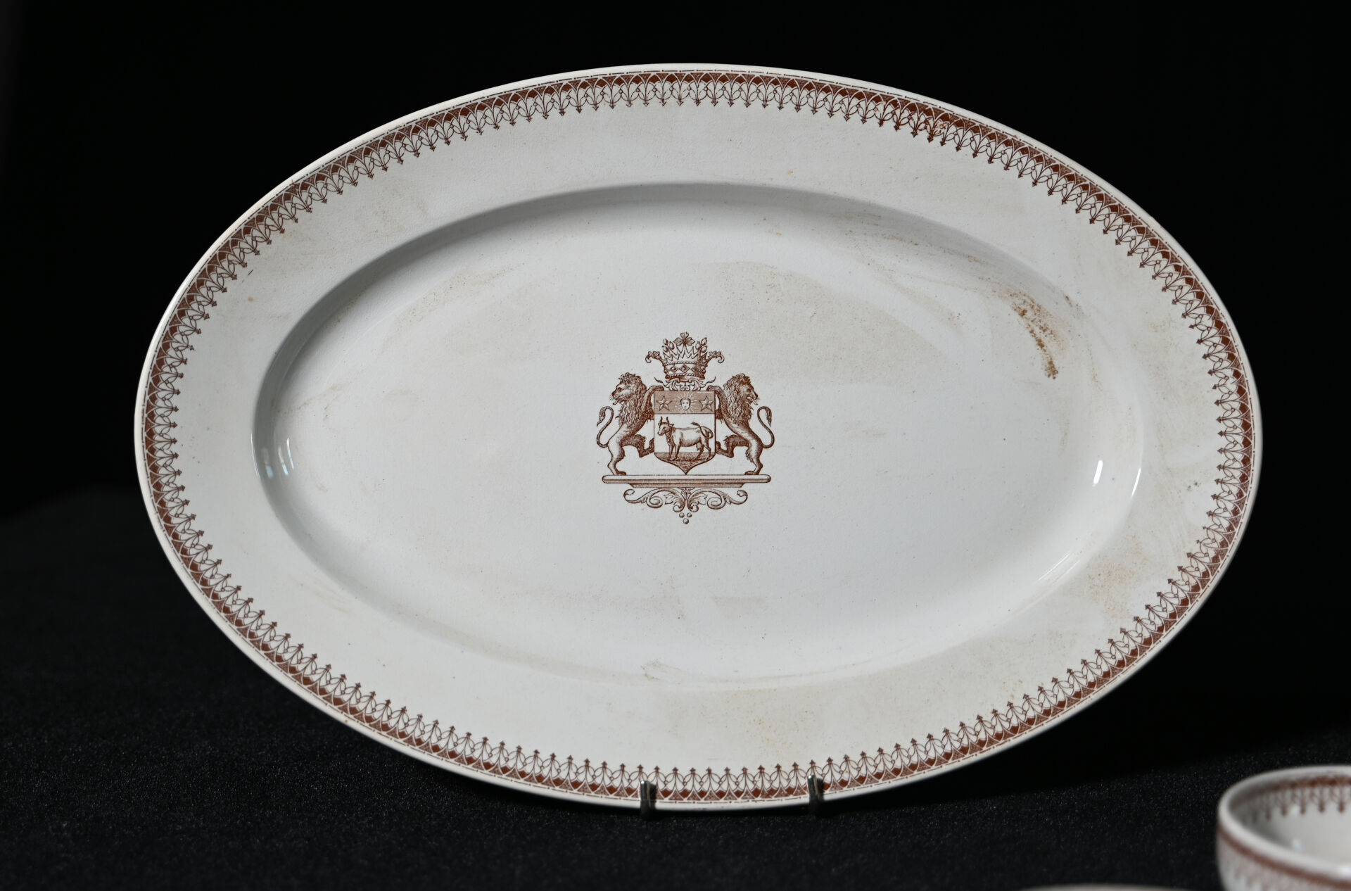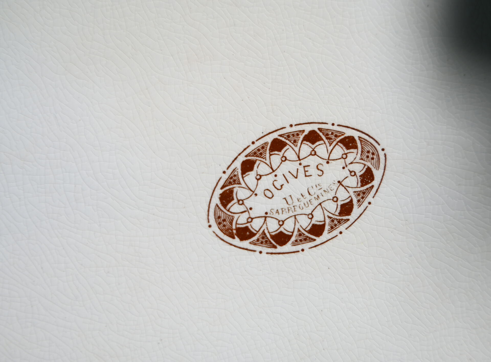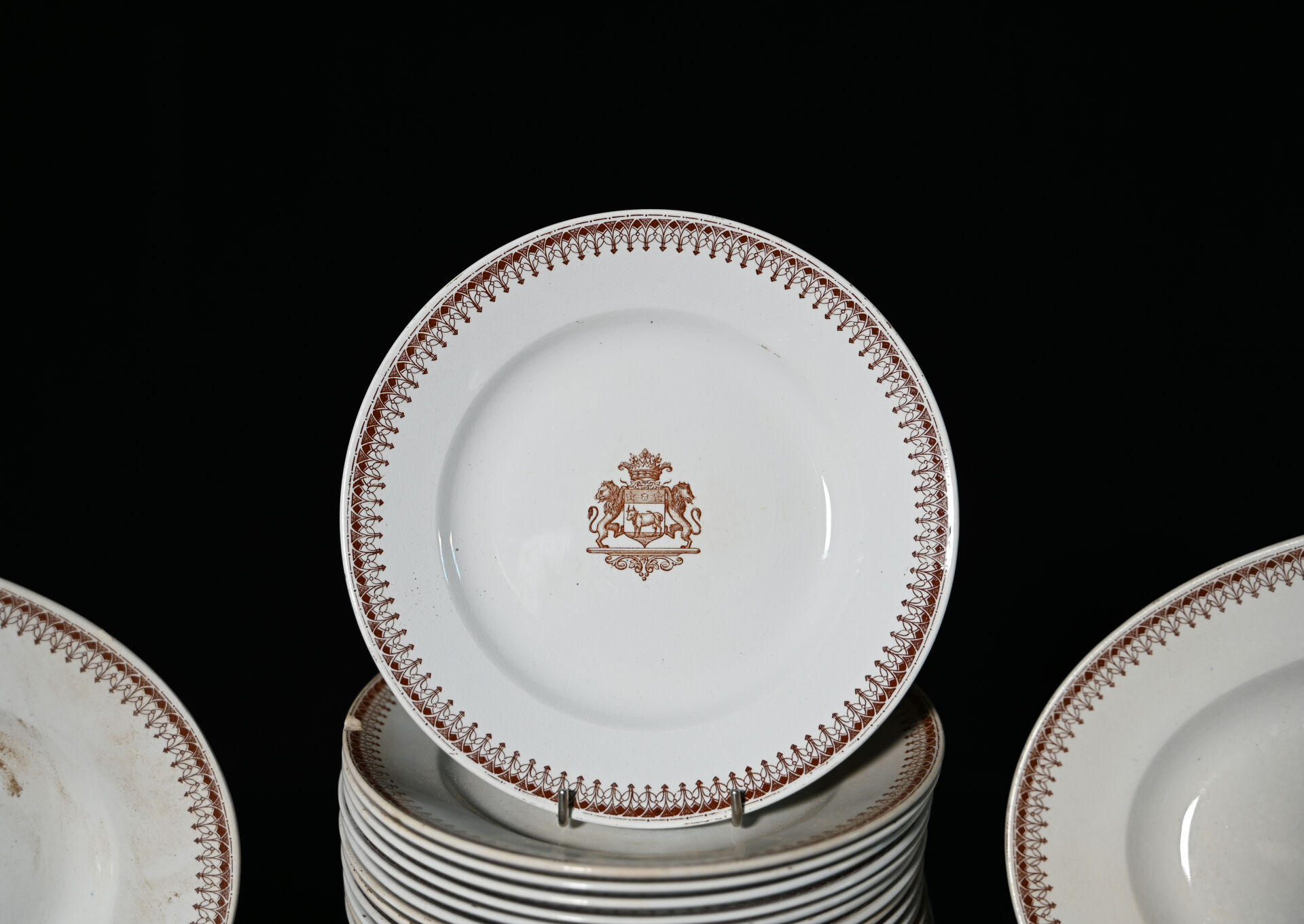 SARREGUEMINES. Partie de service de table en faïence modèle « Ogives » à décor centré d’un blason au boeuf entre deux lions, sous une couronne de marquis, comprenant 26 assiettes à entremets, 2 plats de service, 3 tasses à thé et 2 tasses à café (usures et éclats). Marqué au dessous. Armoiries identifiées : Famille SAINT MARTIN (Toulouse).