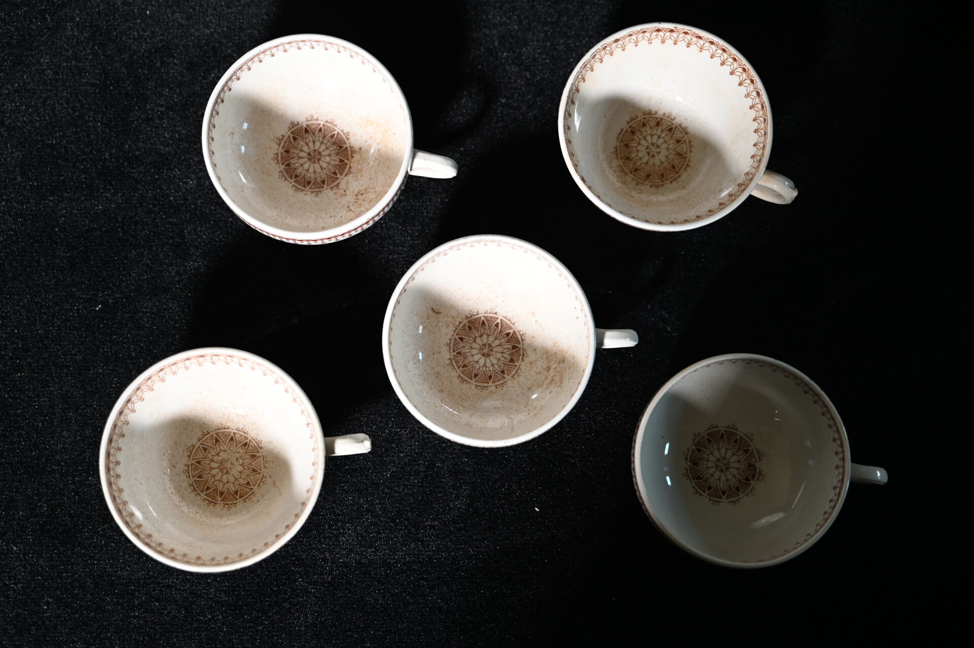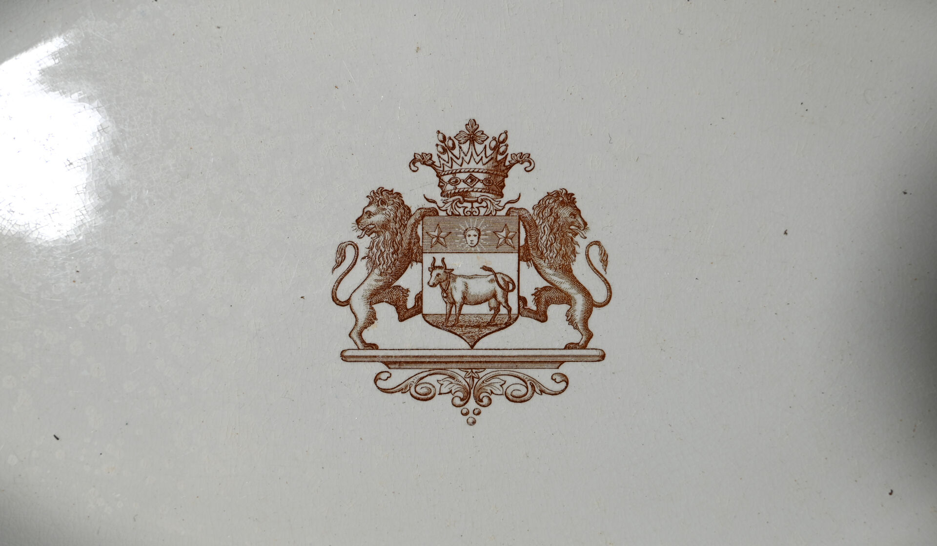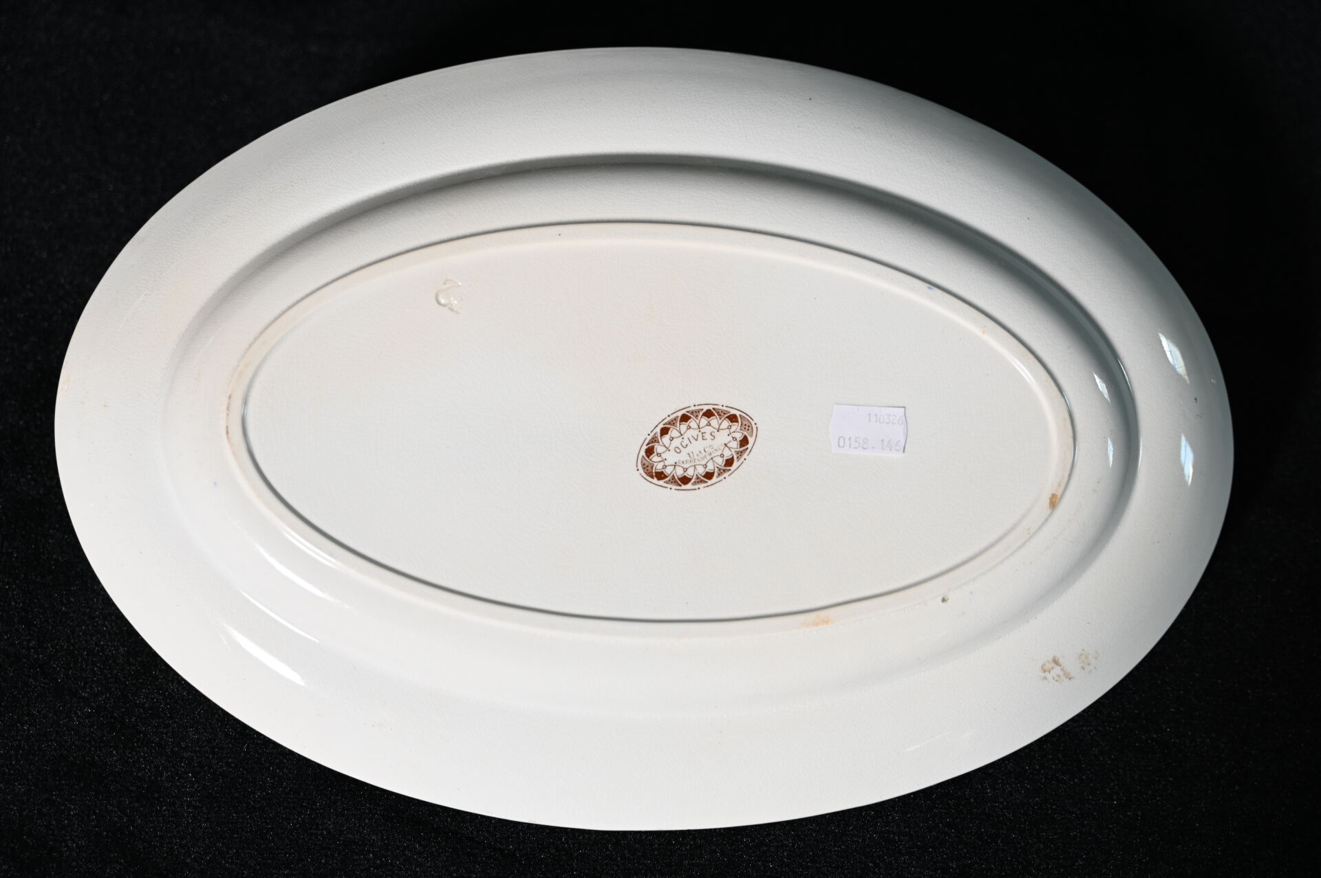 SARREGUEMINES. Partie de service de table en faïence modèle « Ogives » à décor centré d’un blason au boeuf entre deux lions, sous une couronne de marquis, comprenant 26 assiettes à entremets, 2 plats de service, 3 tasses à thé et 2 tasses à café (usures et éclats). Marqué au dessous. Armoiries identifiées : Famille SAINT MARTIN (Toulouse).