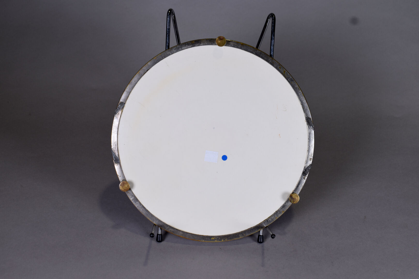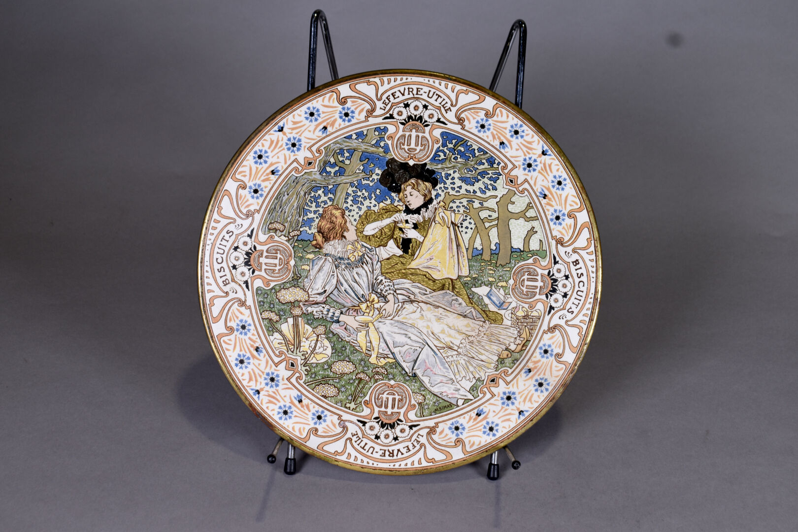 SARREGUEMINES pour LEFEVRE- UTILE. Plat à gâteau ou dessous de plat circulaire en faïence à décor de deux élégantes trempant un biscuit dans du champagne, d’après Martial Simas (1862-1939), pour les biscuits LU (une restauration non visible à l’oeil nu). Diam. : 31 cm.