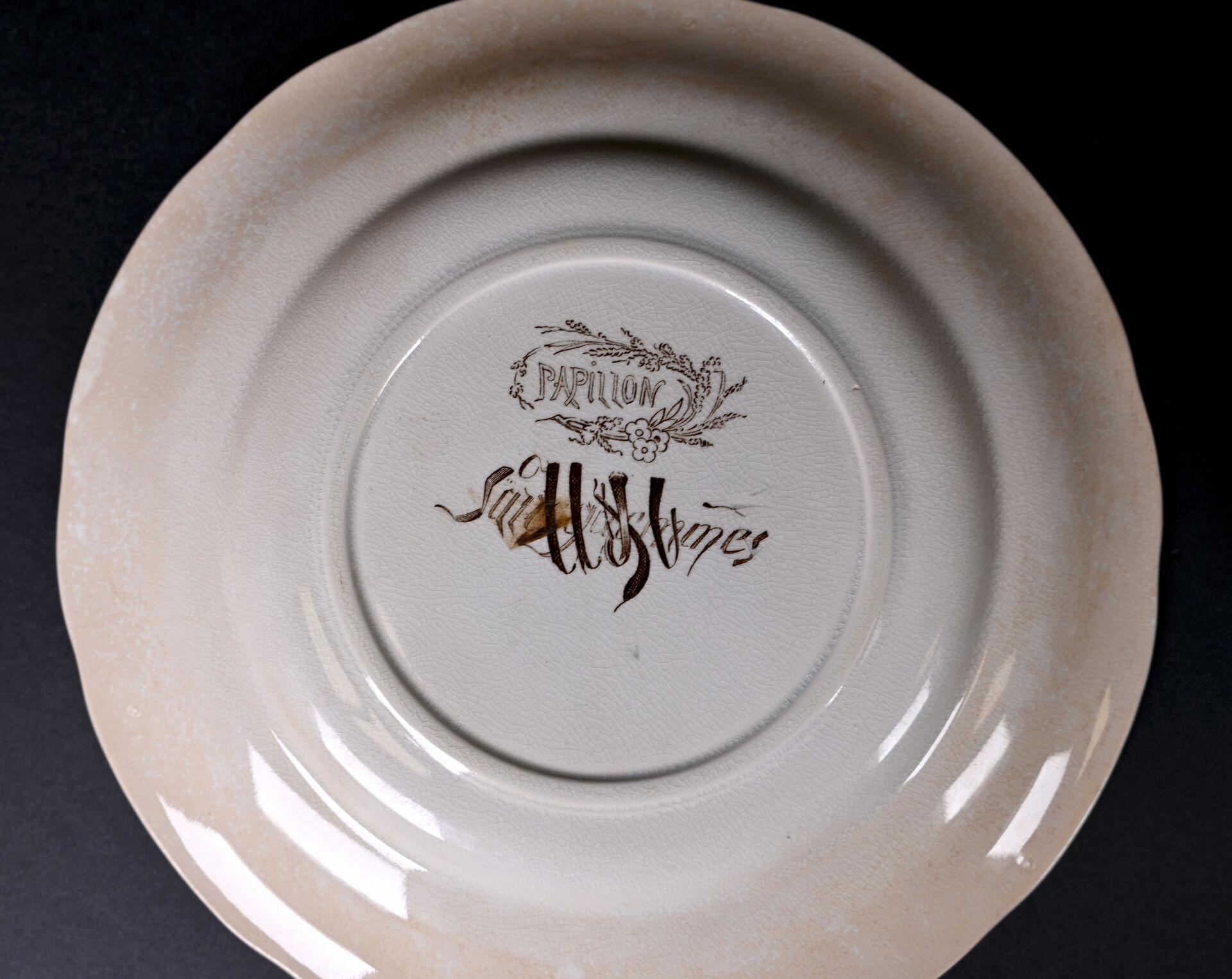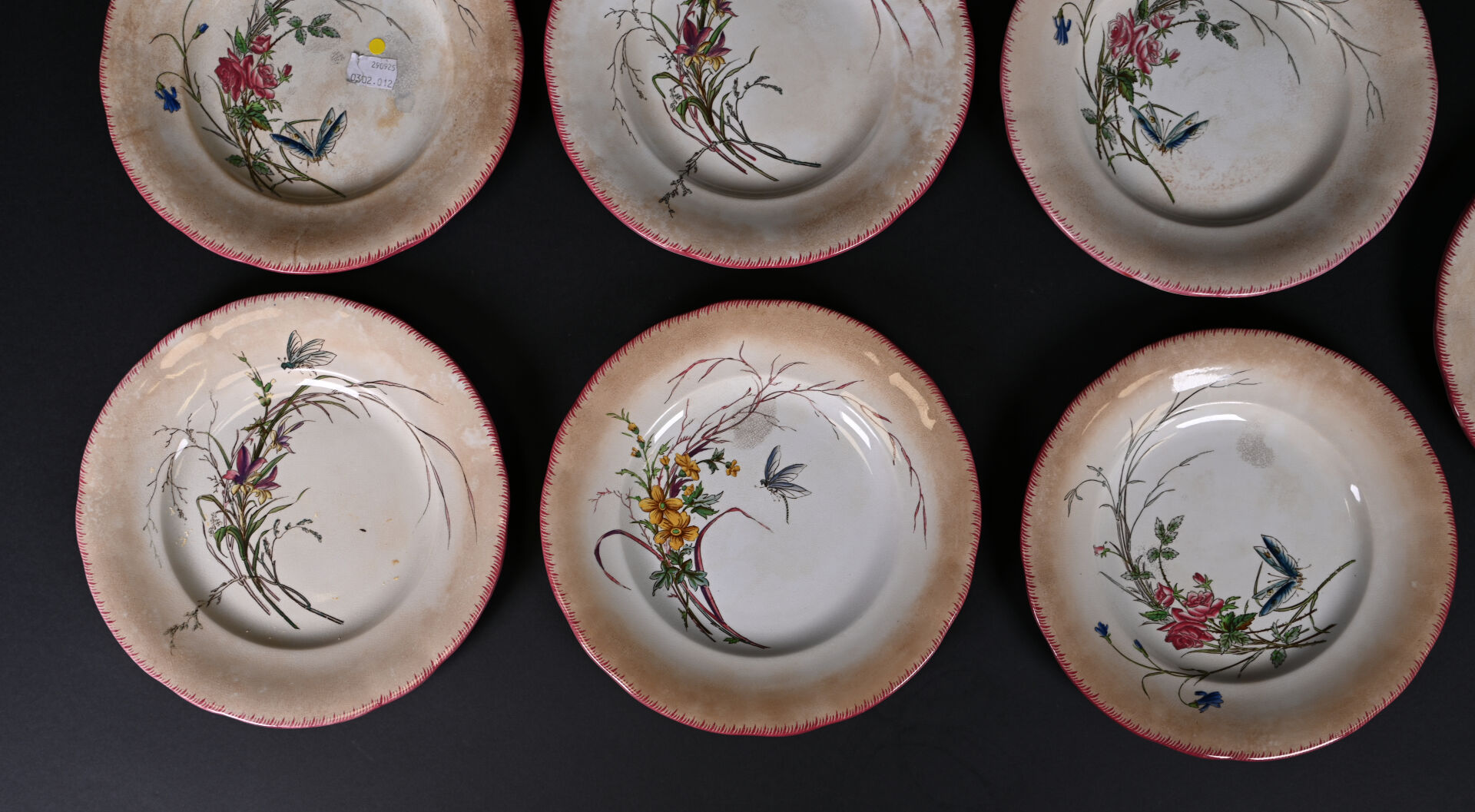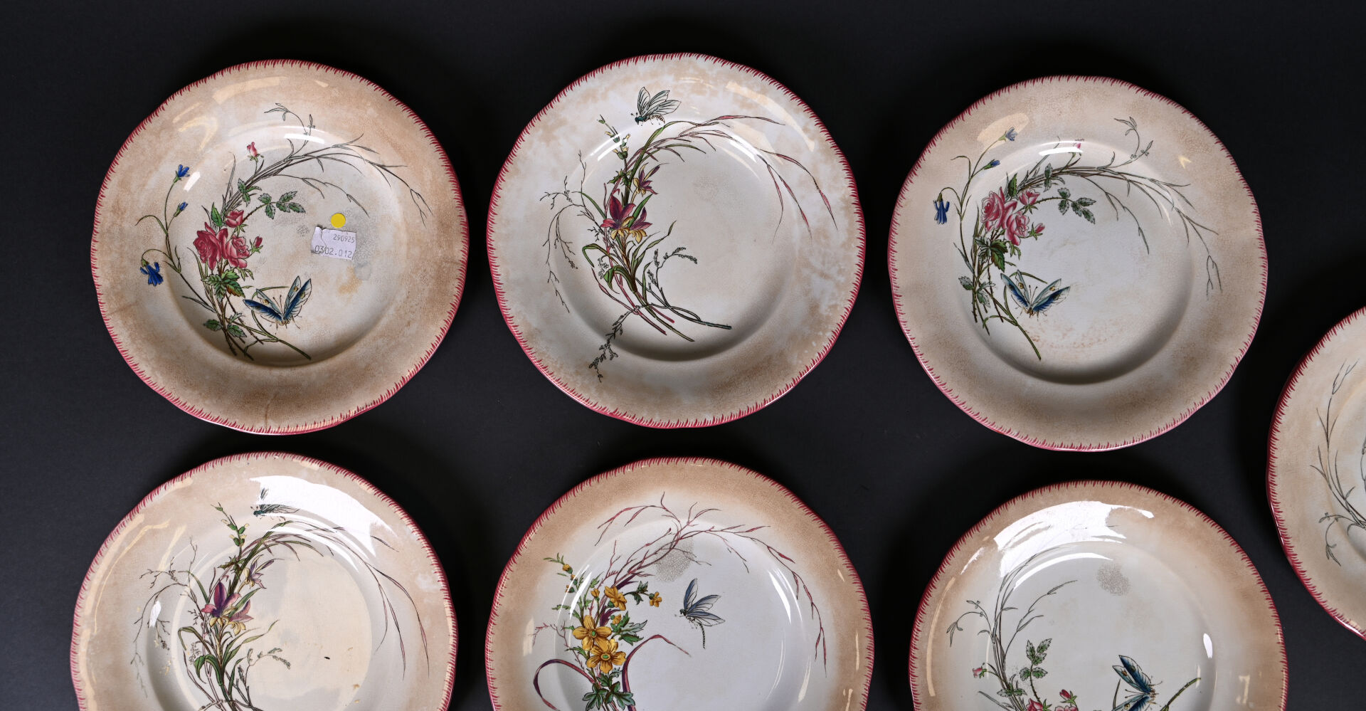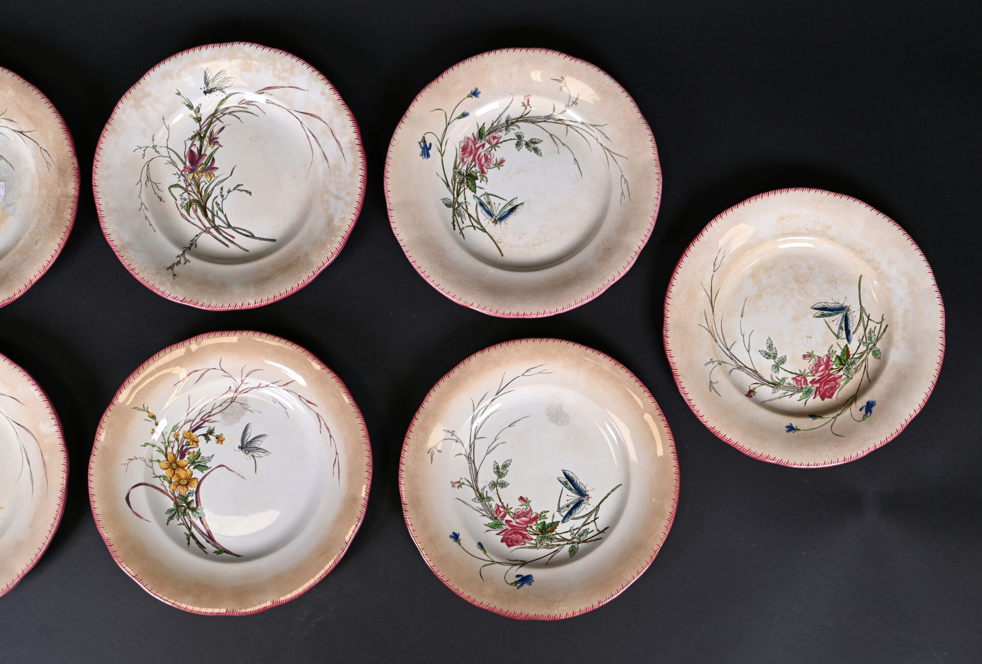 SARREGUEMINES. Suite de 7 assiettes en faïence modèle papillon (quelques usures). Marquées. Diam. : 21,5 cm.