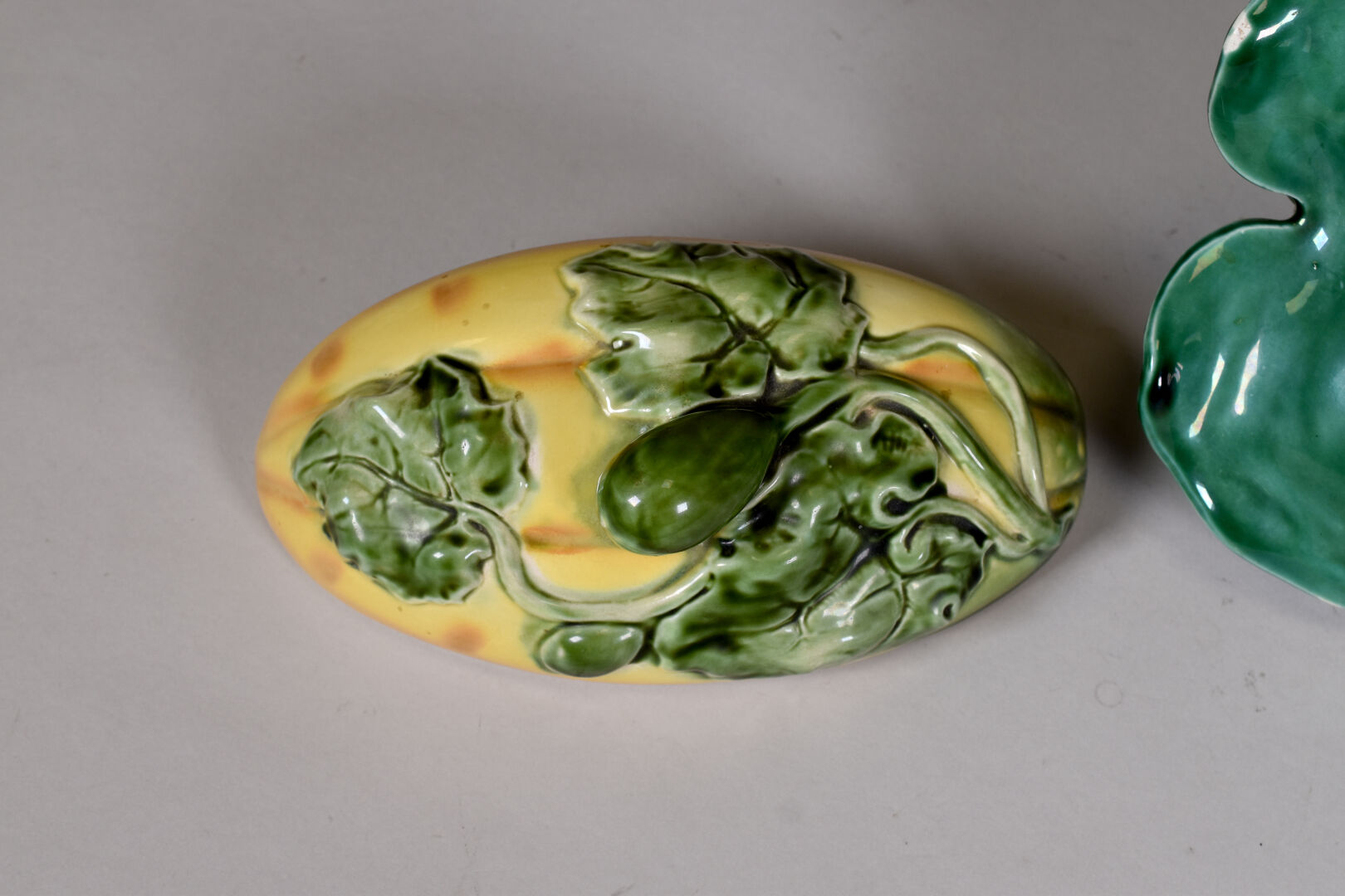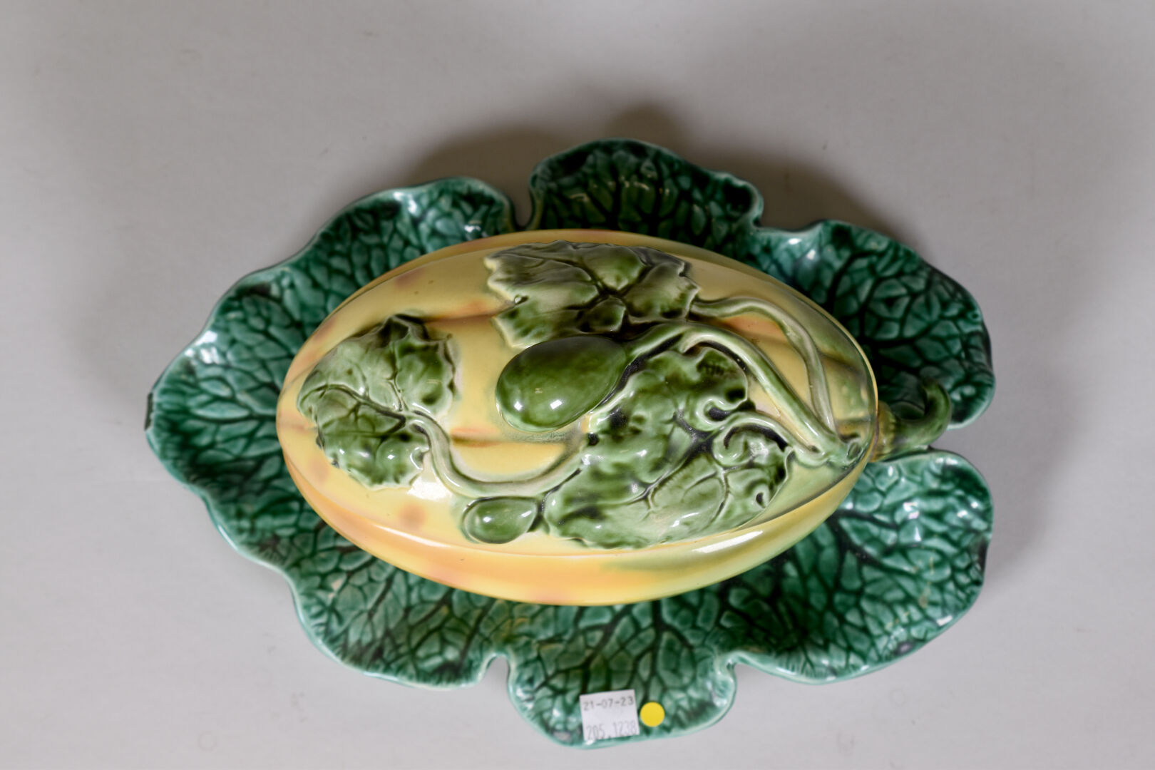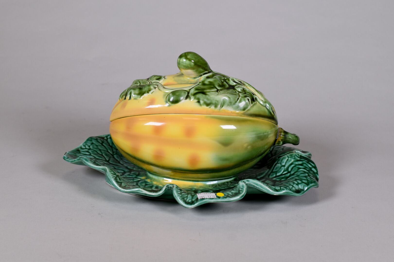 SARREGUEMINES. Terrine en barbotine en forme de melon d’eau (un éclat). Marquée au dessous. Haut. : 16 cm.